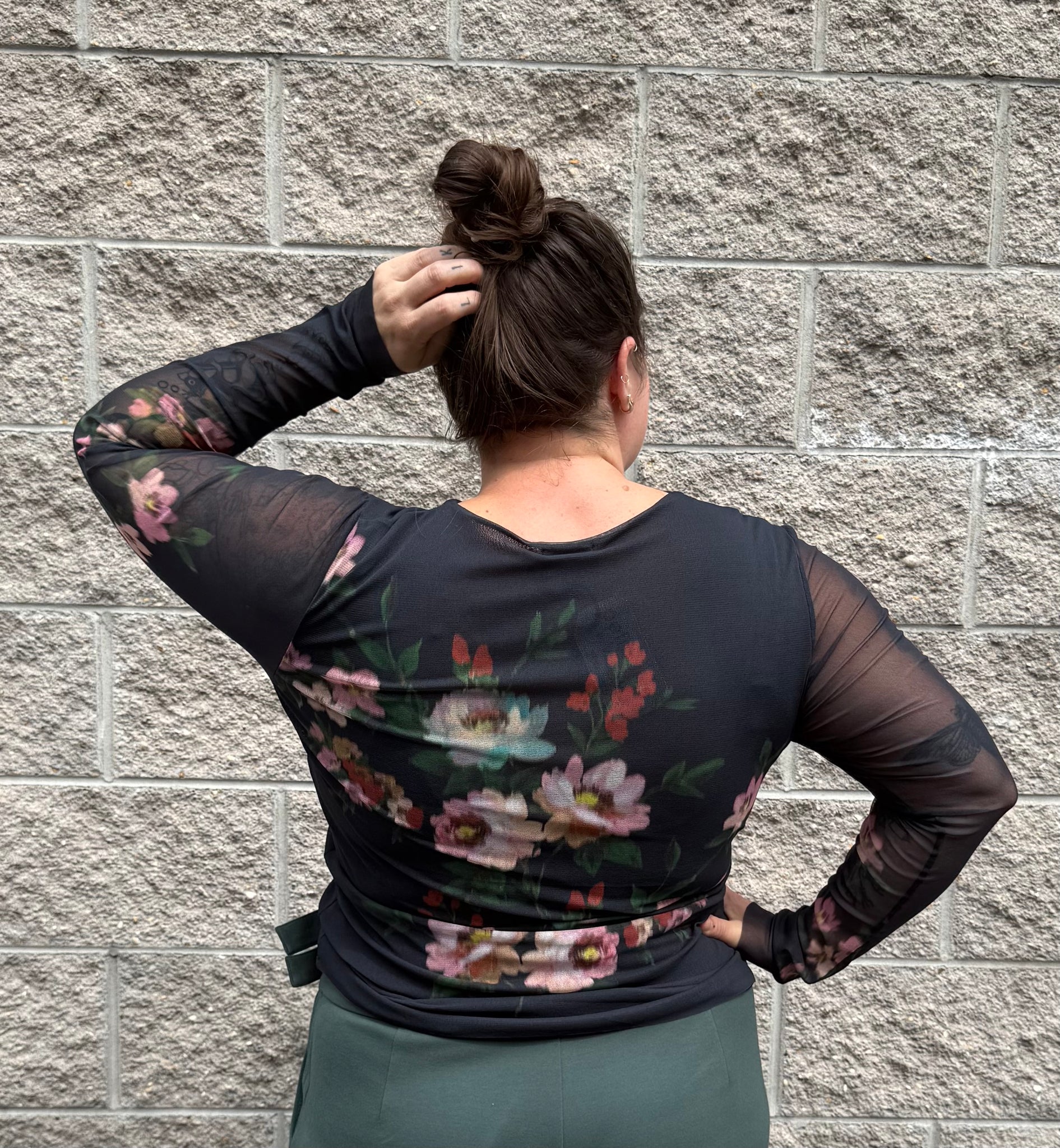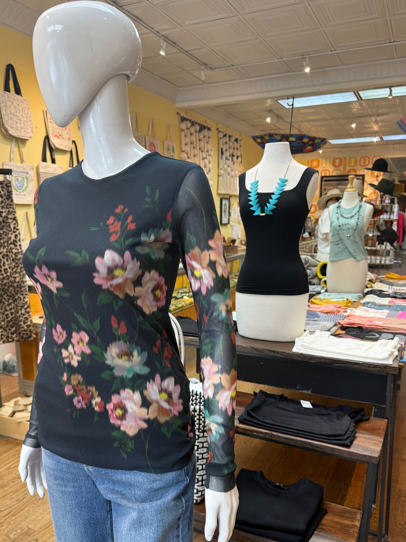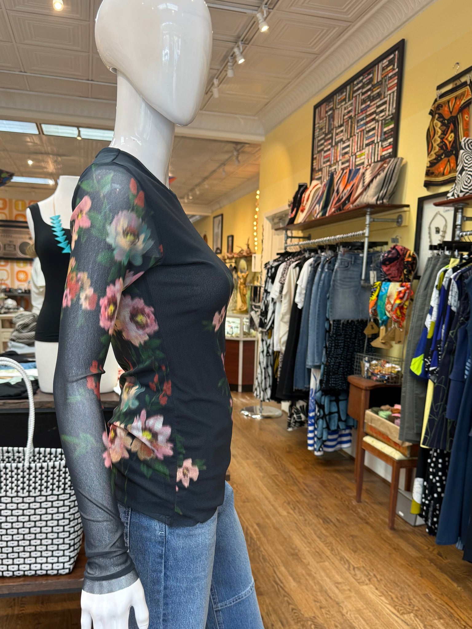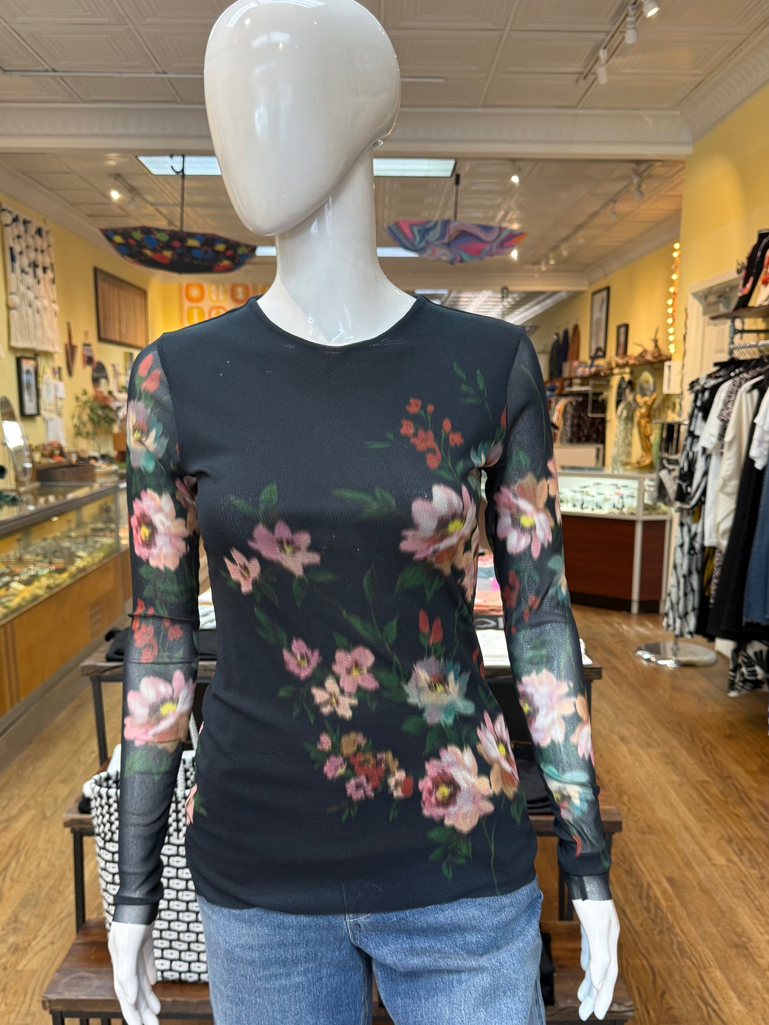 Long sleeved black nylon top with a pretty botanical print. Love this one with any black bottom. The body is lined but the sleeves are sheer. Very cute fitted look and very comfortable too.