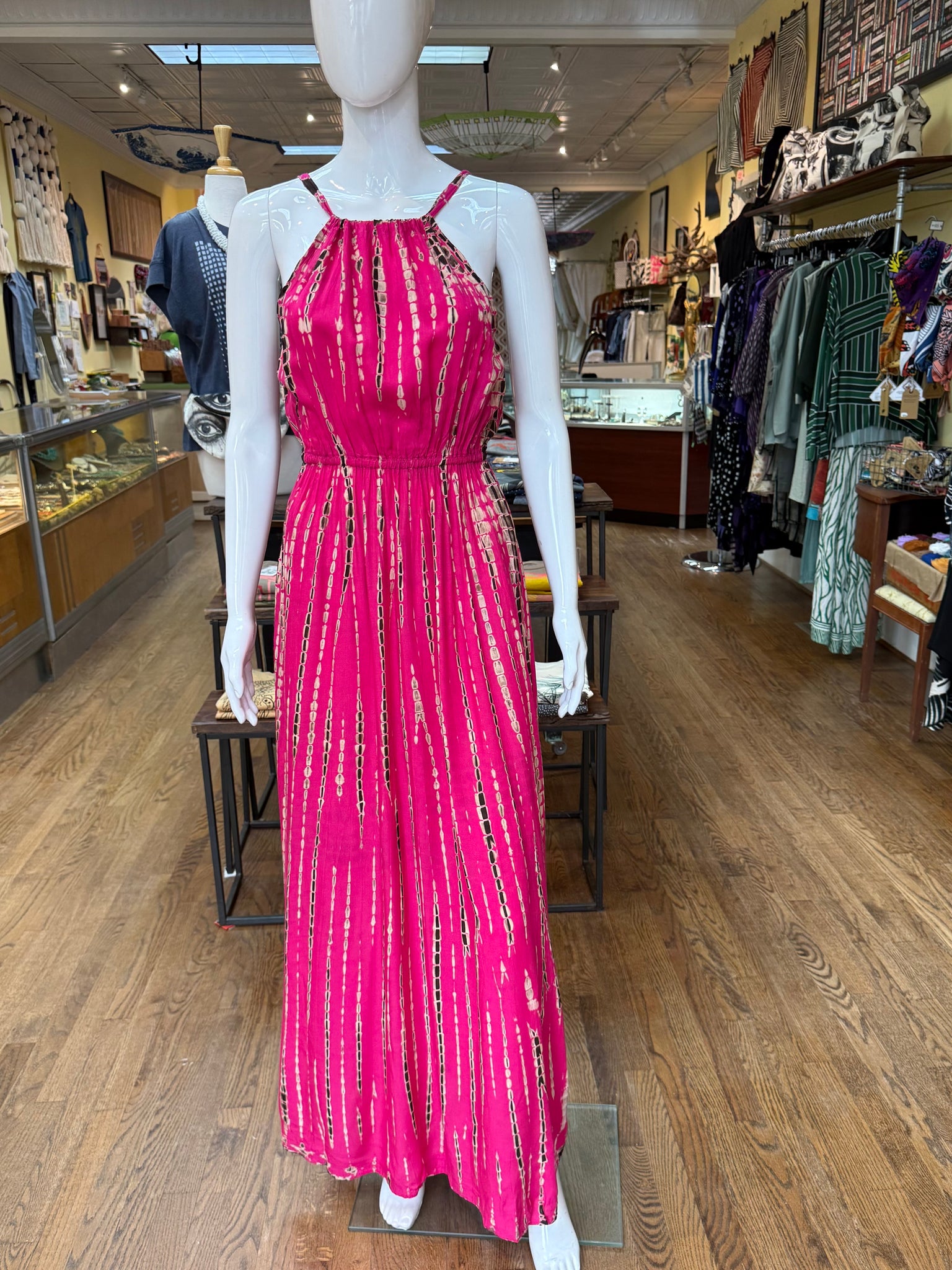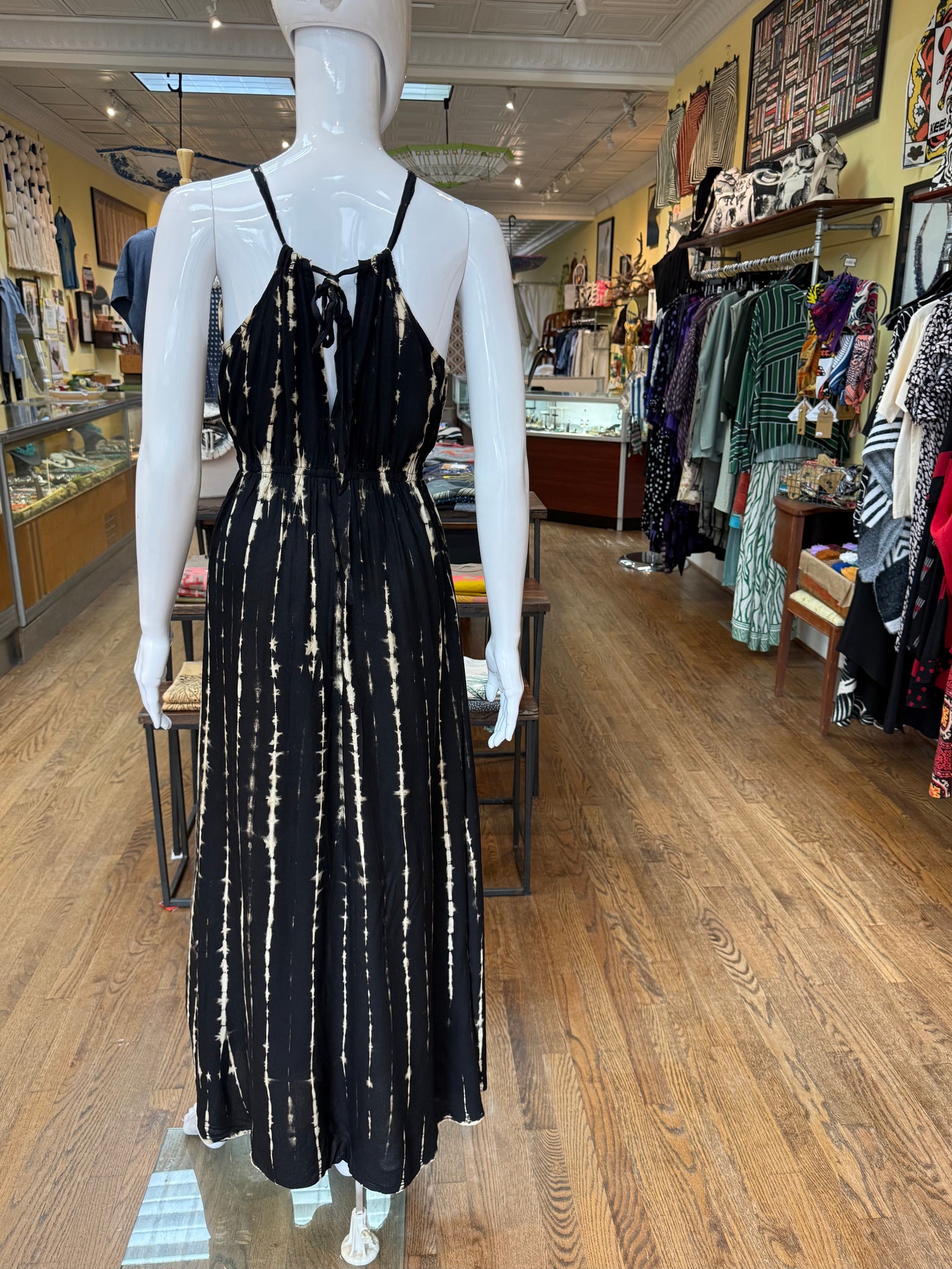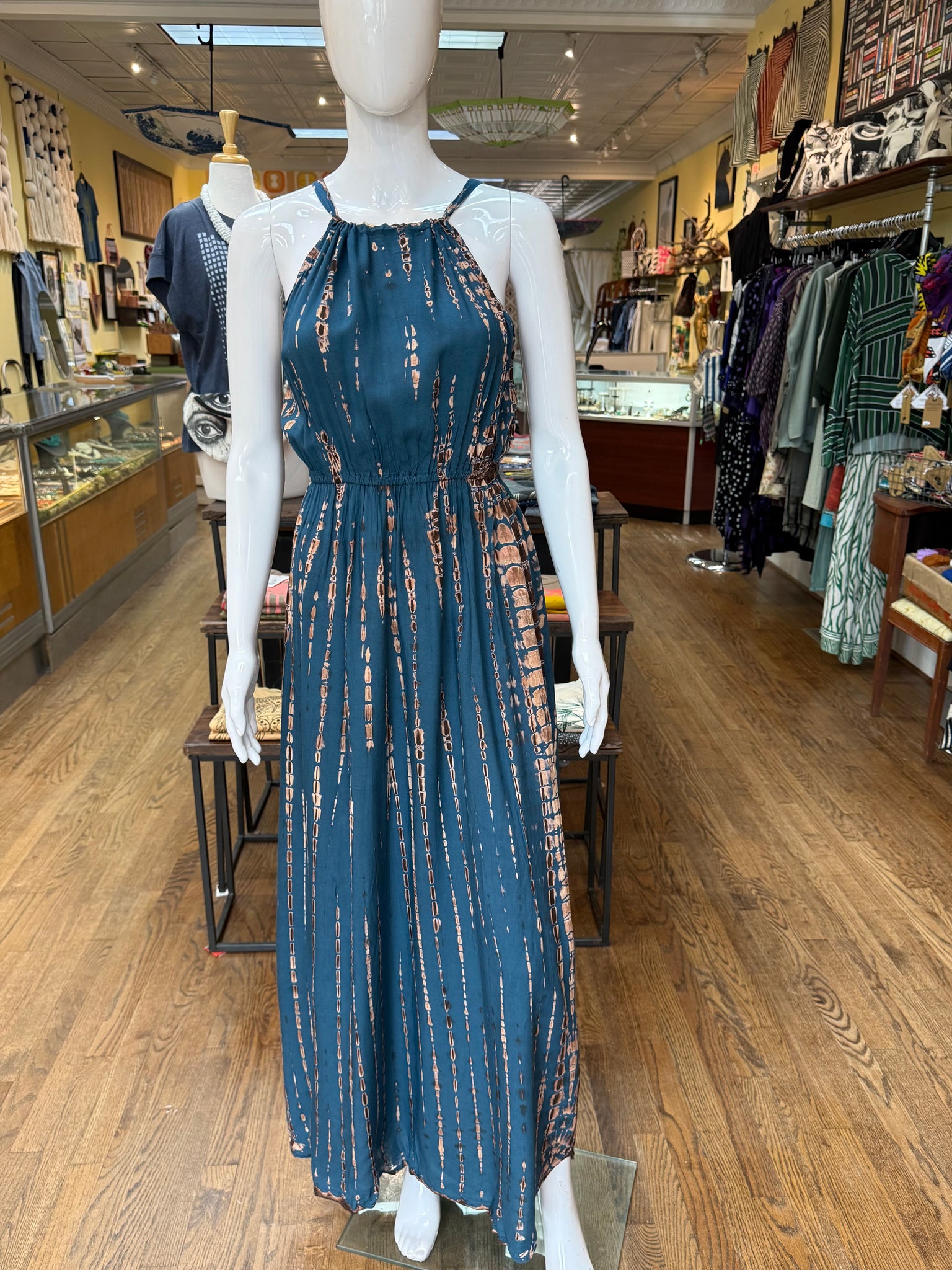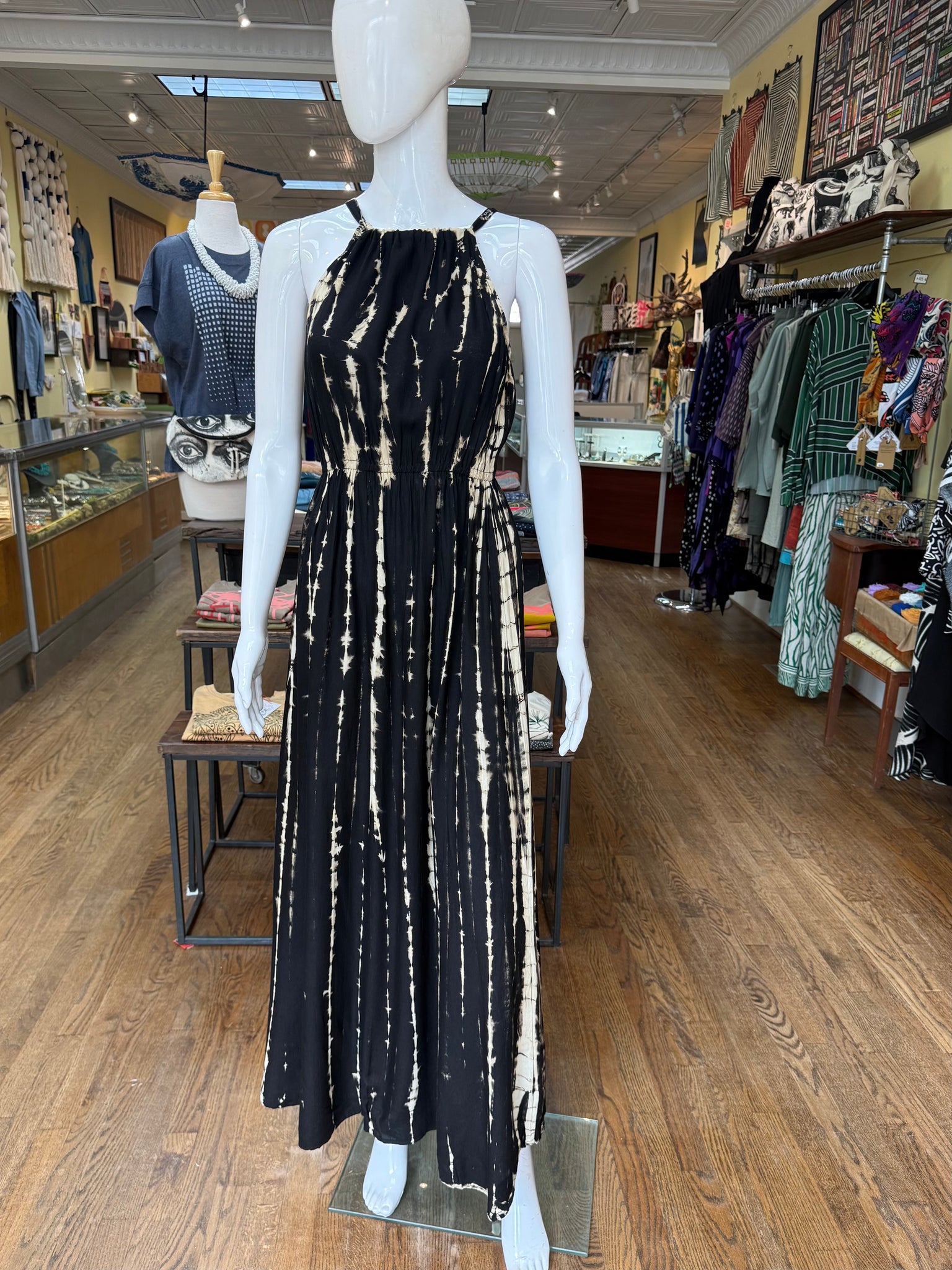 Beautiful shibori dyed maxi dress with a higher neckline that you can adjust with a self tie in the back. Nice event or evening piece.