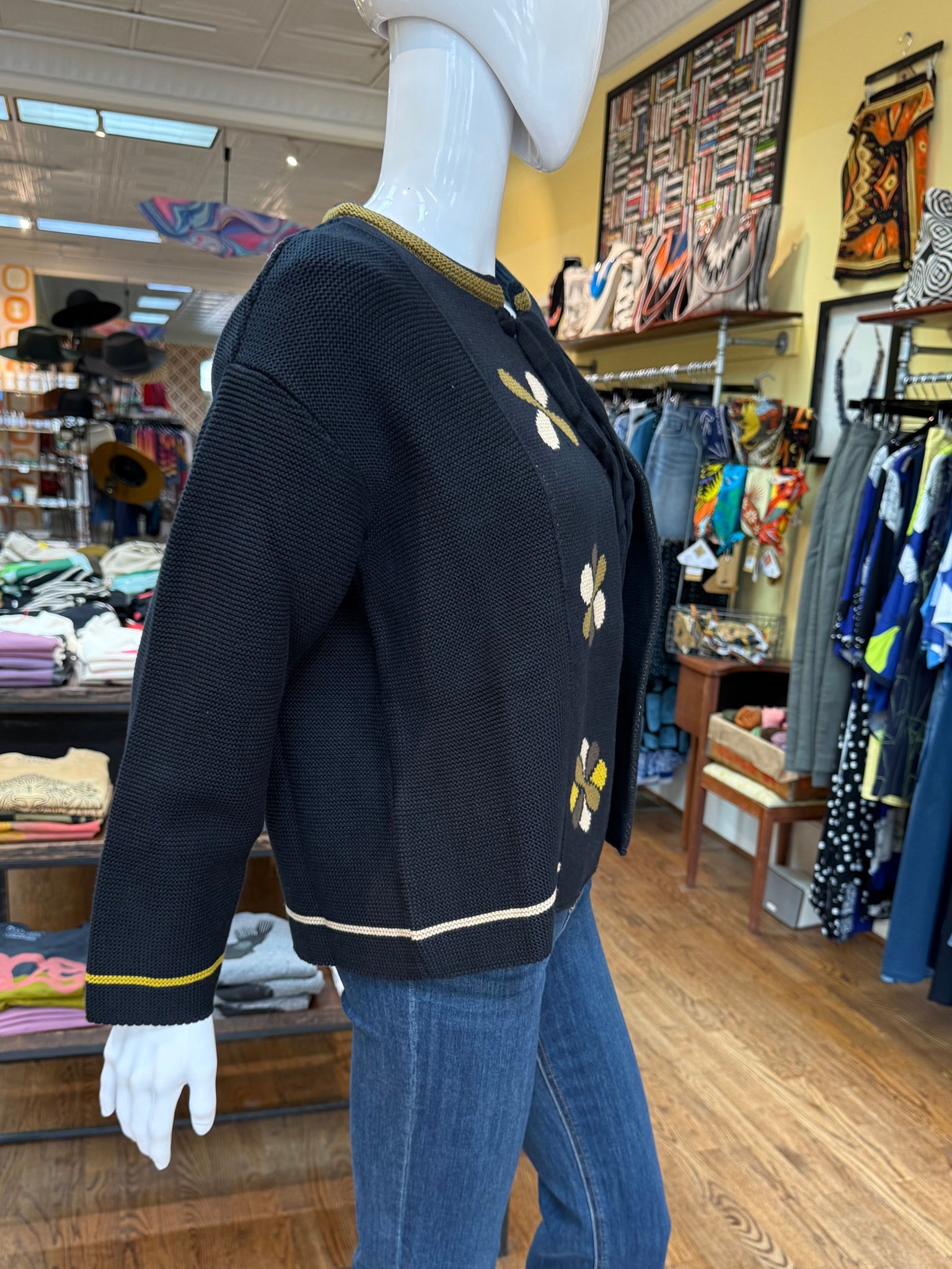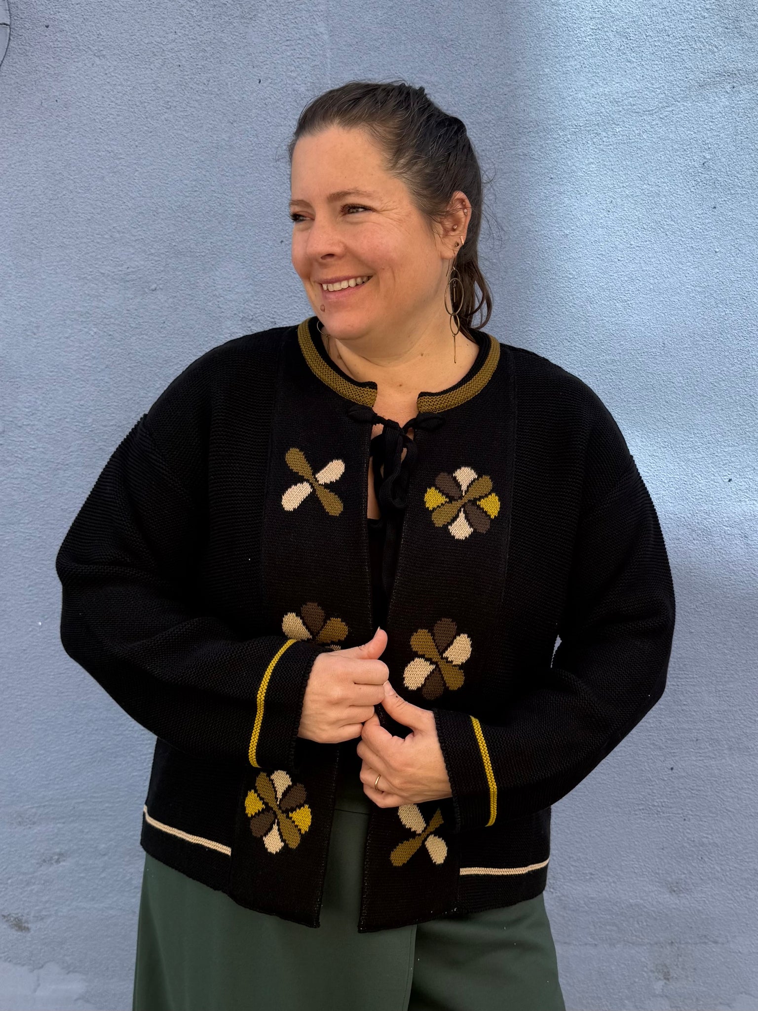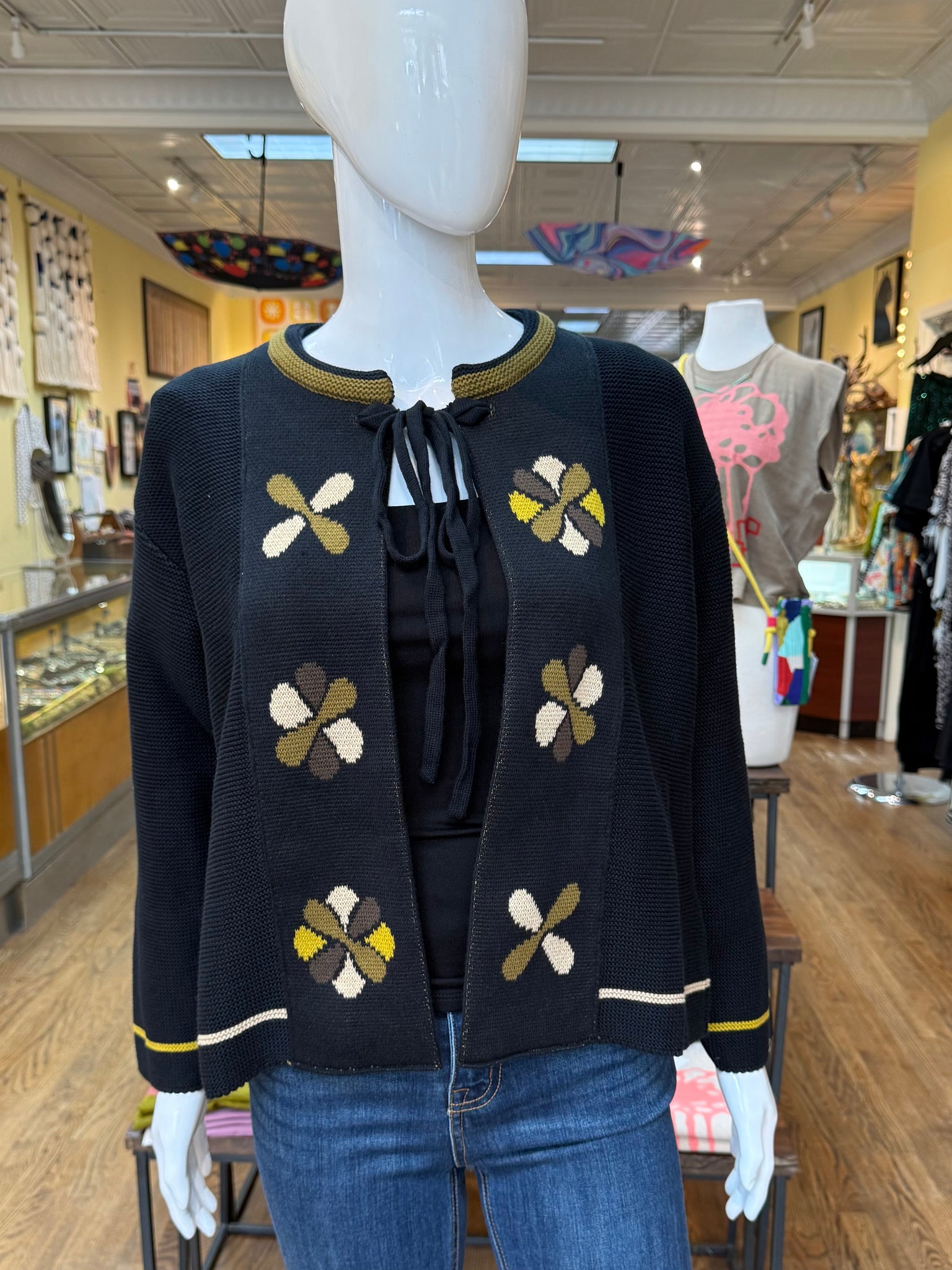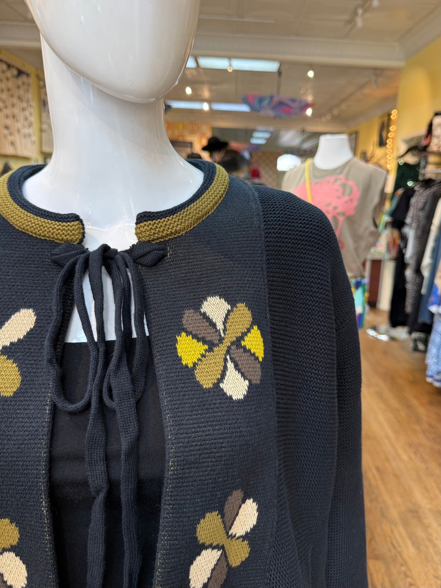 A lovely knit sweater that can be worn as an open style cardigan or tied at the neck for a cape/jacket look. This is an adorable wear that’s very soft and has a classic feel floral pattern on the front. A winner for sure!
