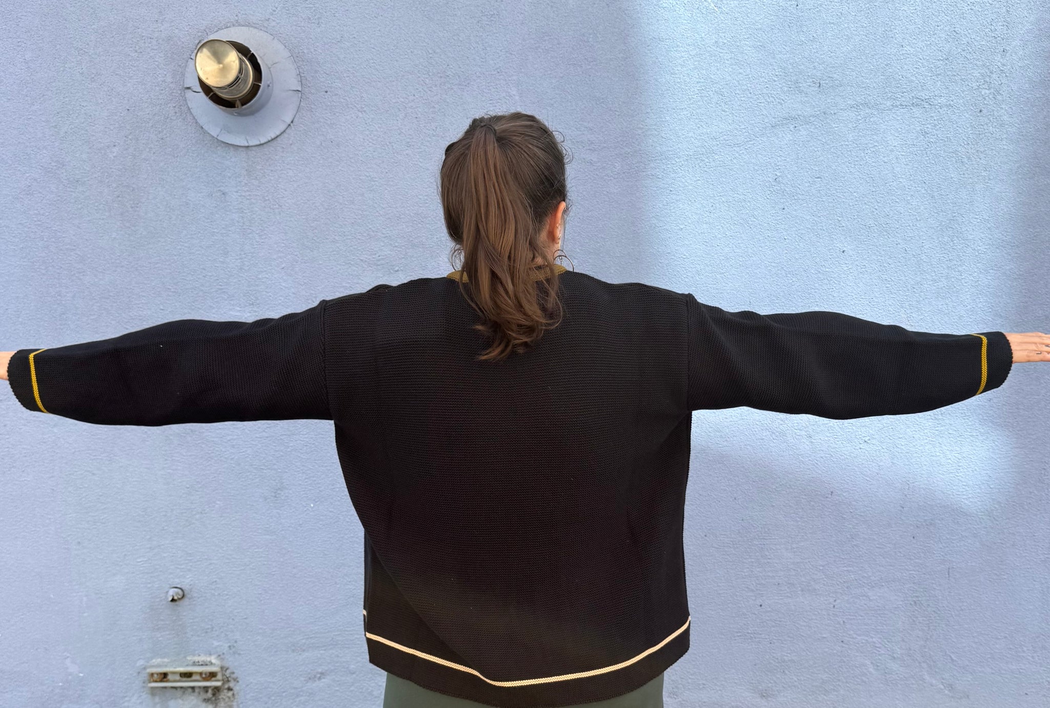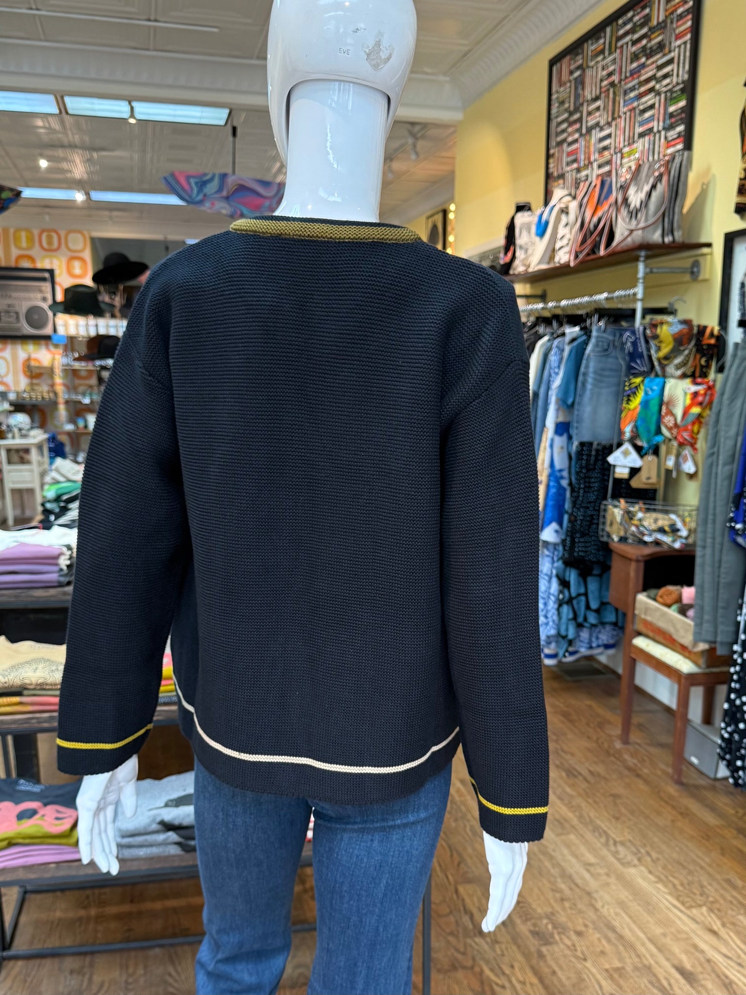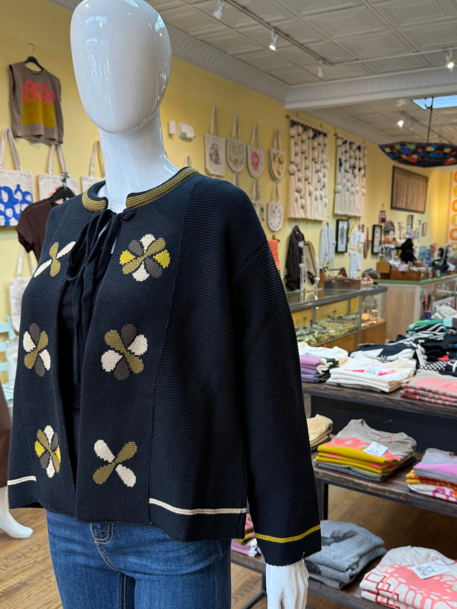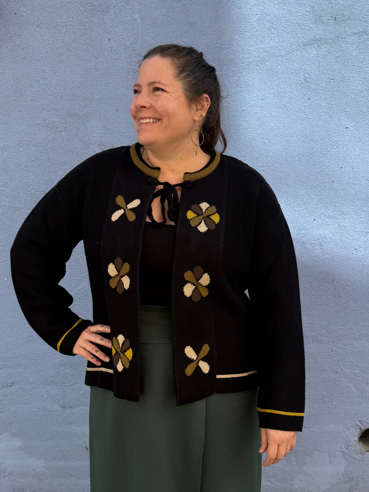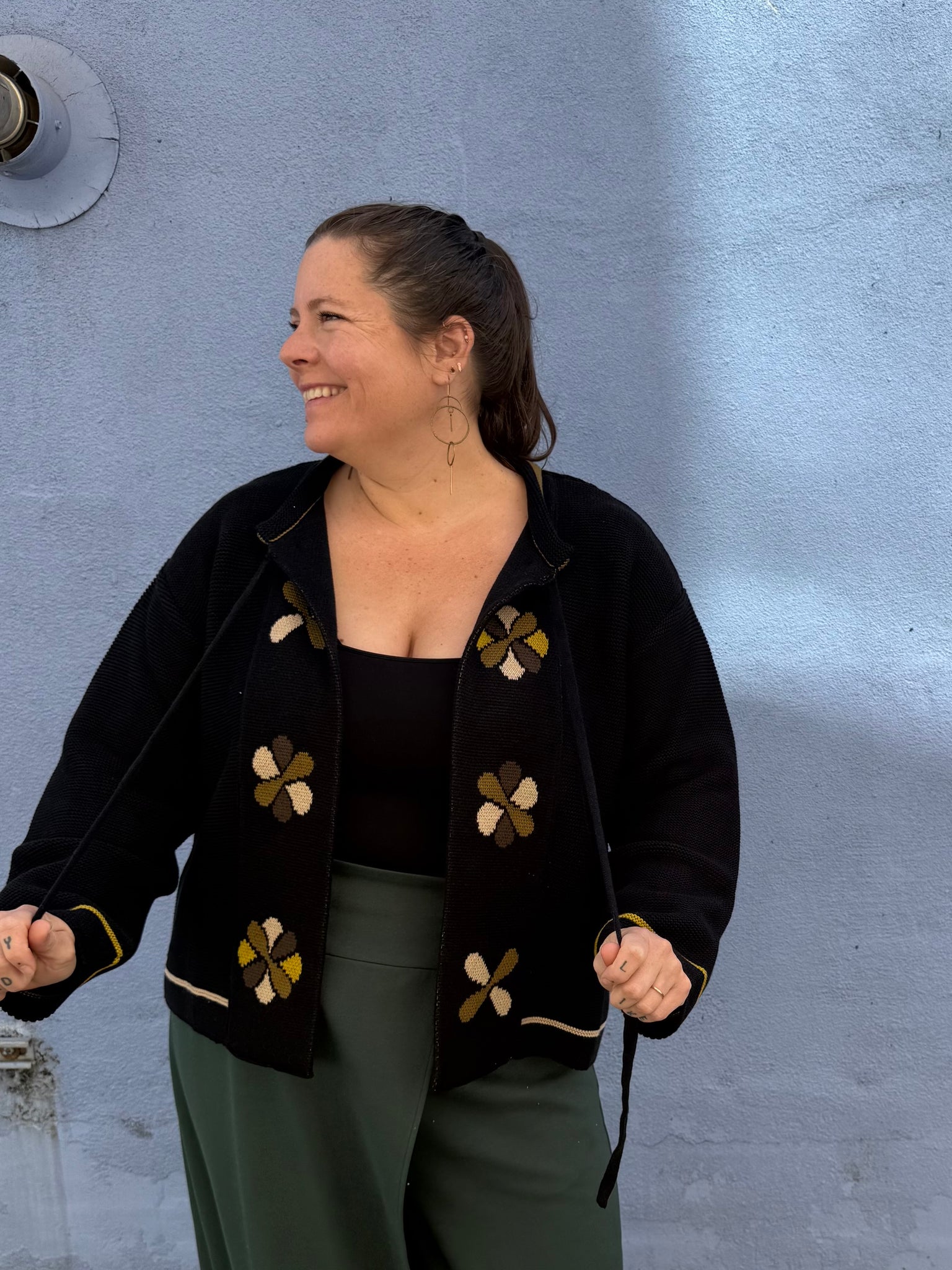 A lovely knit sweater that can be worn as an open style cardigan or tied at the neck for a cape/jacket look. This is an adorable wear that’s very soft and has a classic feel floral pattern on the front. A winner for sure!
