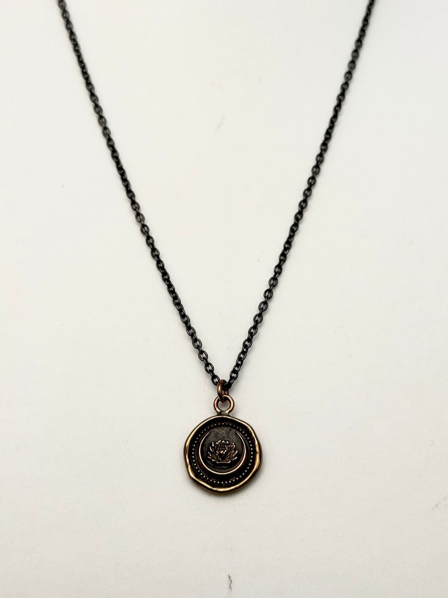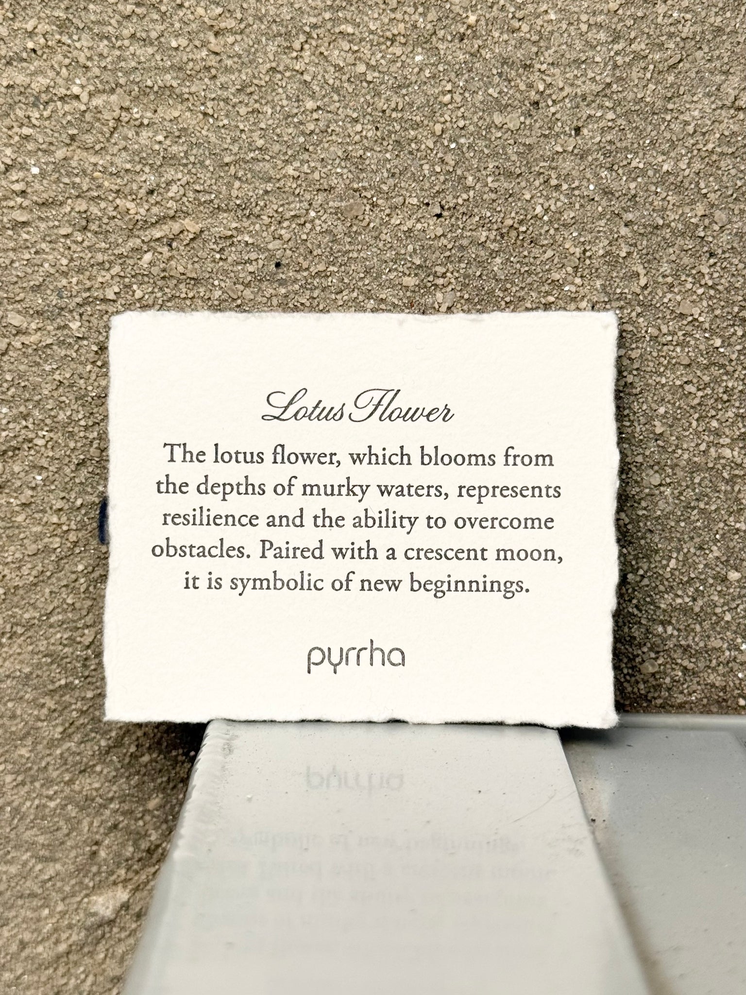 The lotus flower, which blooms from the depths of murky Waters, represents resilience in the ability to overcome obstacles. Paired with a crescent moon, it is symbolic of new beginnings.