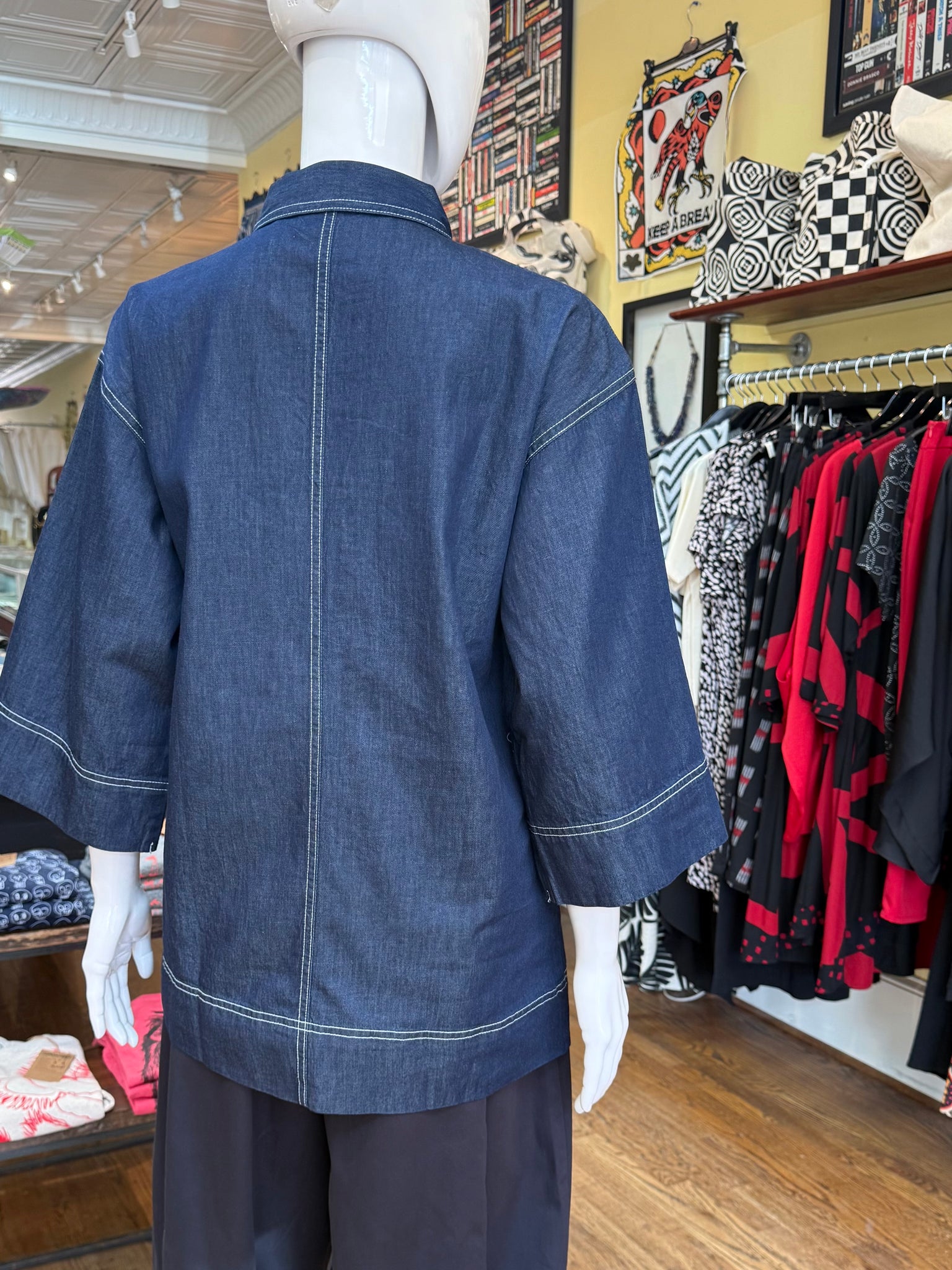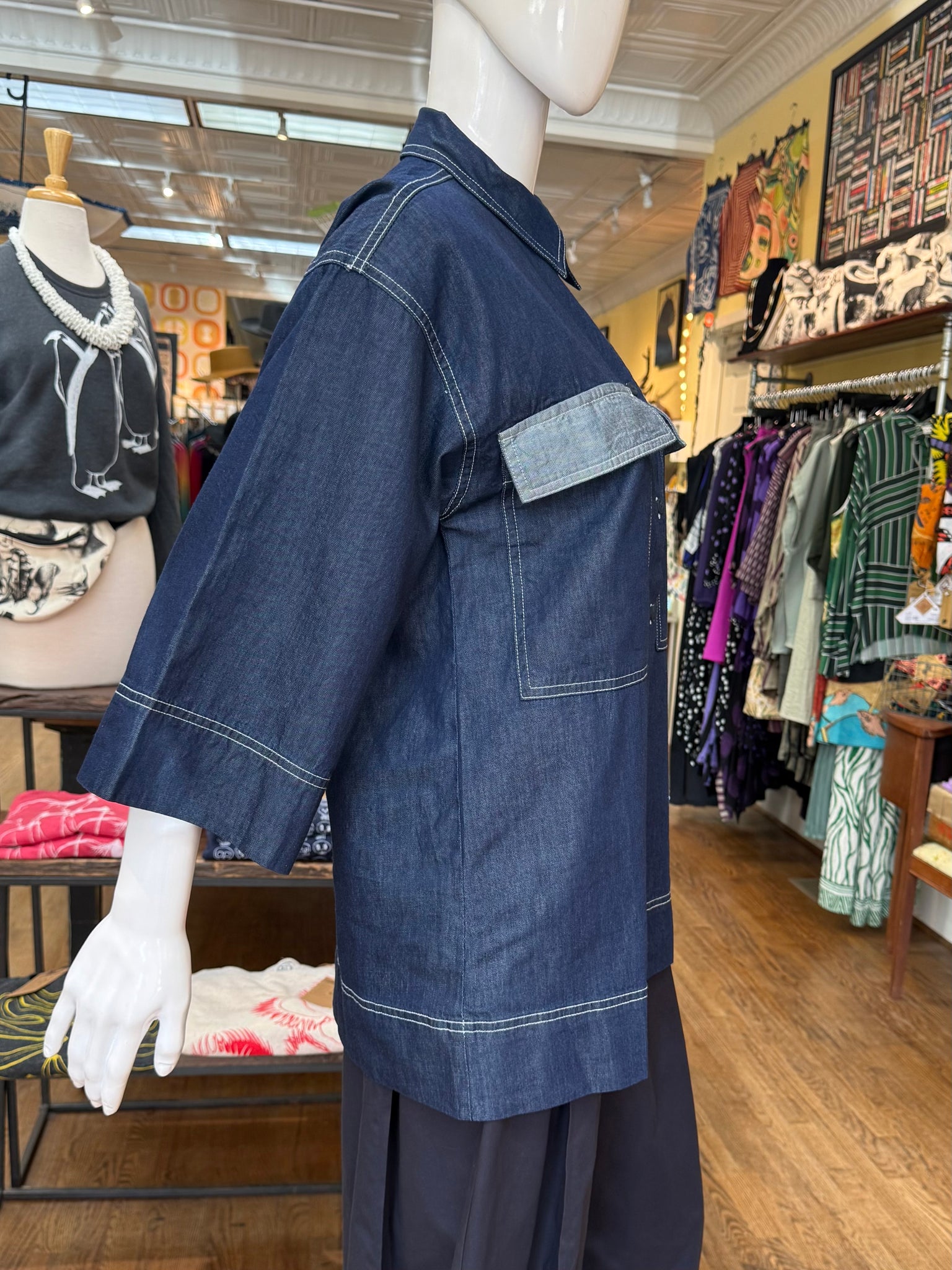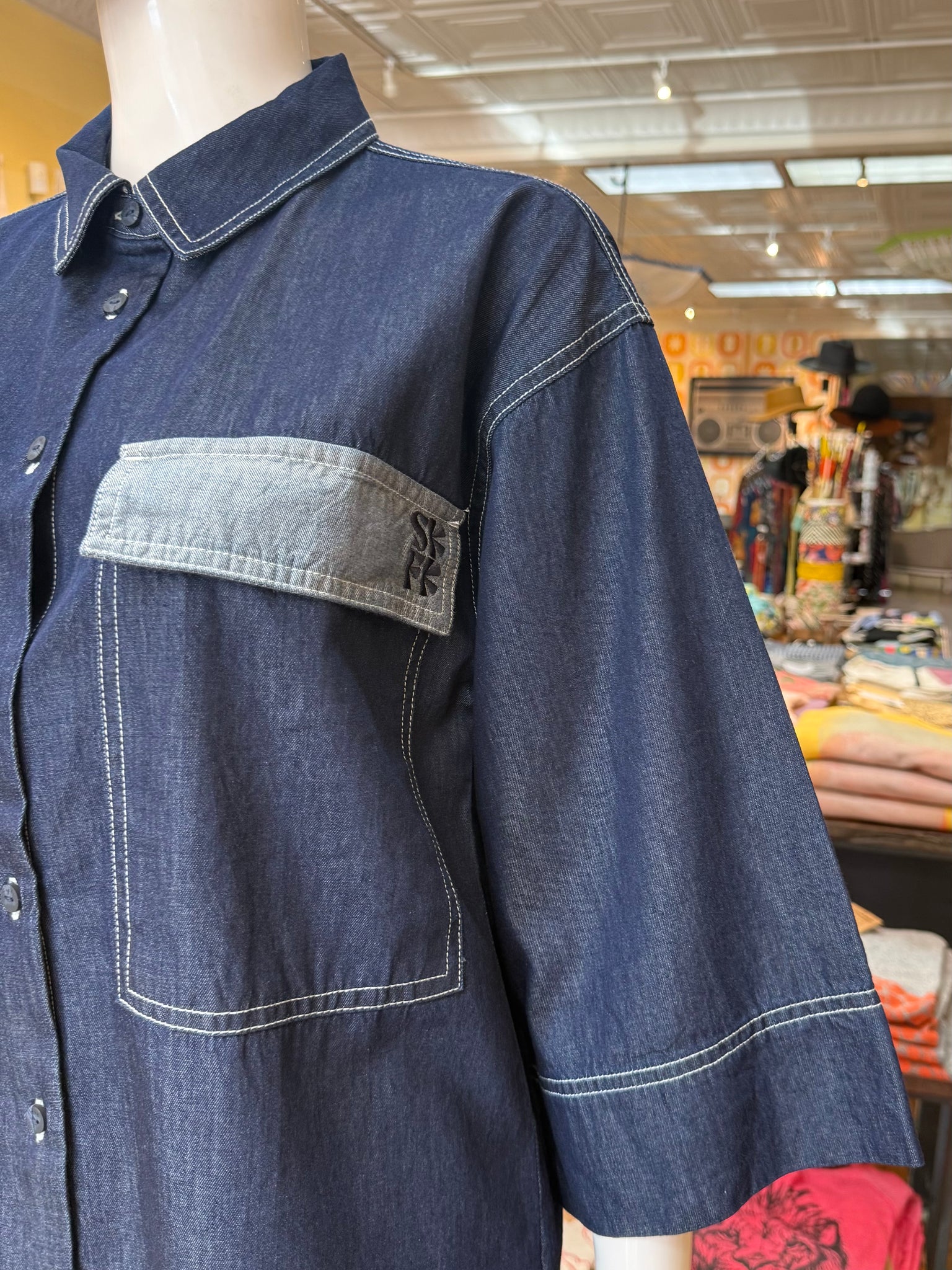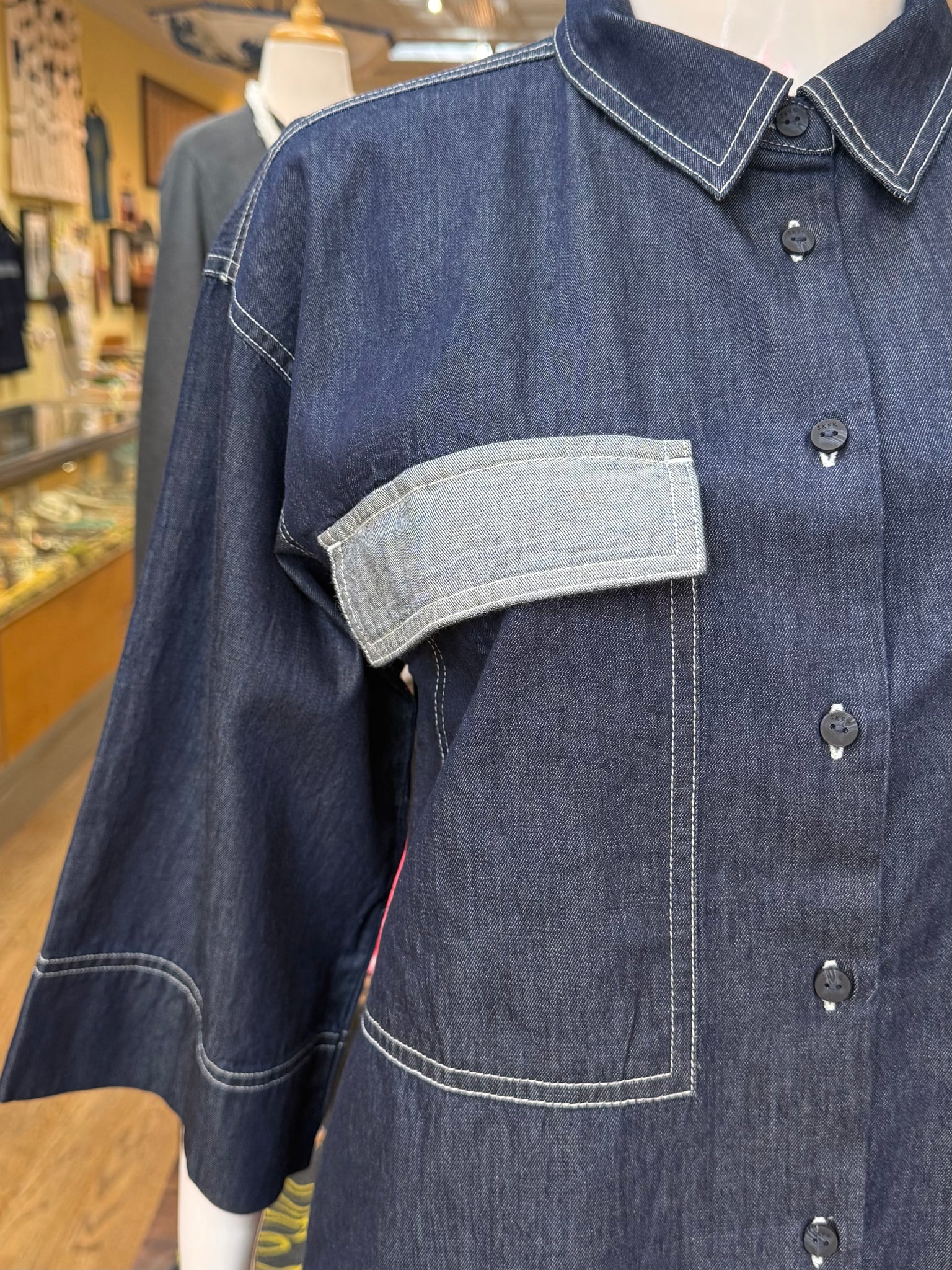 Oversized, long length denim top with bell sleeves and large front breast pockets. Love this one with baggy, fuller pants for a fun oversized look. Fabric feels great on this one and is lighter than it may look. Fun piece!