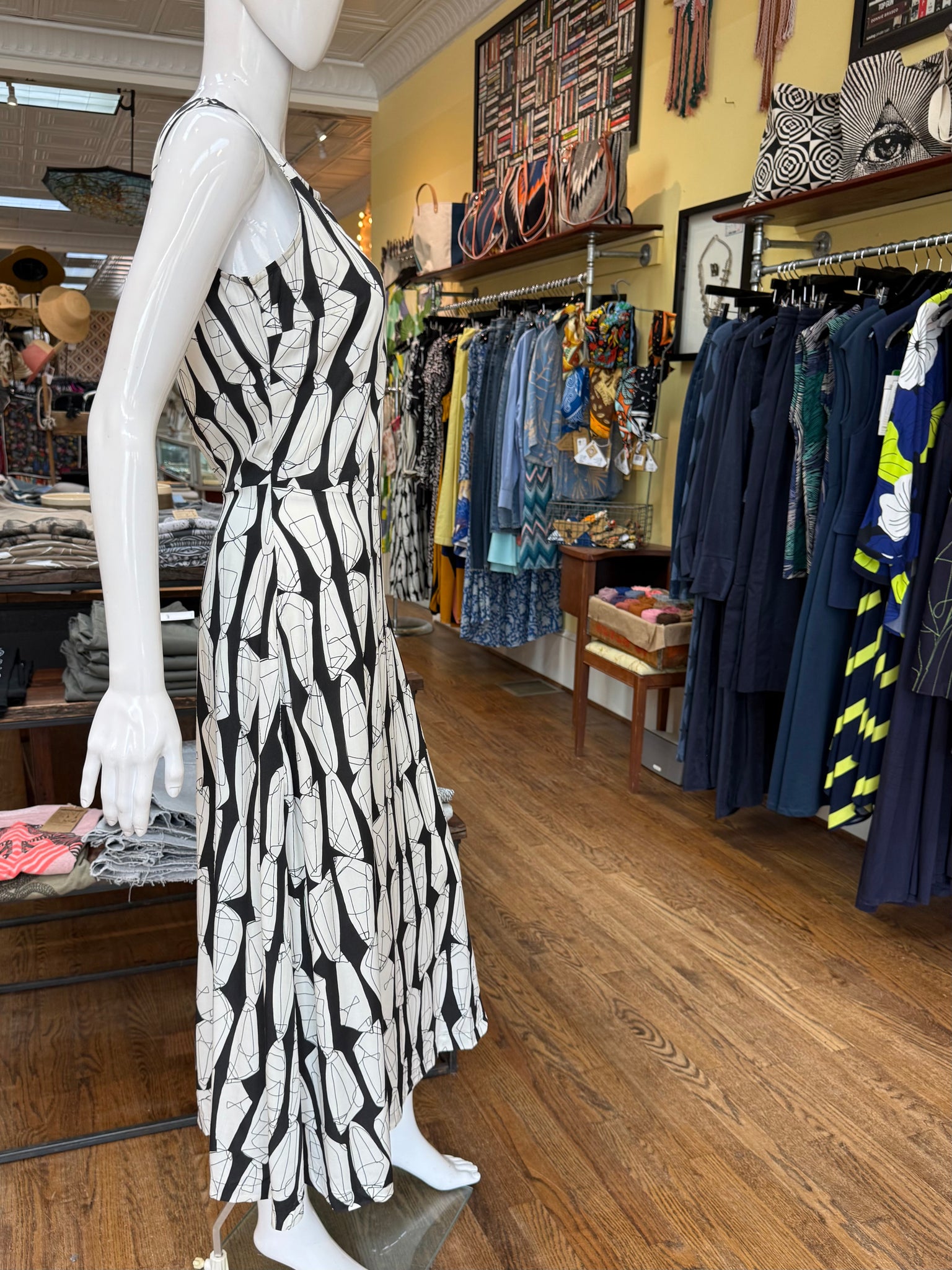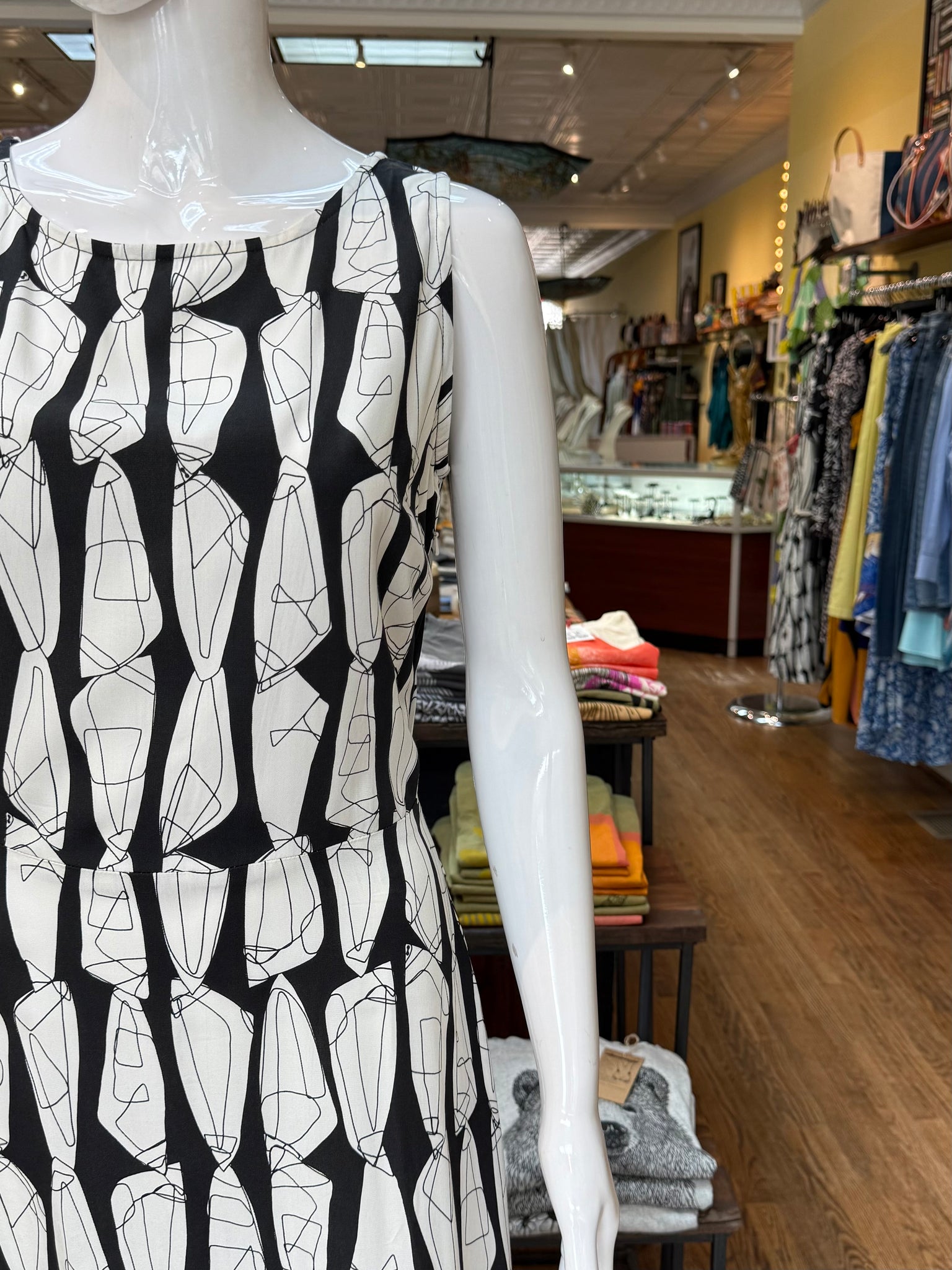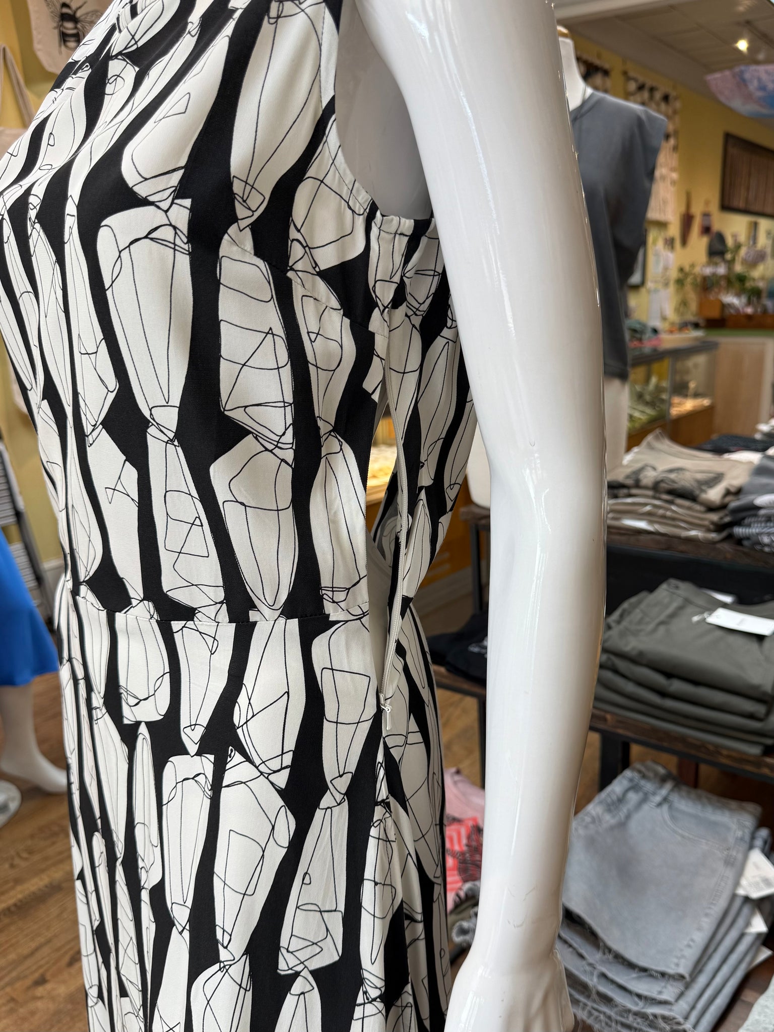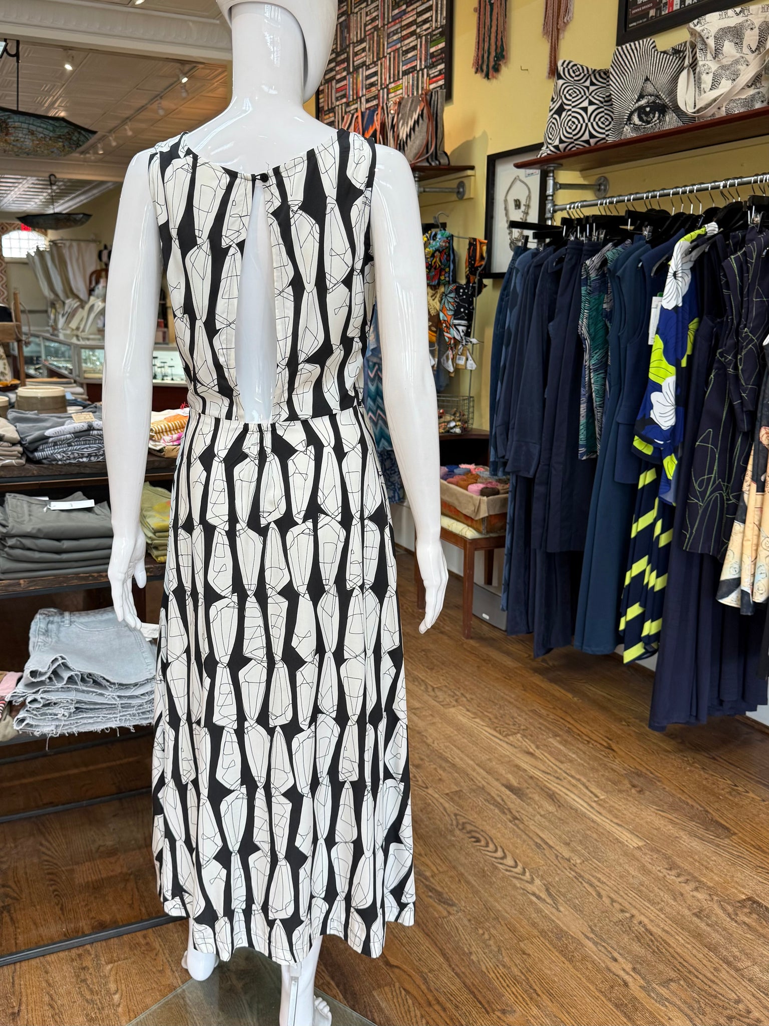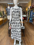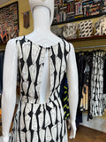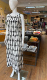 Striking print on a classic fit dress. There’s a beautiful cutout in the back which makes this one a great evening piece too. The black and white color makes this an easy pair with shoes and the waist also works very well with a wrap belt accent.