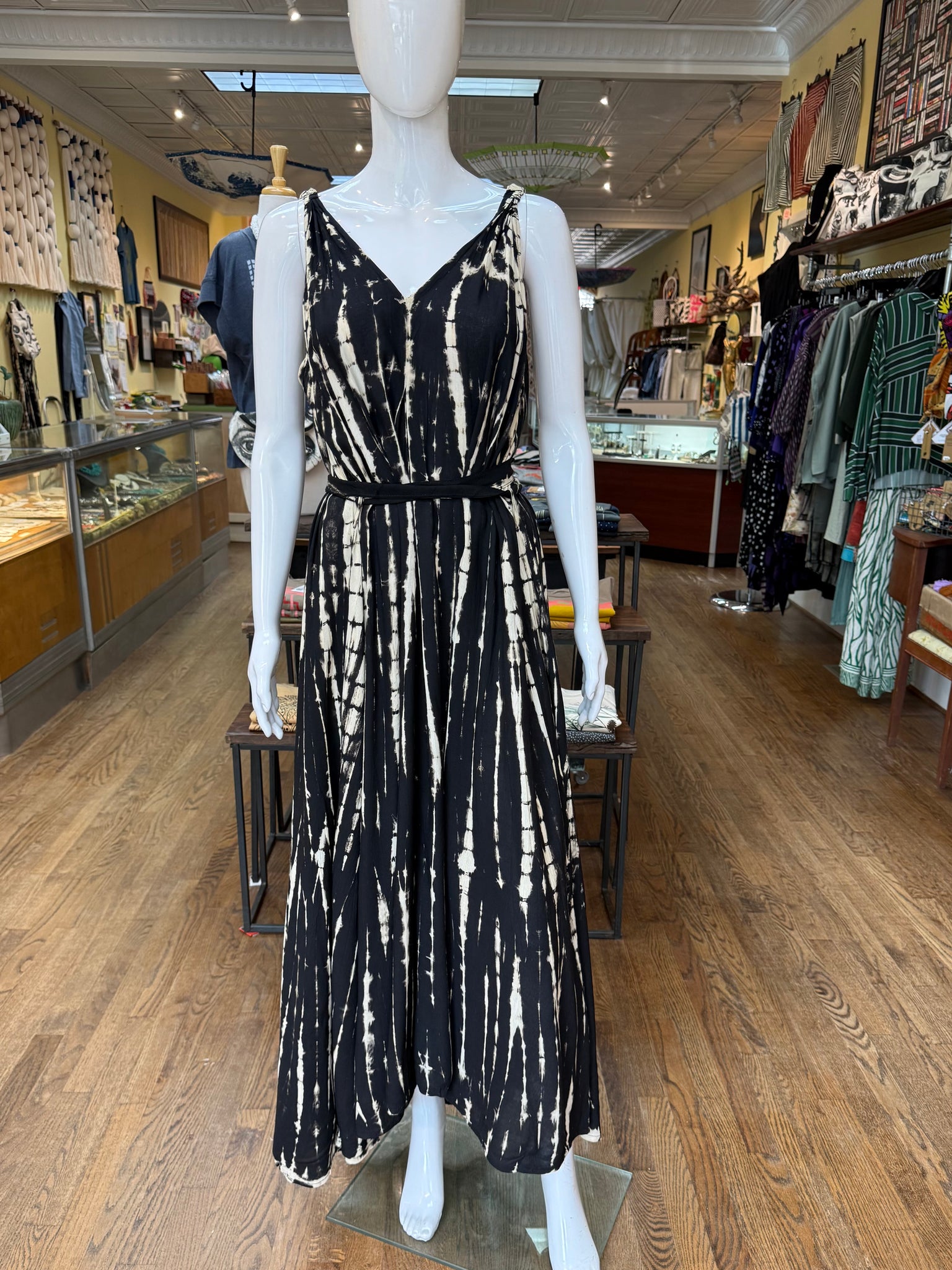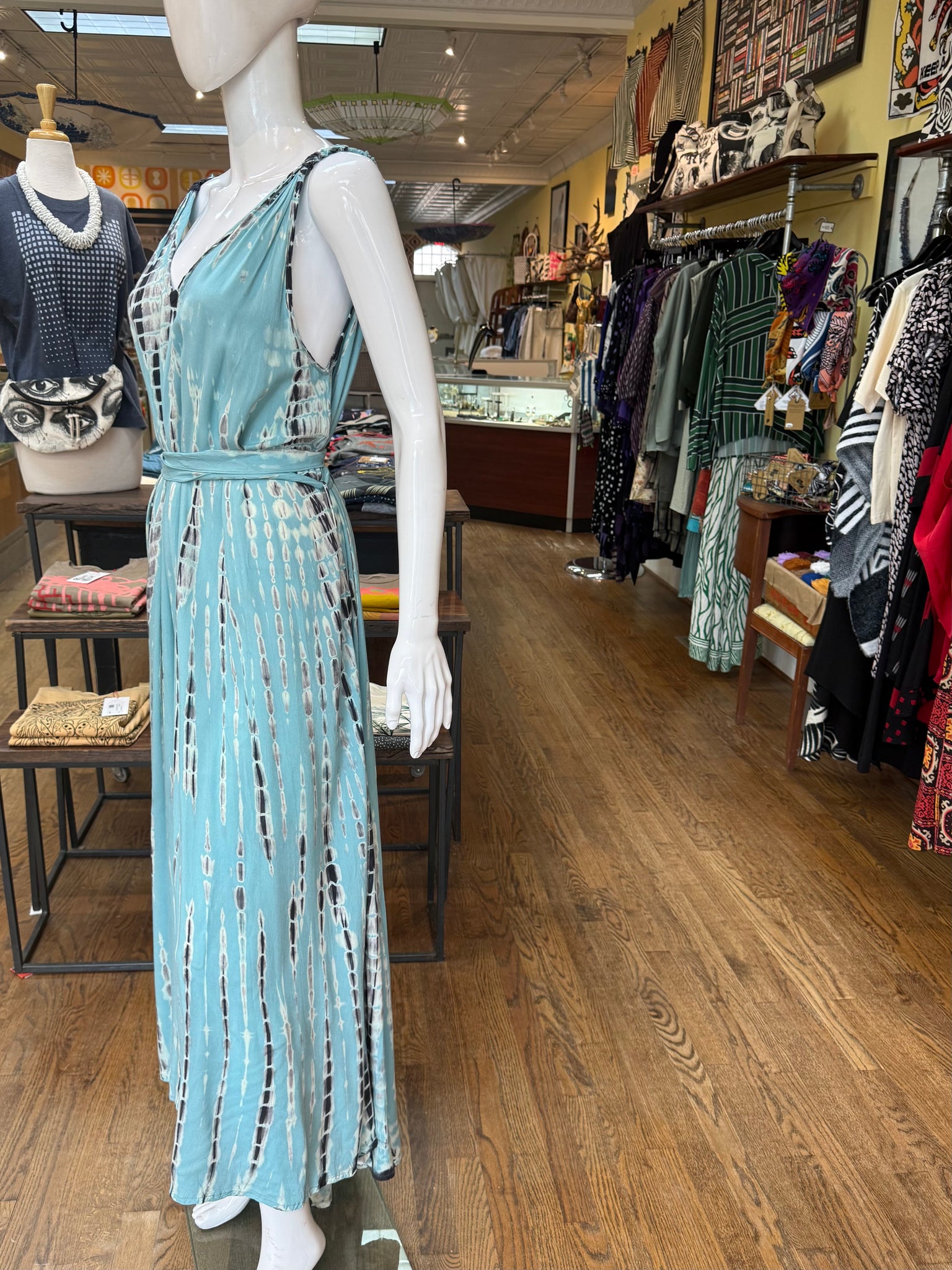This full length maxi is beautifully hand dyed with a flowing, elegant look. Stretchy shoulder straps allow for an easy fit for all body types. The belt is removable too.