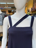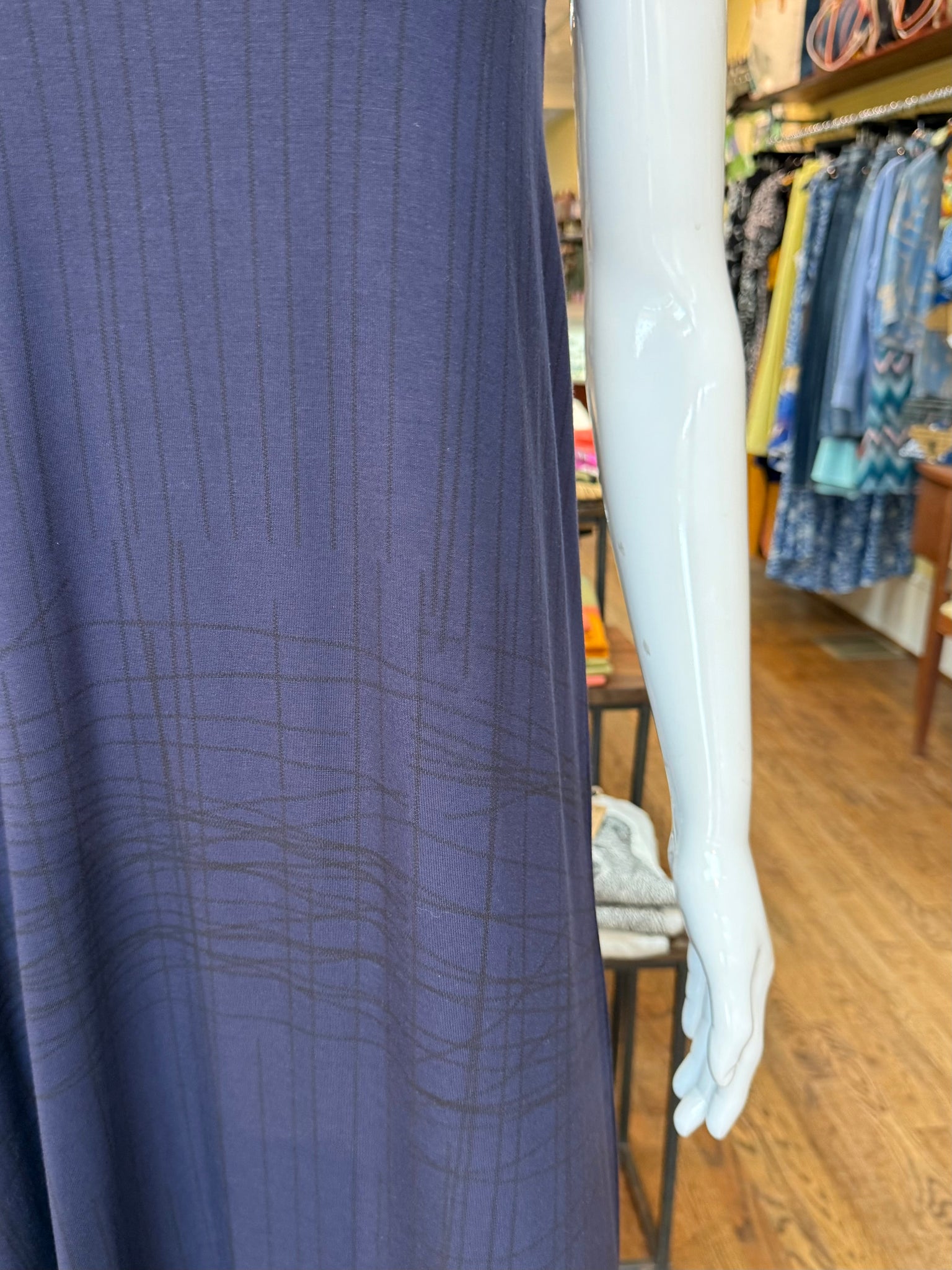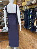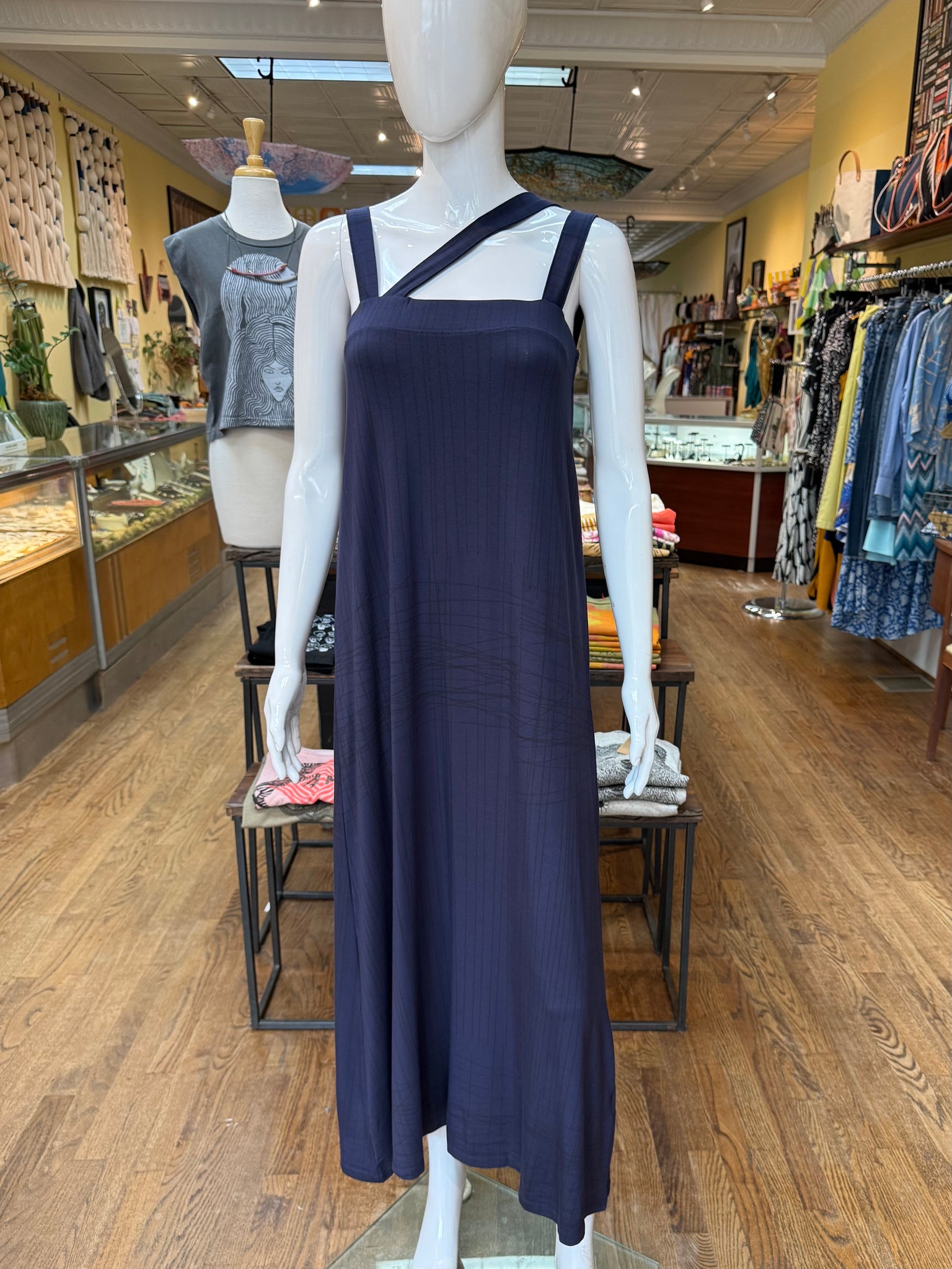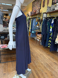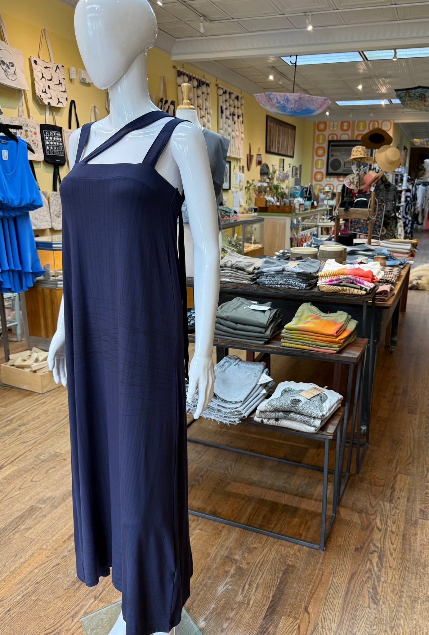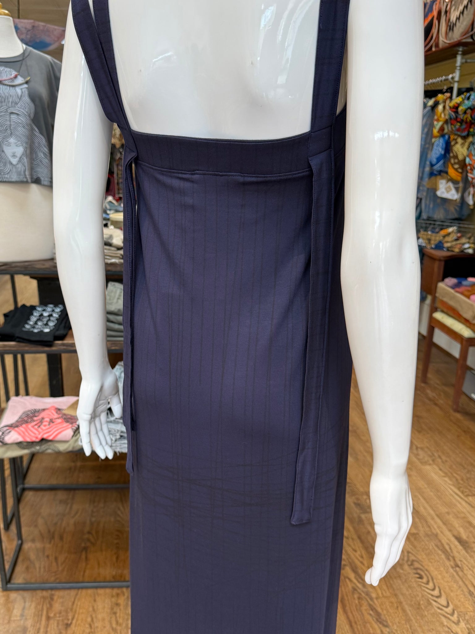 Gorgeous maxi dress with fun strapping and a dark navy color with subtle black pattern details throughout. A perfect evening or event look that is so comfortable. There are hanging strap details in the back, just for aesthetic but you can potentially tie and give the dress a different look in the back.