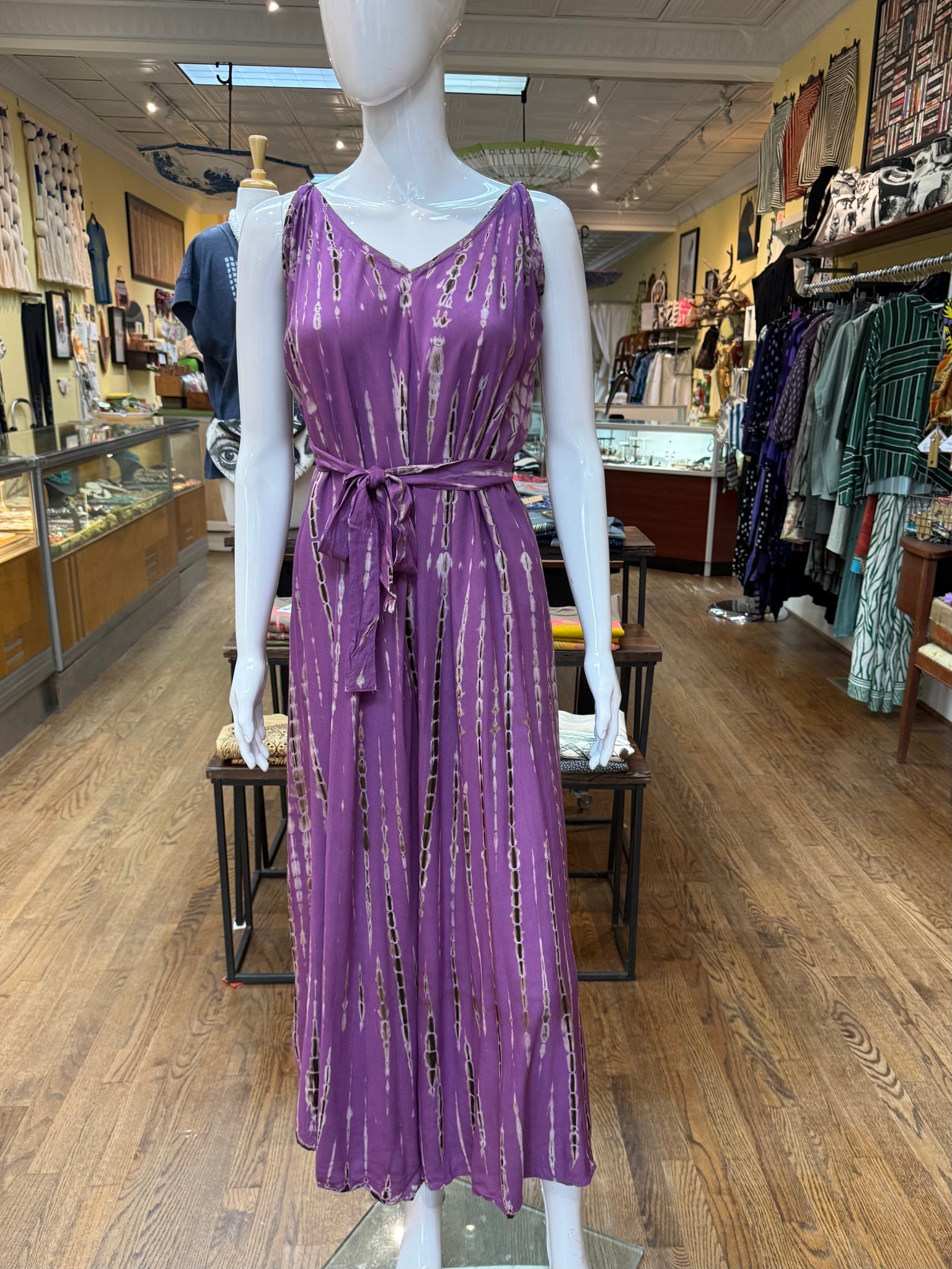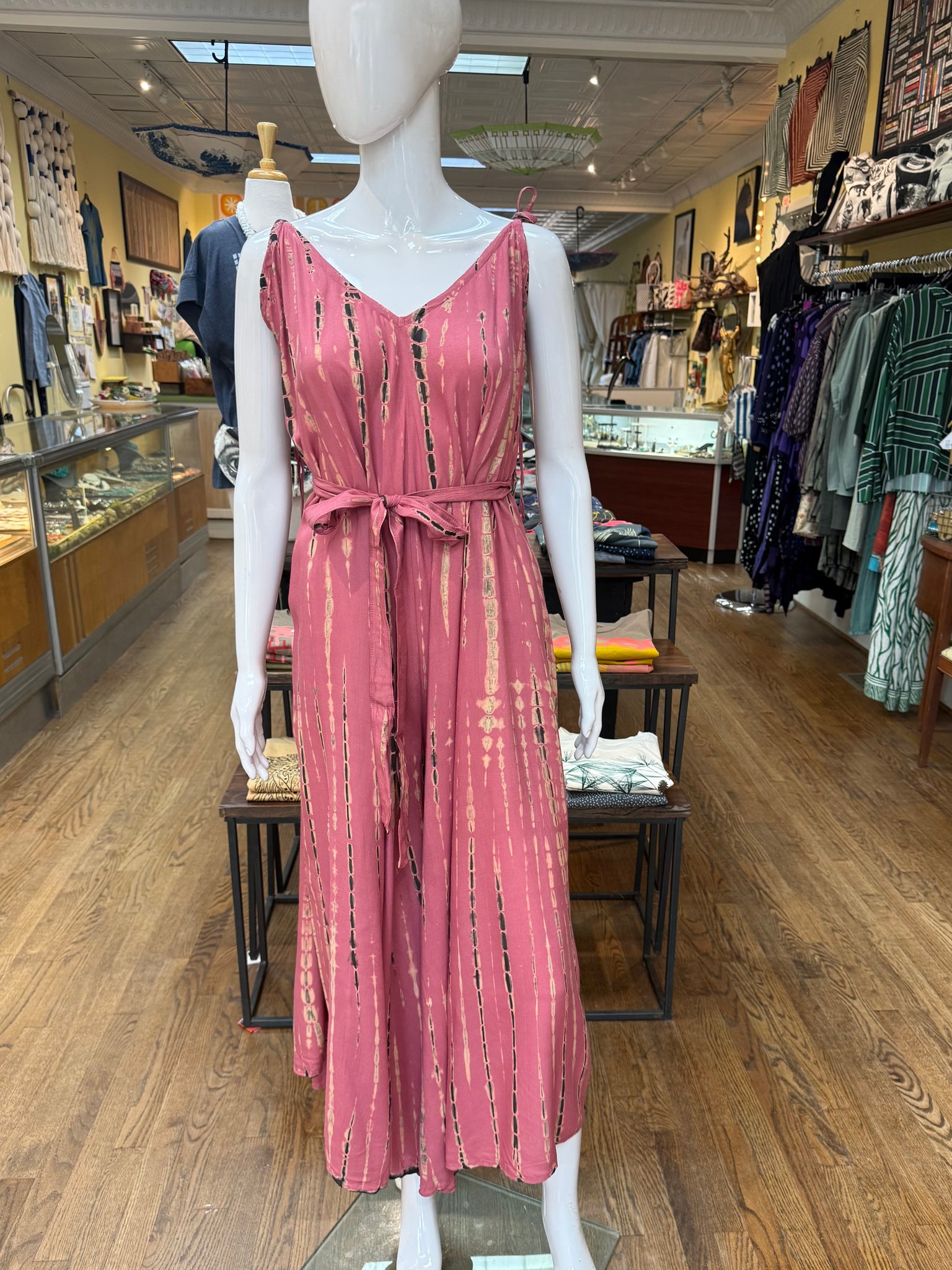 Beautiful shibori dyed jumpsuit with wide, flowing legs that mimic wearing a dress. The self tie shoulder straps allow for ample length and chest adjustment so this one can work for anyone. Great piece for a man event or evening out.