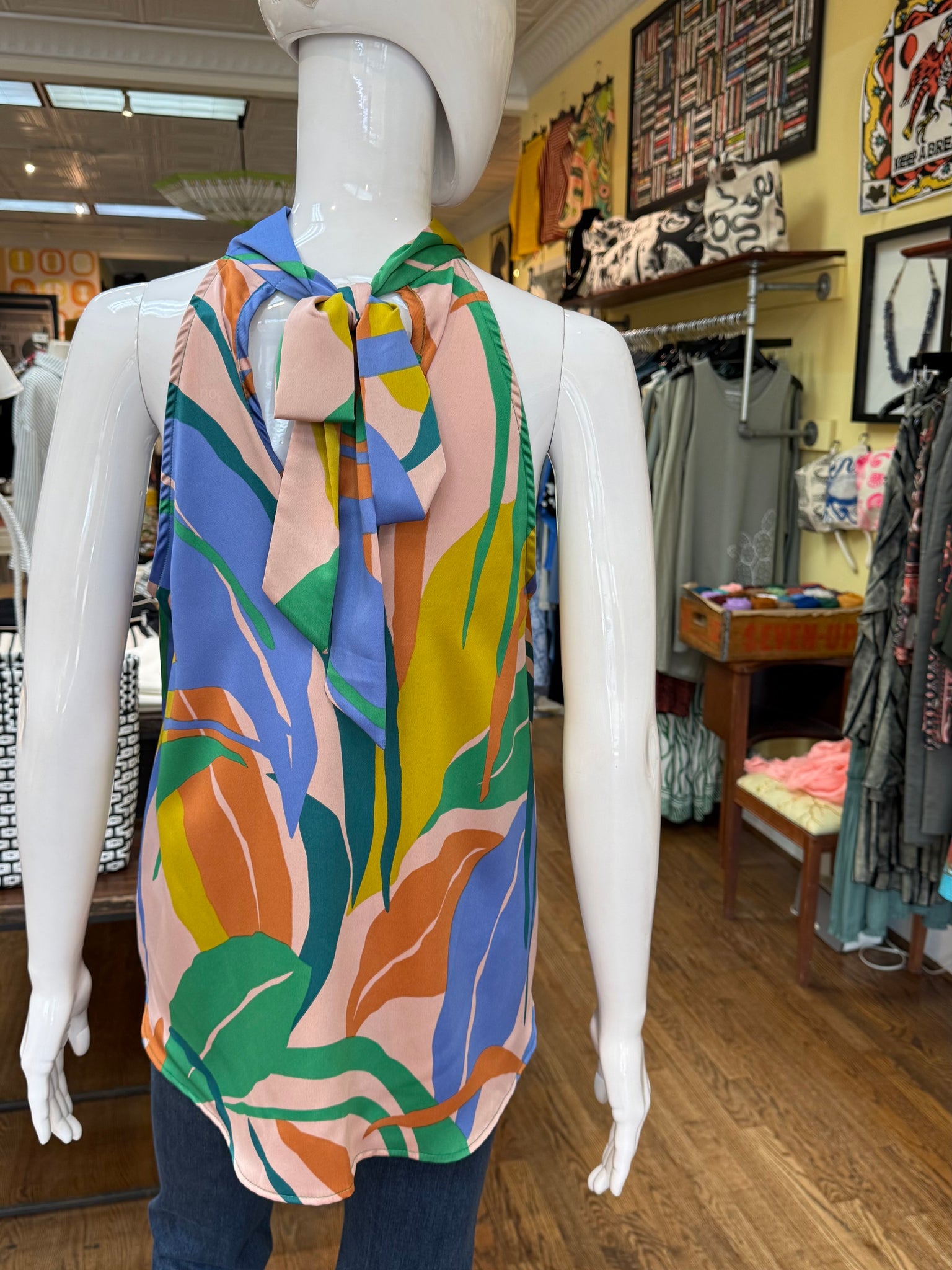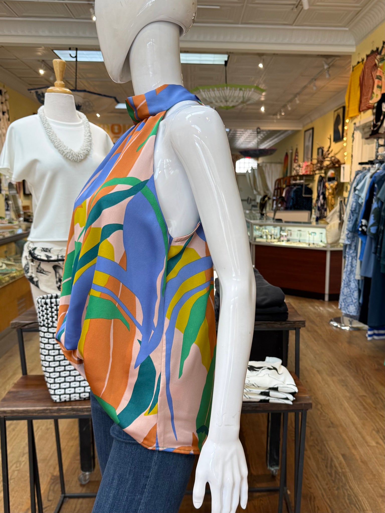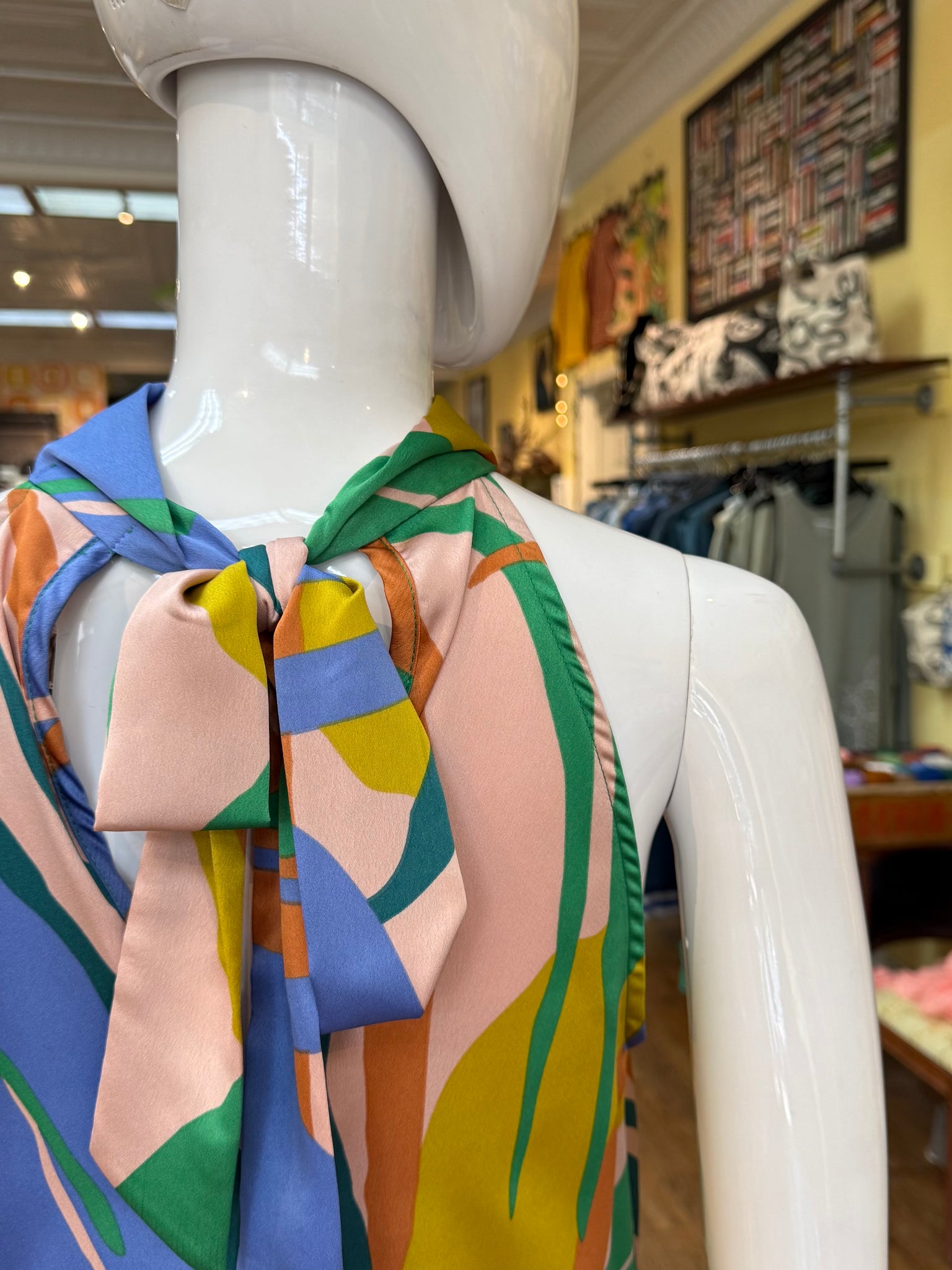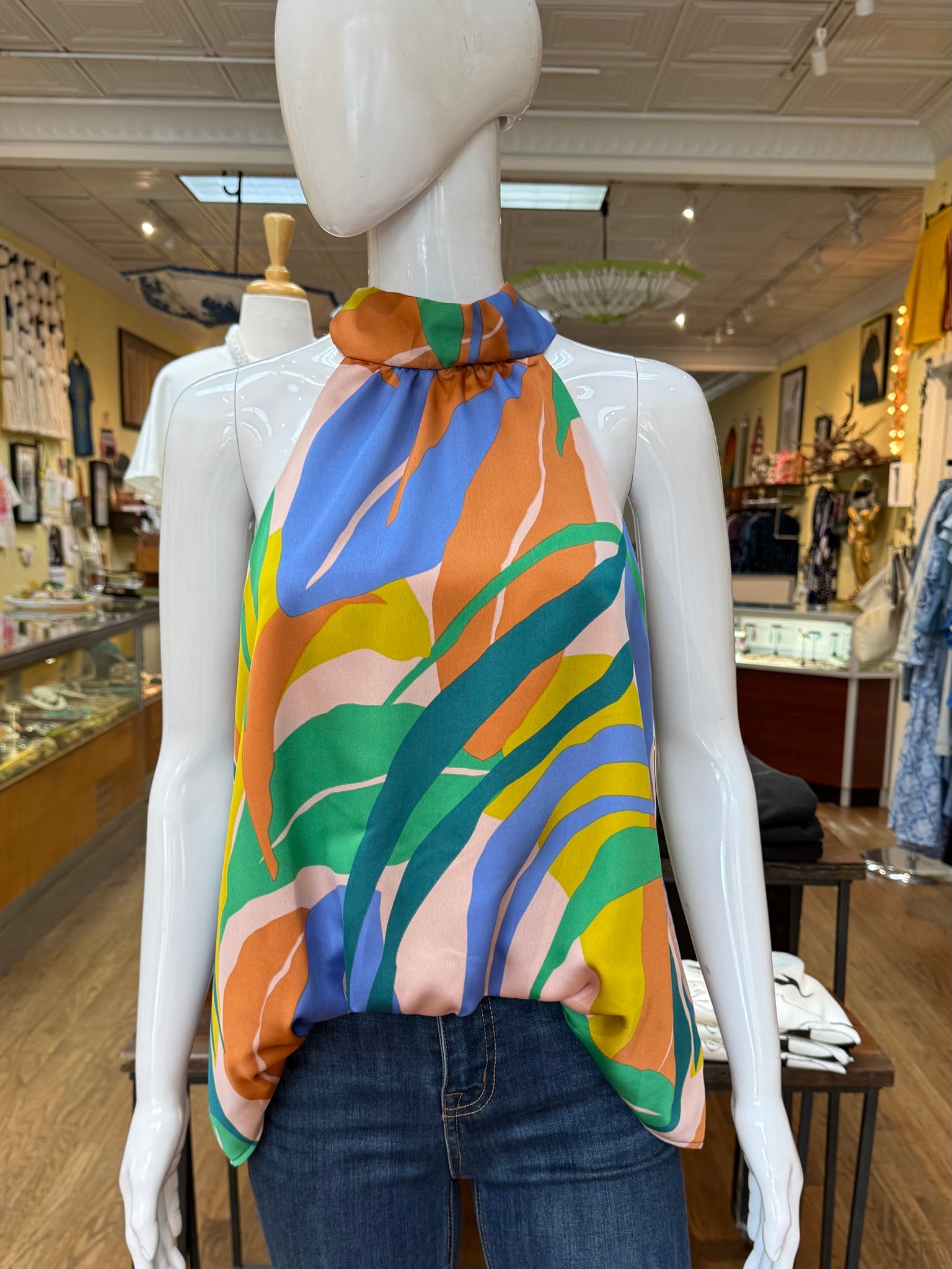 Fun and flirty halter top blouse with vibrant coloring. Front hem is a bubble hem that’ll give the piece a hi-lo look. There is also a self tie on the back of the neck. Great spring and summer top!