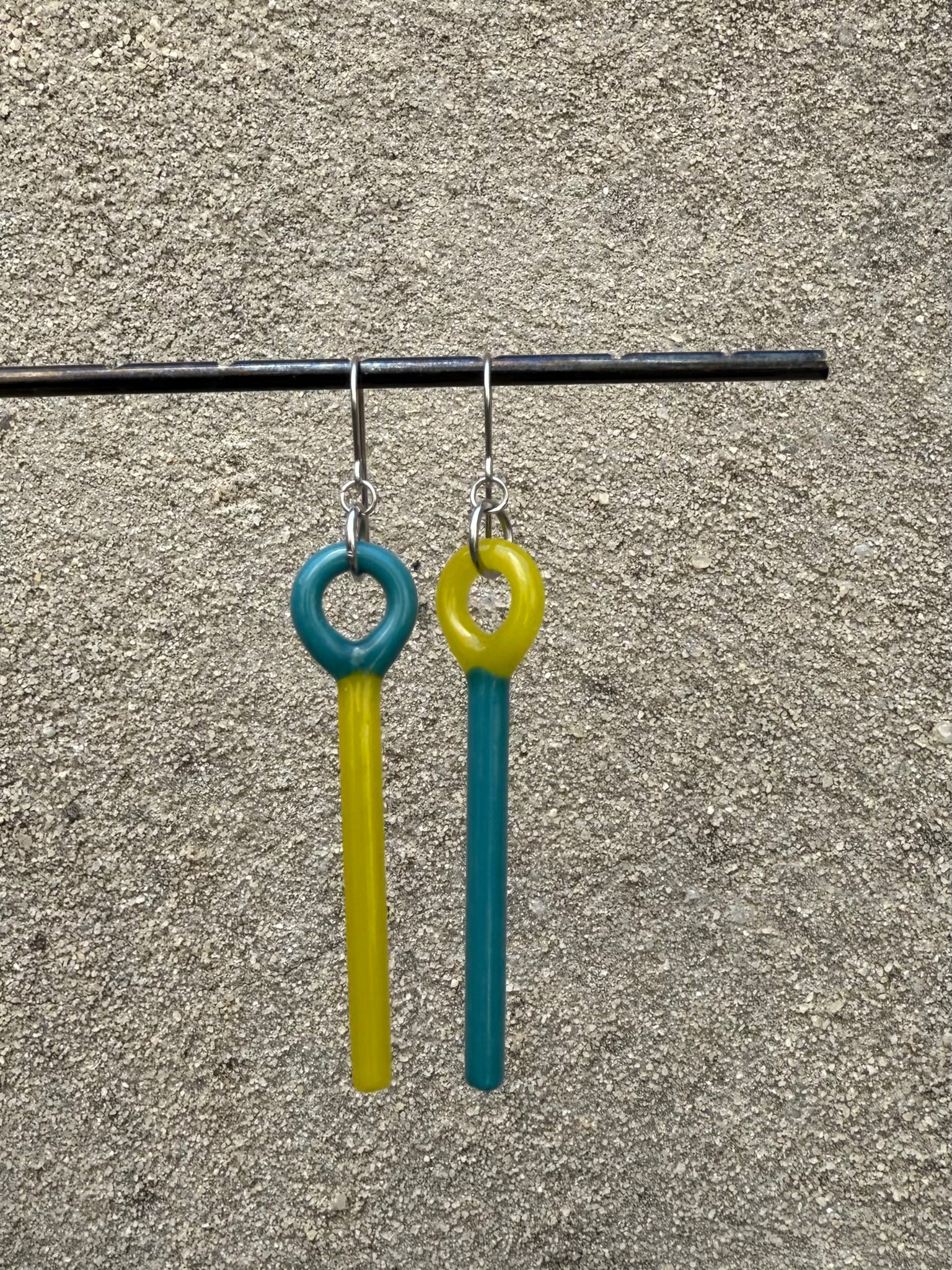 Jenna uses a type of glass called Borosilicate, which is often referred to as “hard glass.” It is a durable material that allows her to create varying sizes of work that remain lightweight and wearable.