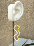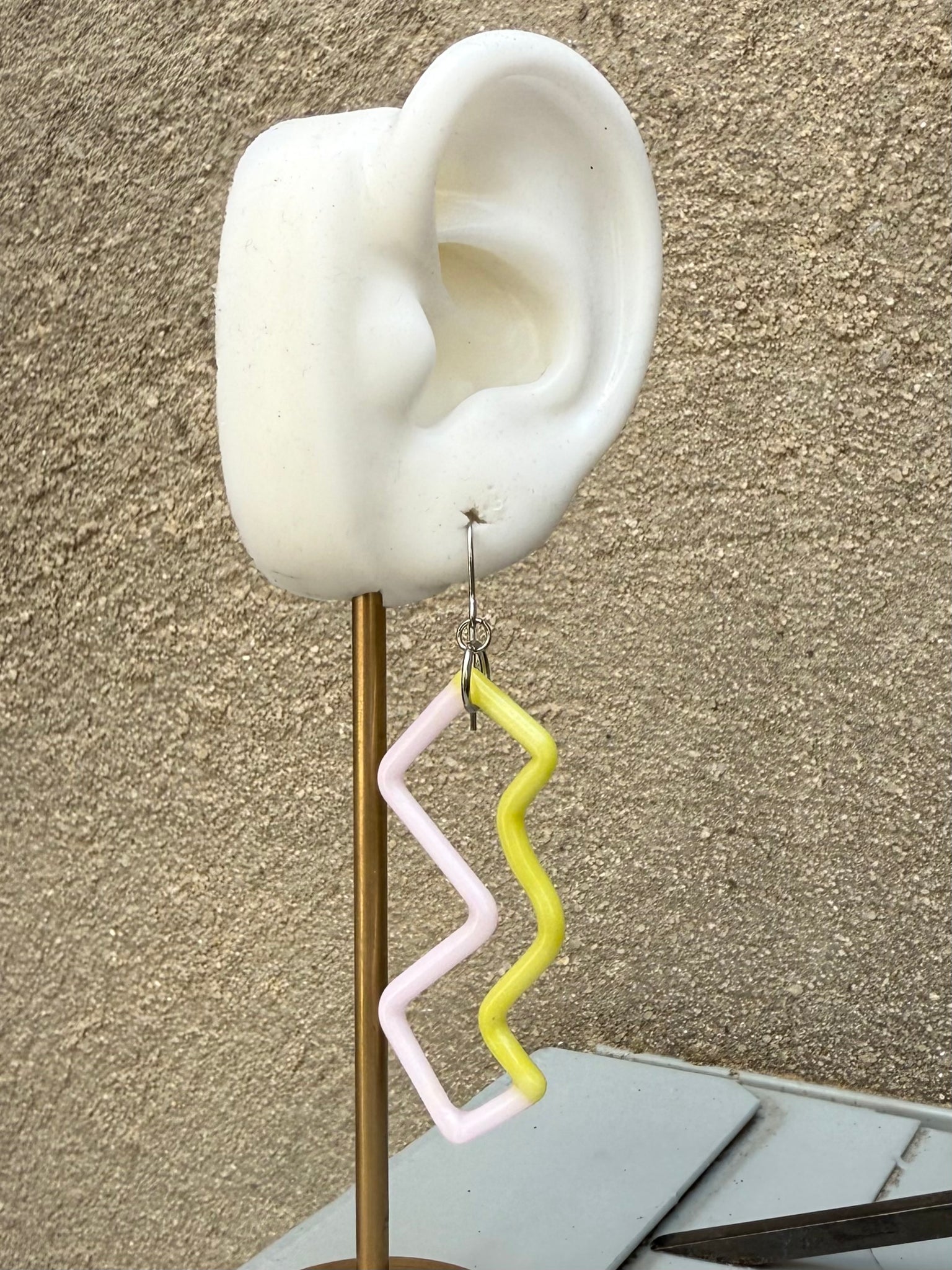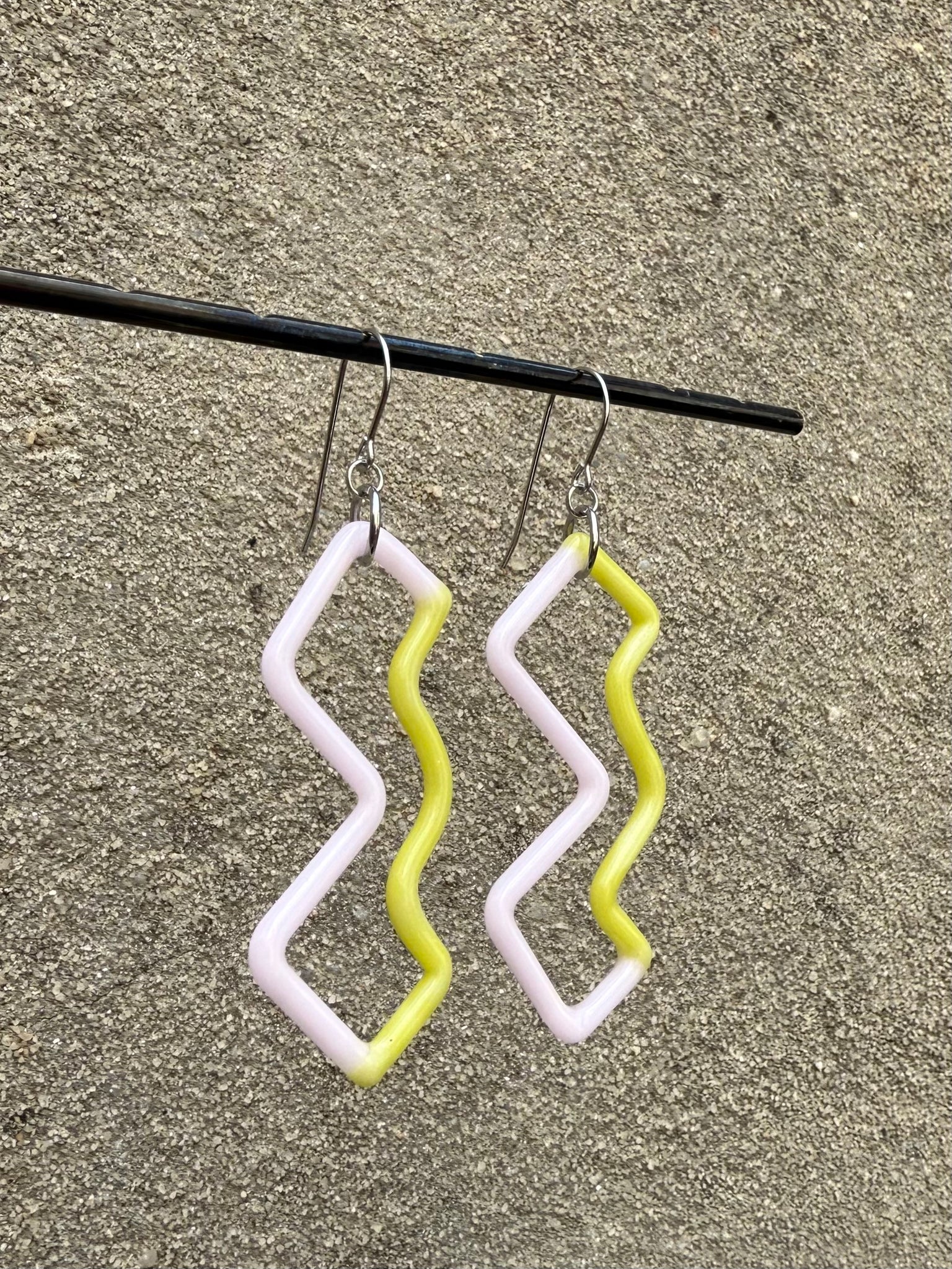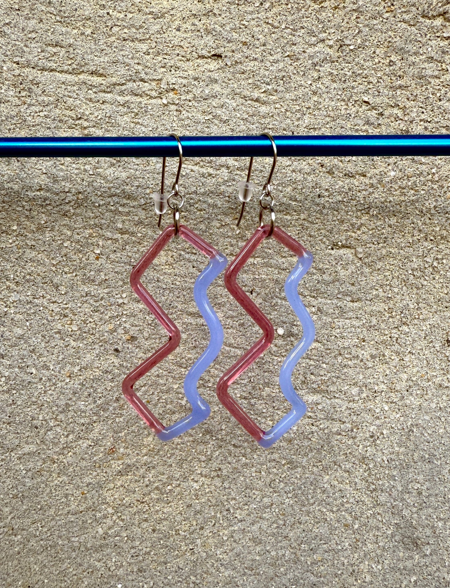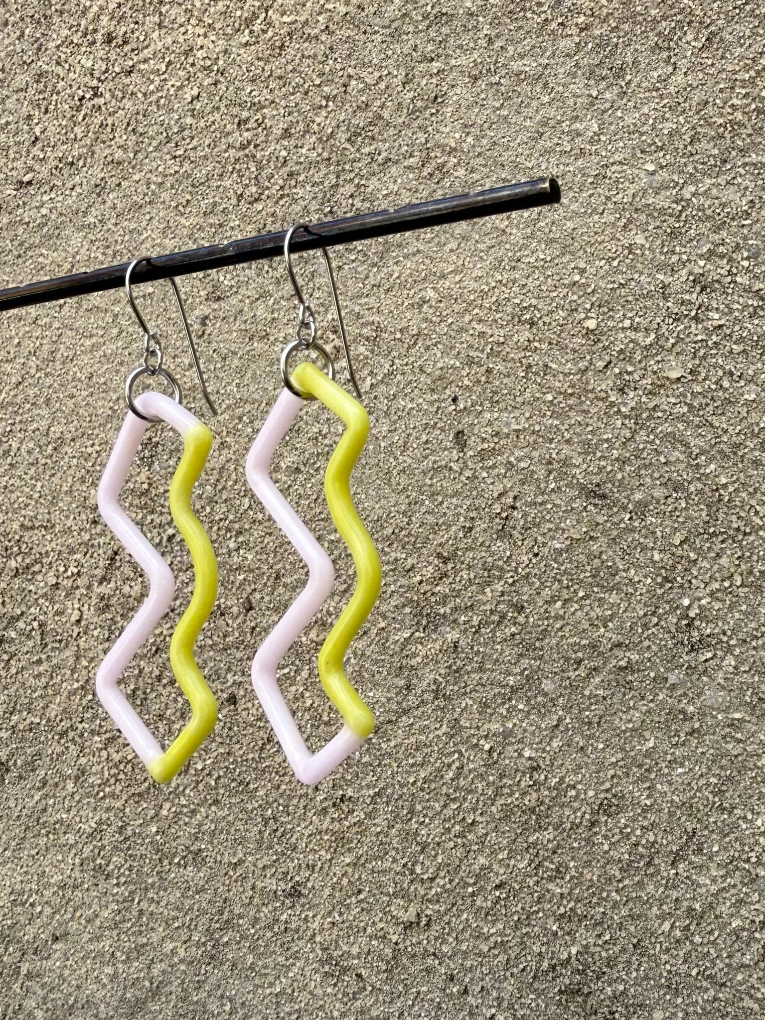 Jenna uses a type of glass called Borosilicate, which is often referred to as “hard glass.” It is a durable material that allows her to create varying sizes of work that remain lightweight and wearable.