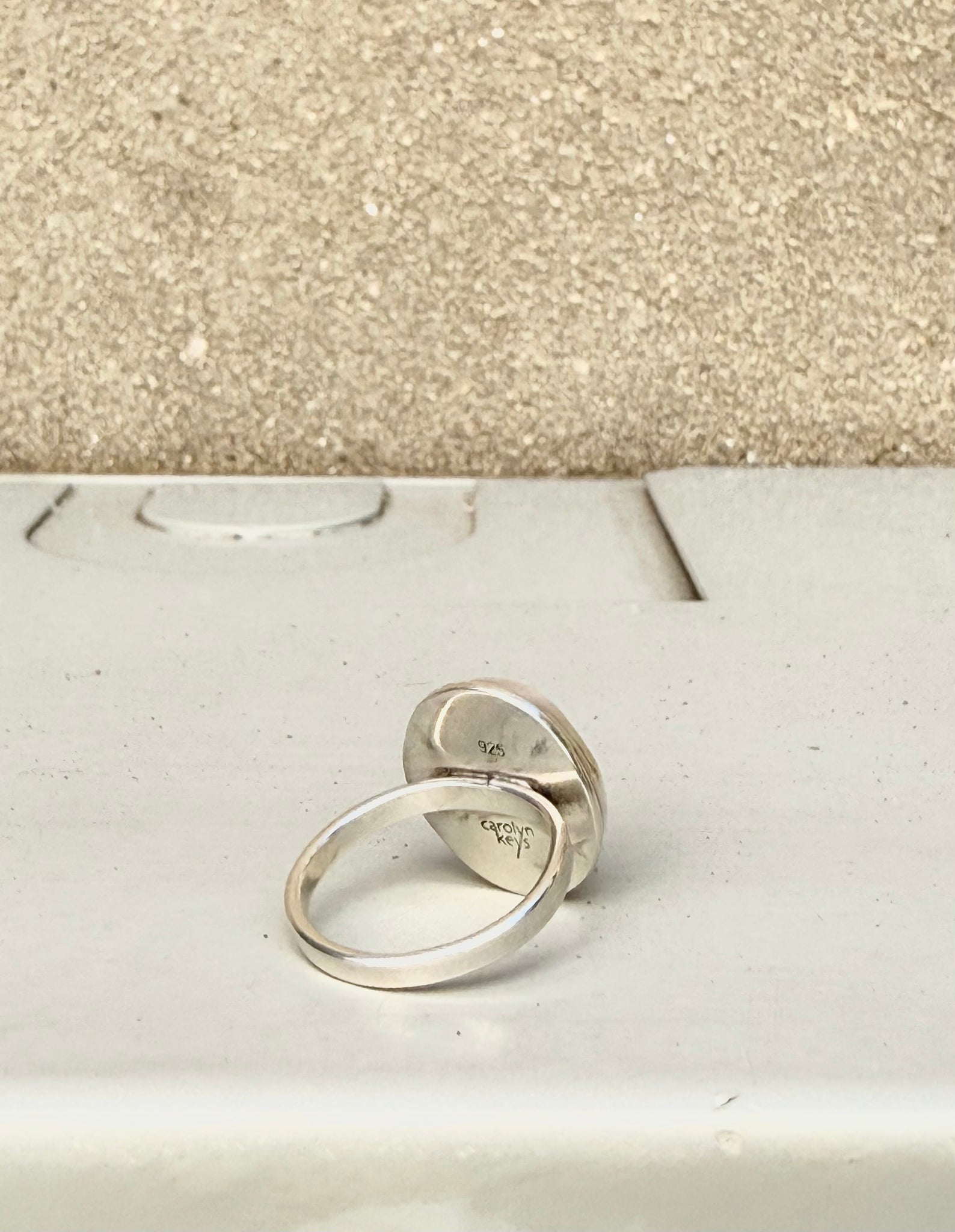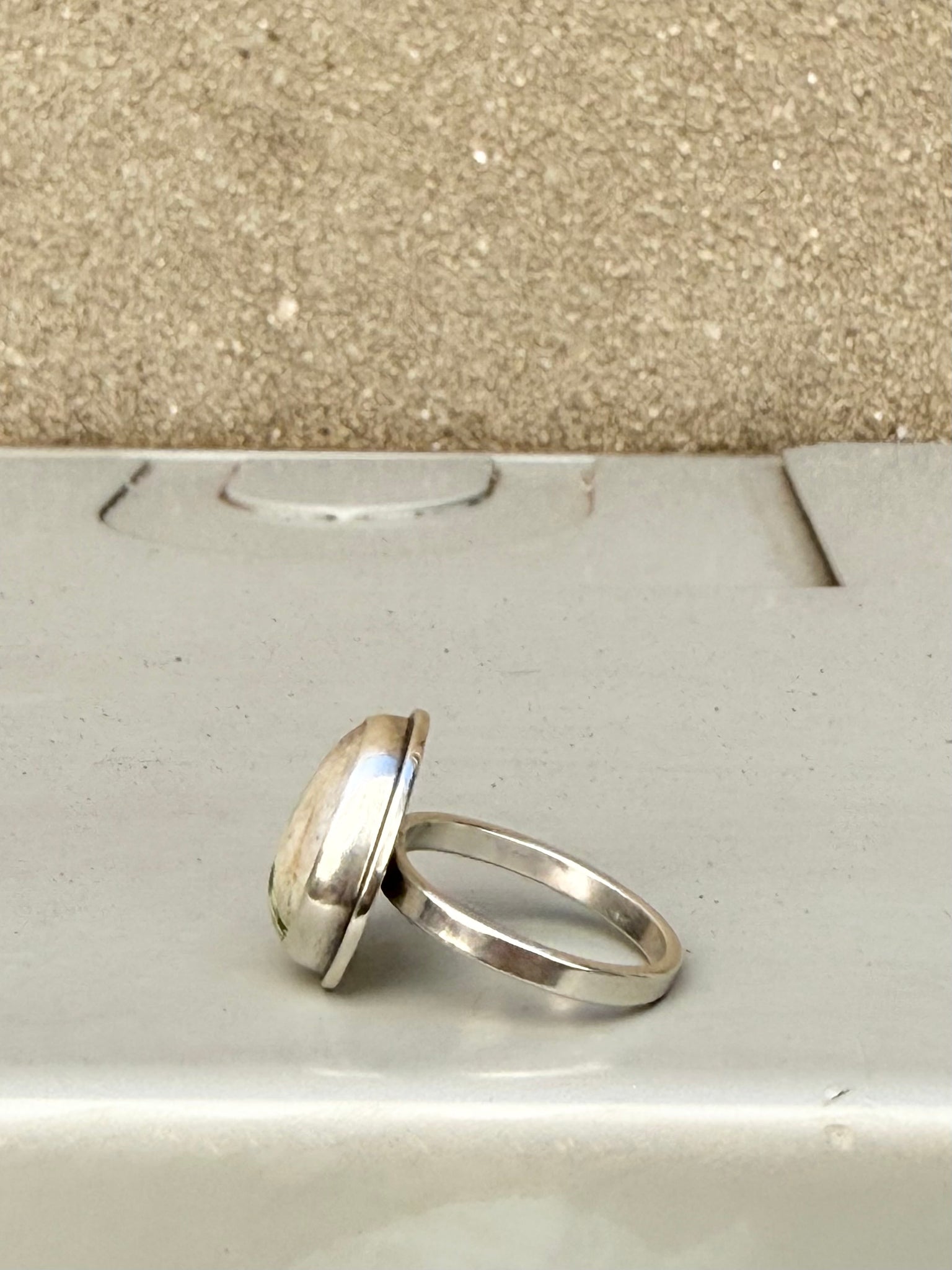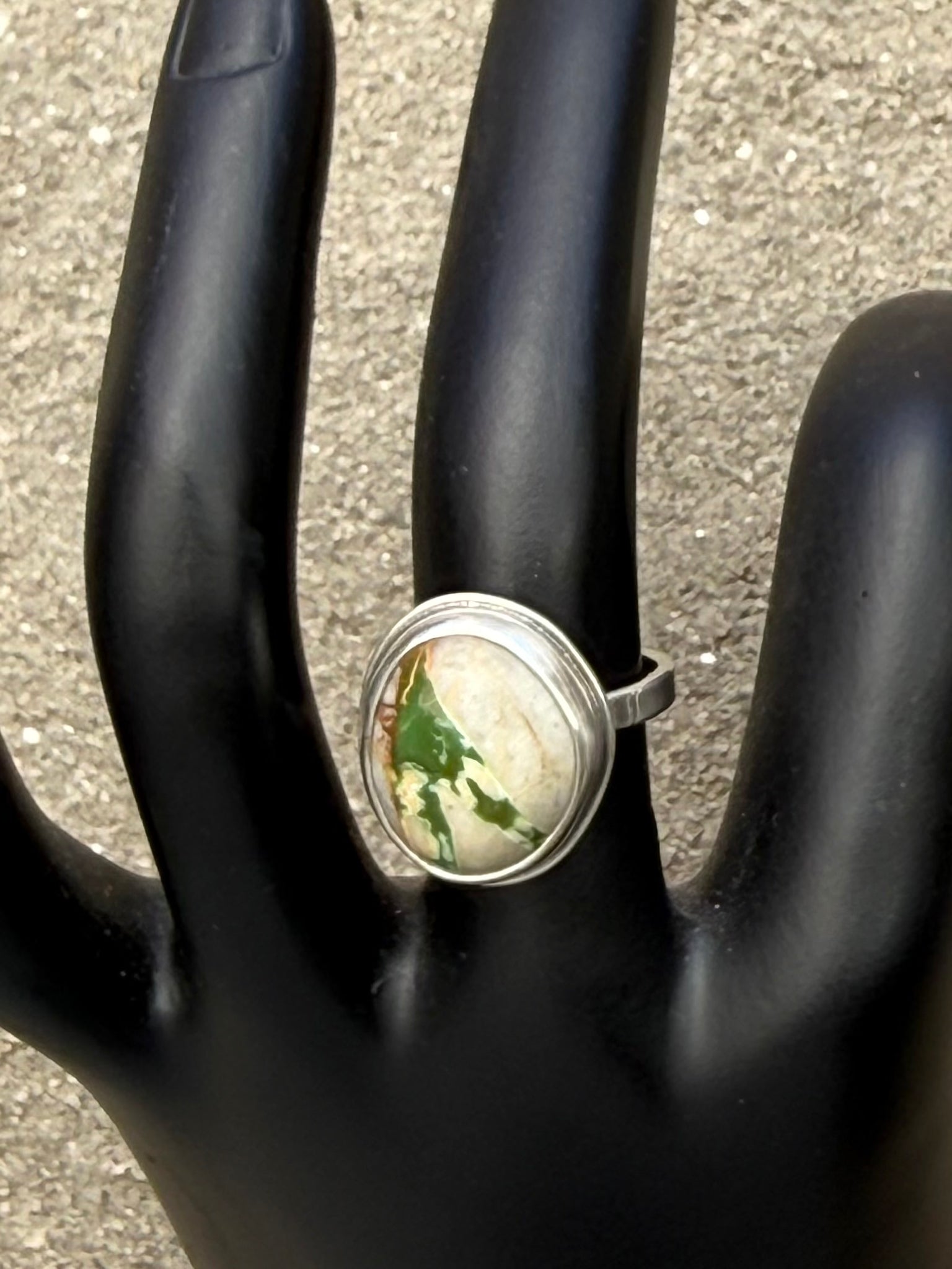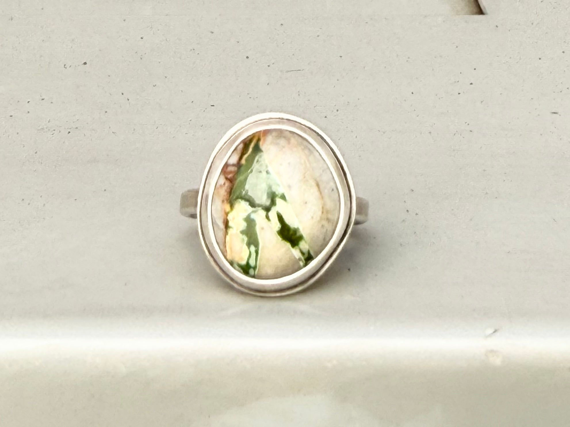 This turquoise stone features light tan colors with beautiful emerald green veining. The stone is set in a hand made thick sterling silver bezel. Great wear!