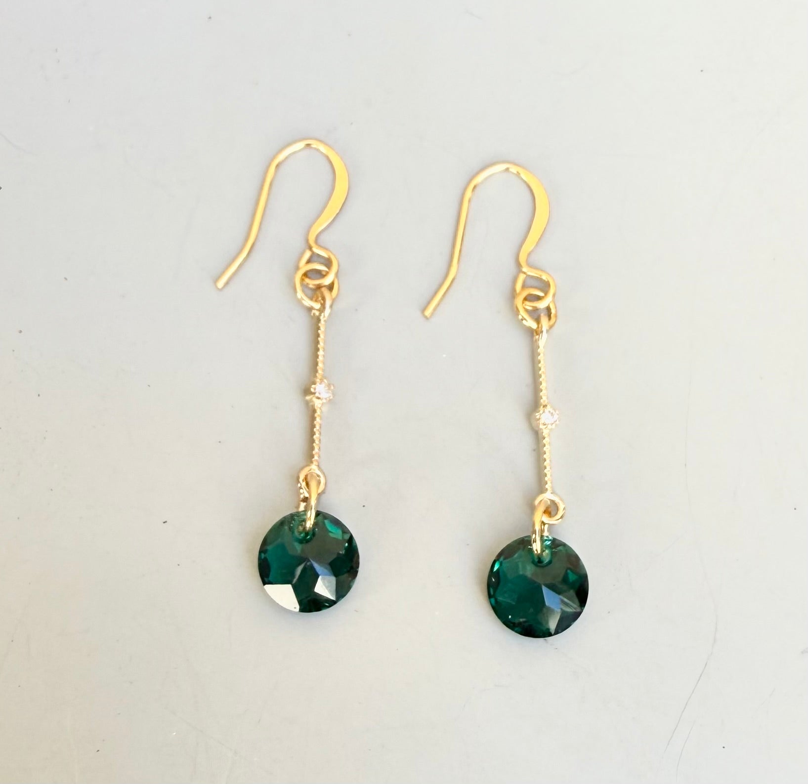 Small faceted discs of emerald Swarovski crystals on gold bars with a cubic zirconia accent.