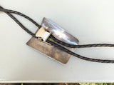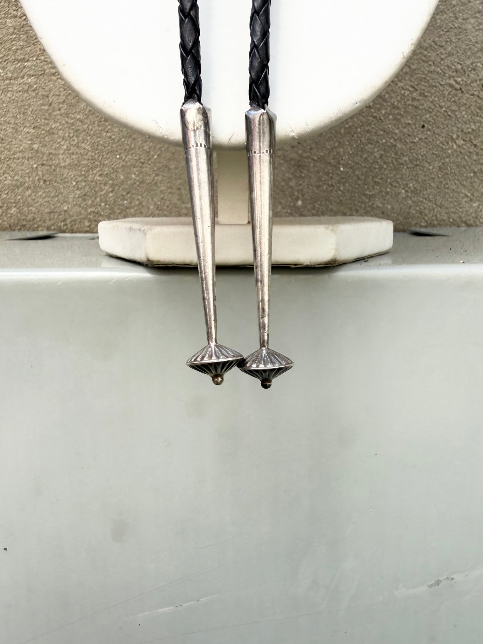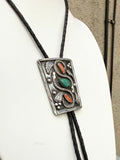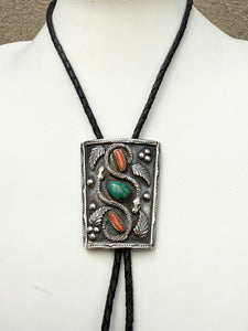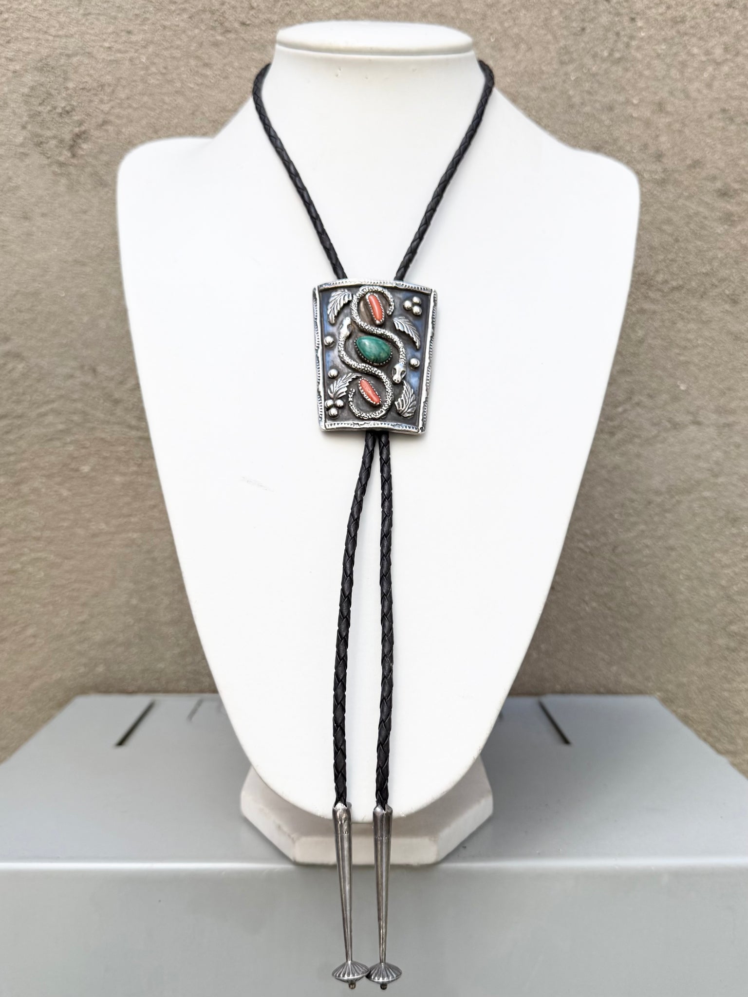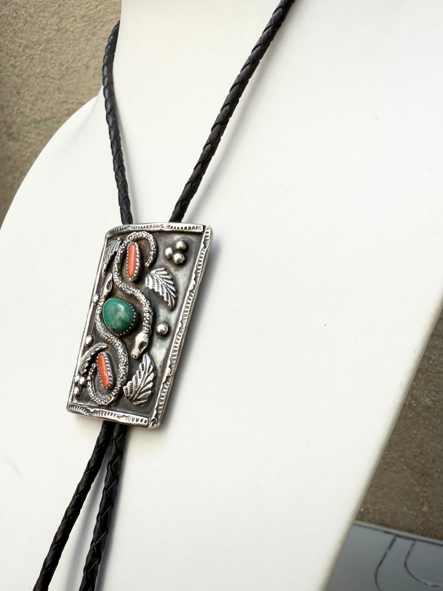 This is a kick ass bolo tie! It features a larger sterling silver focal point with cool snake and botanical etch work plus some coral and turquoise stone accents. It also features hand woven leather rope with handmade sterling pulls. Great wear!