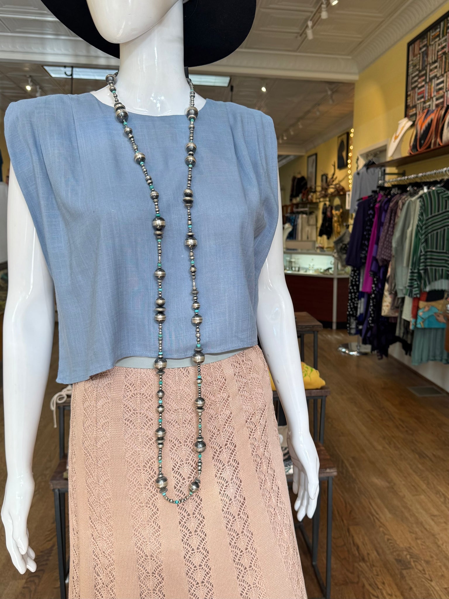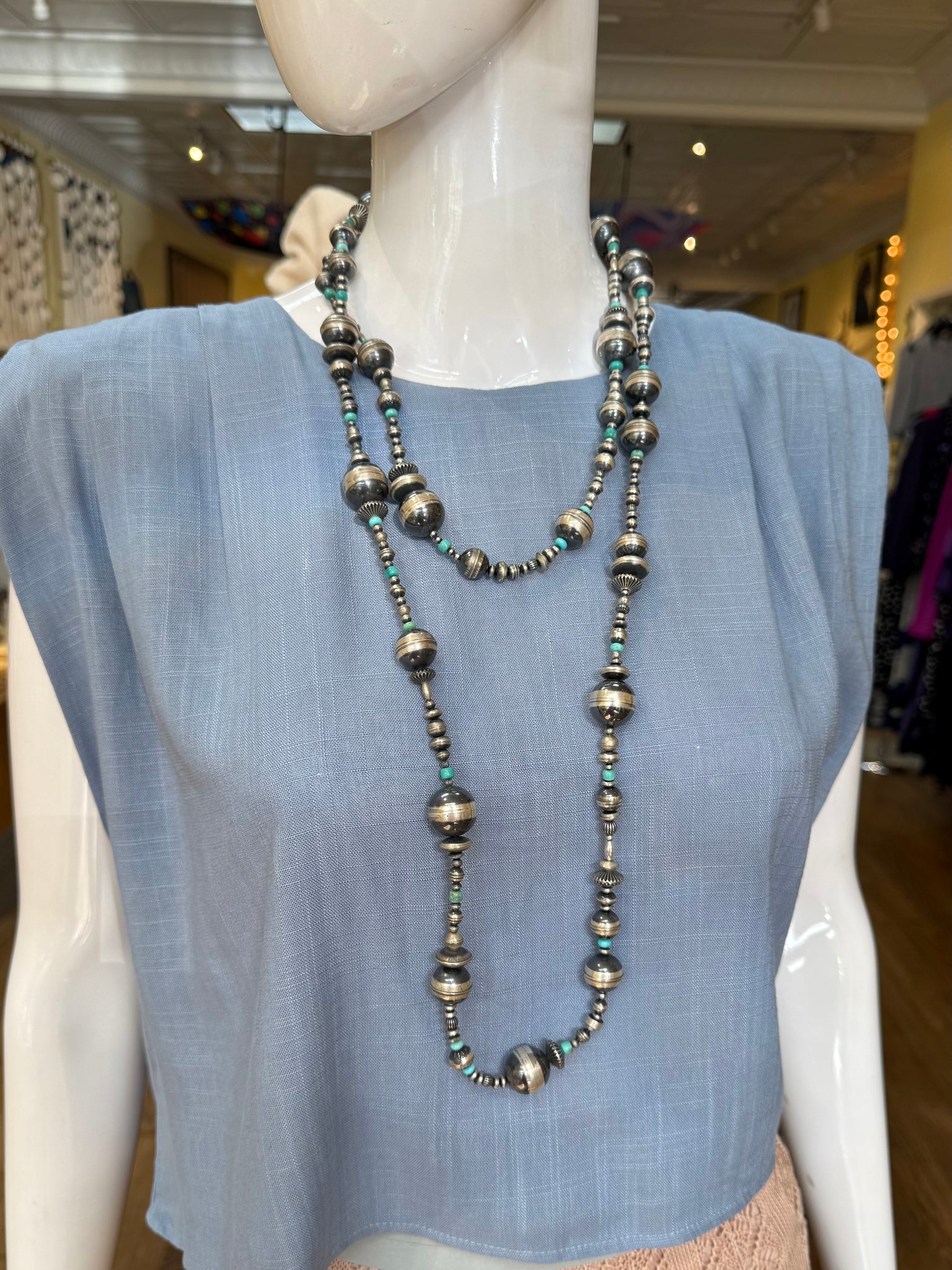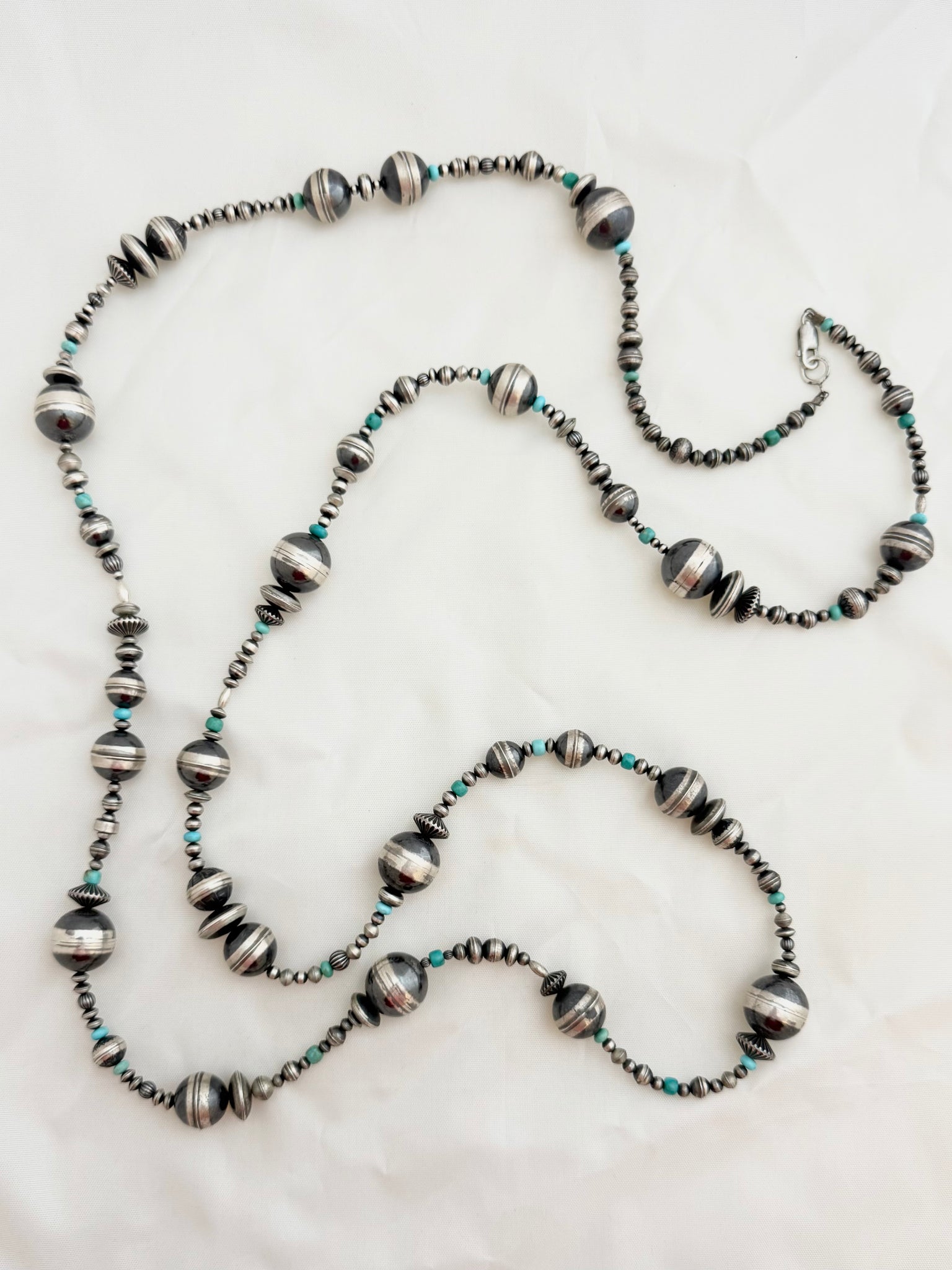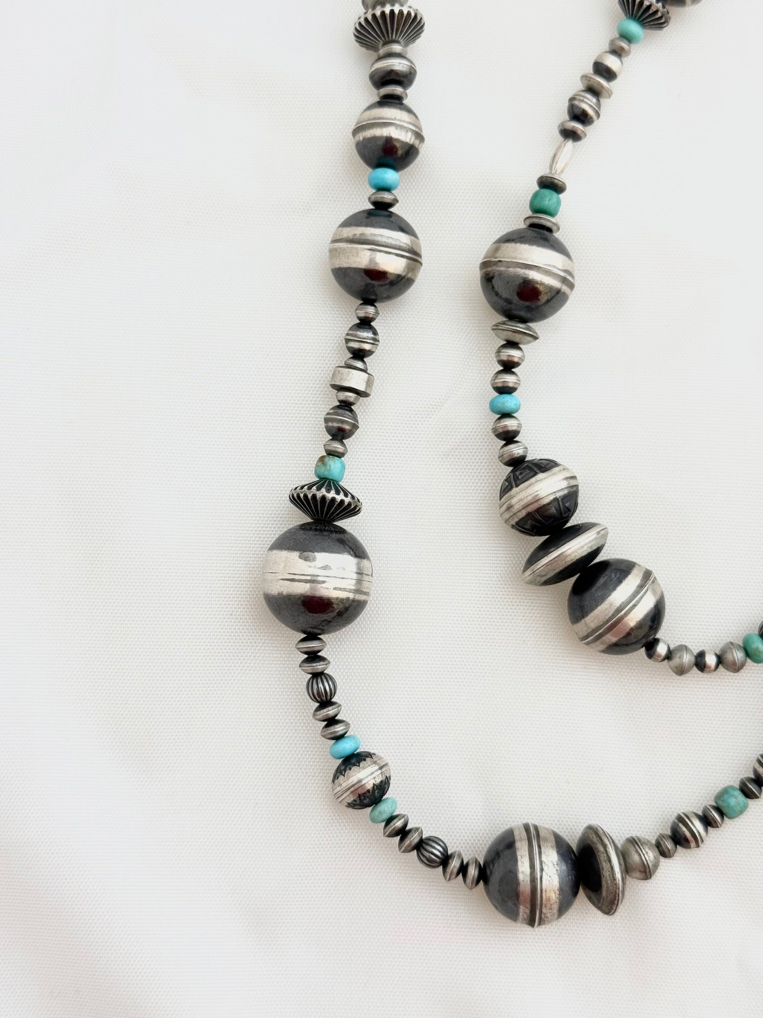 This stunning vintage necklace consists of many handmade sterling silver beads with subtle pops of turquoise spaced throughout. The craftsmanship of these beads is insane. Each bead is fabricated from a single sheet of silver and formed into a perfect sphere or disc. There is marvelous etch work on a lot of these beads and they’re finished with an oxidation that gives them a more muted tone which allows for your turquoise to pop a little more.