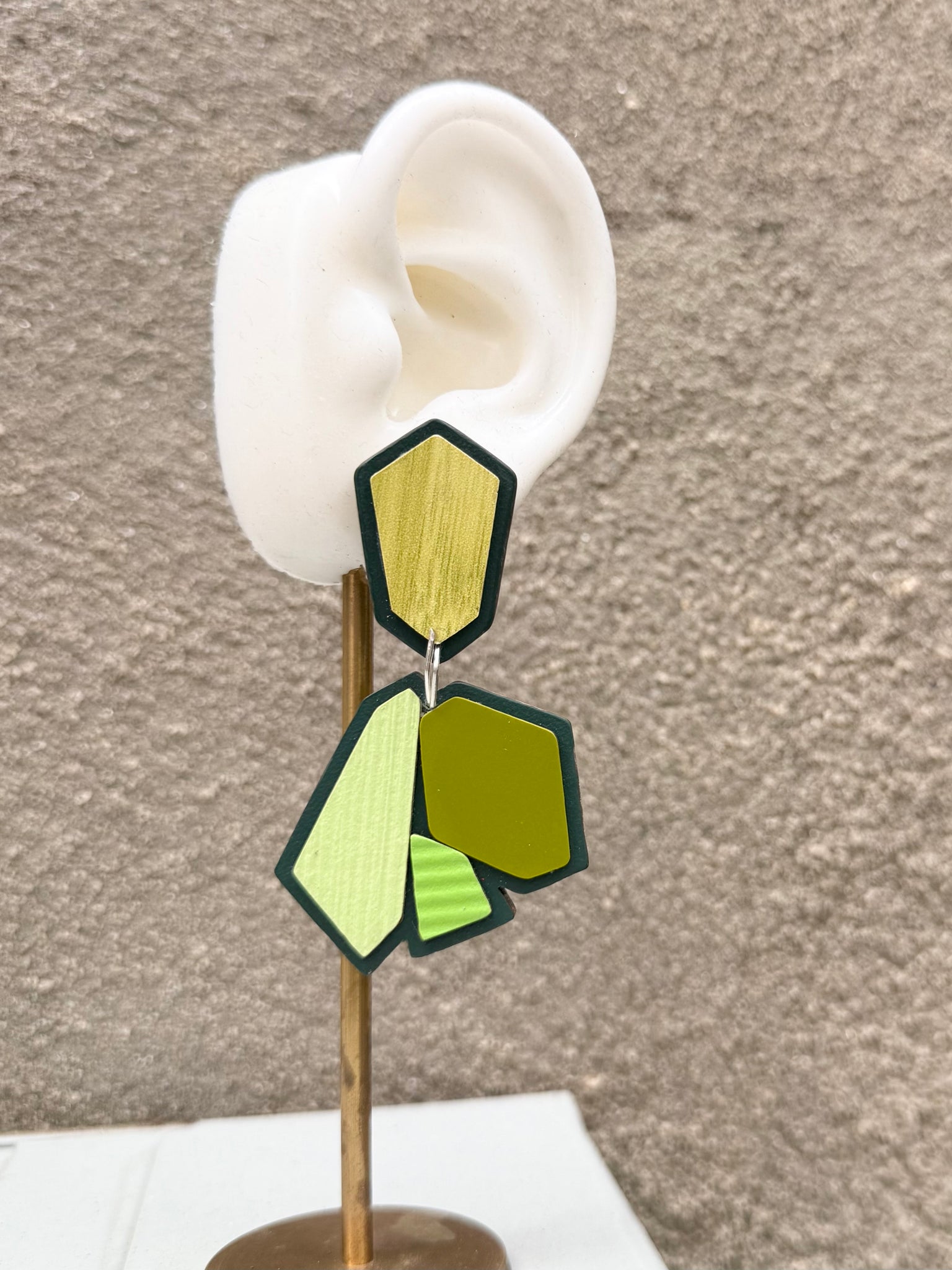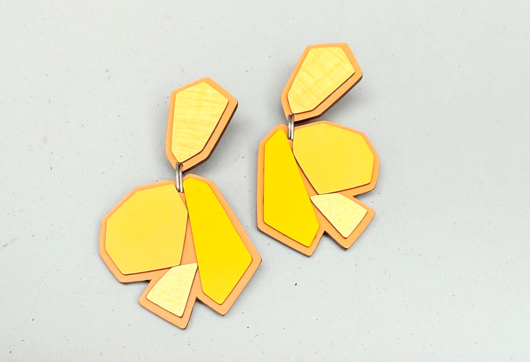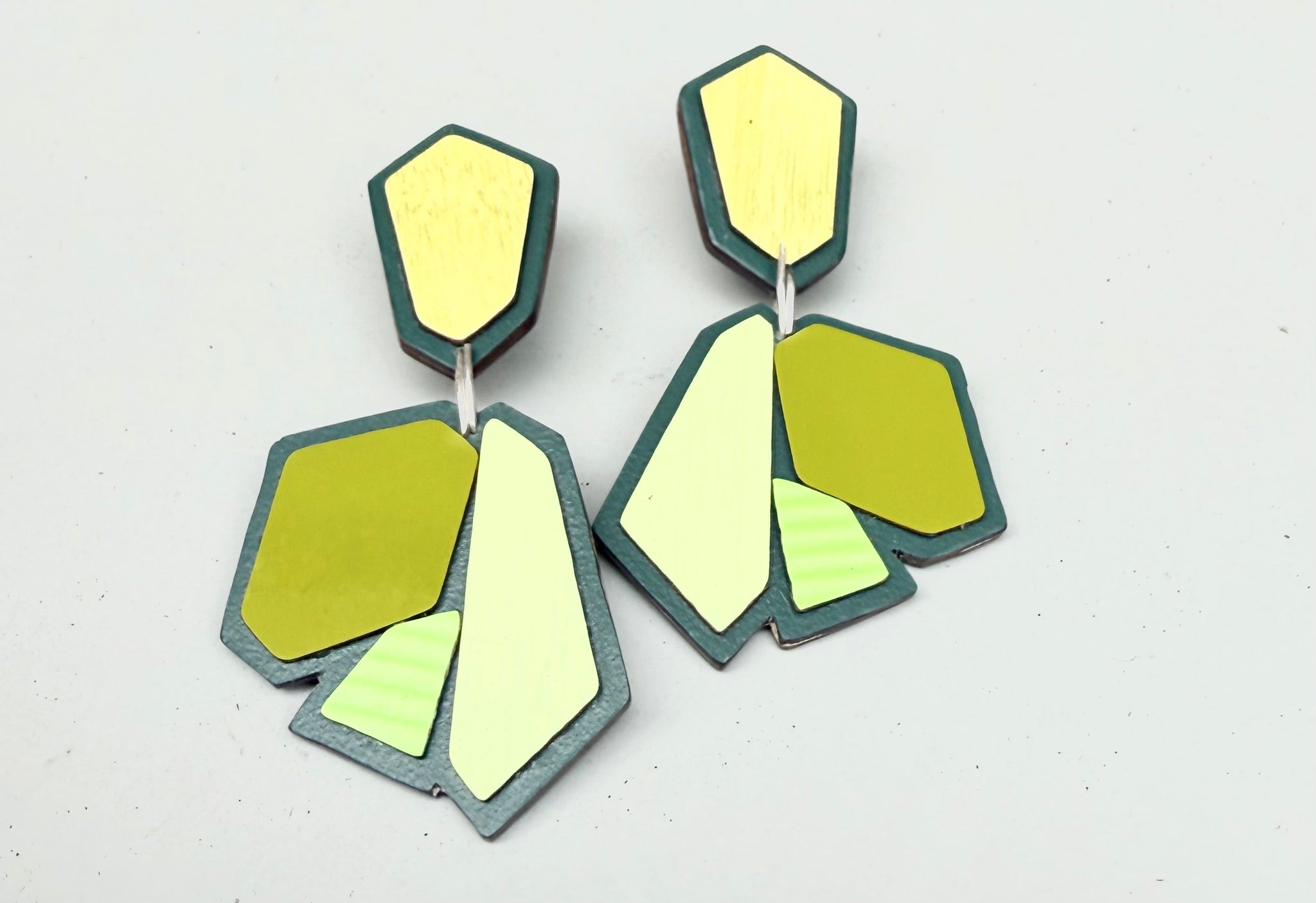 Beautifully fabricated earrings from rescued laminate samples. Great color and a very intriguing shape.