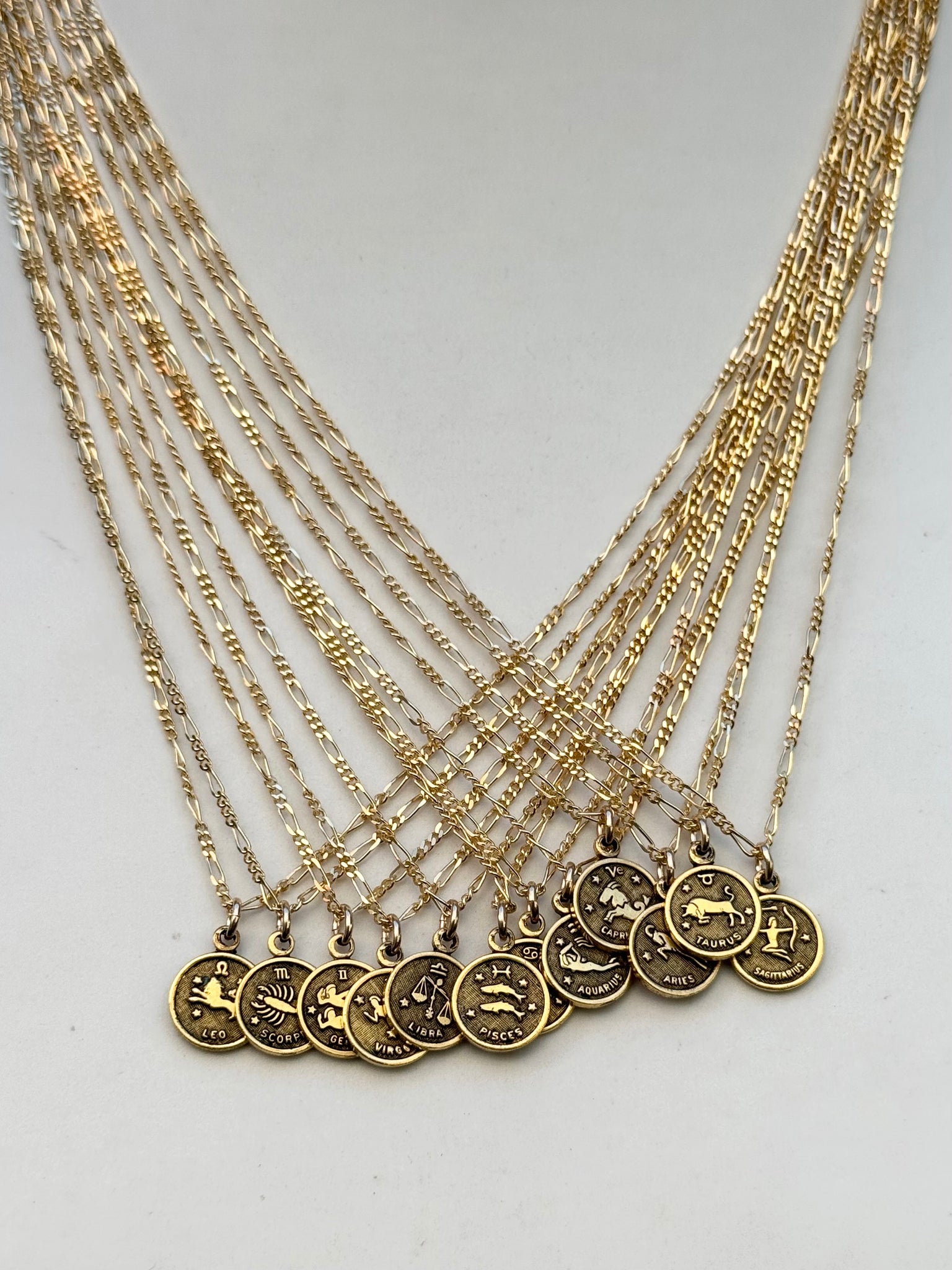 Petite, cute zodiac charms on bright gold filagro chains. Great gift ideas and a great everyday wear.