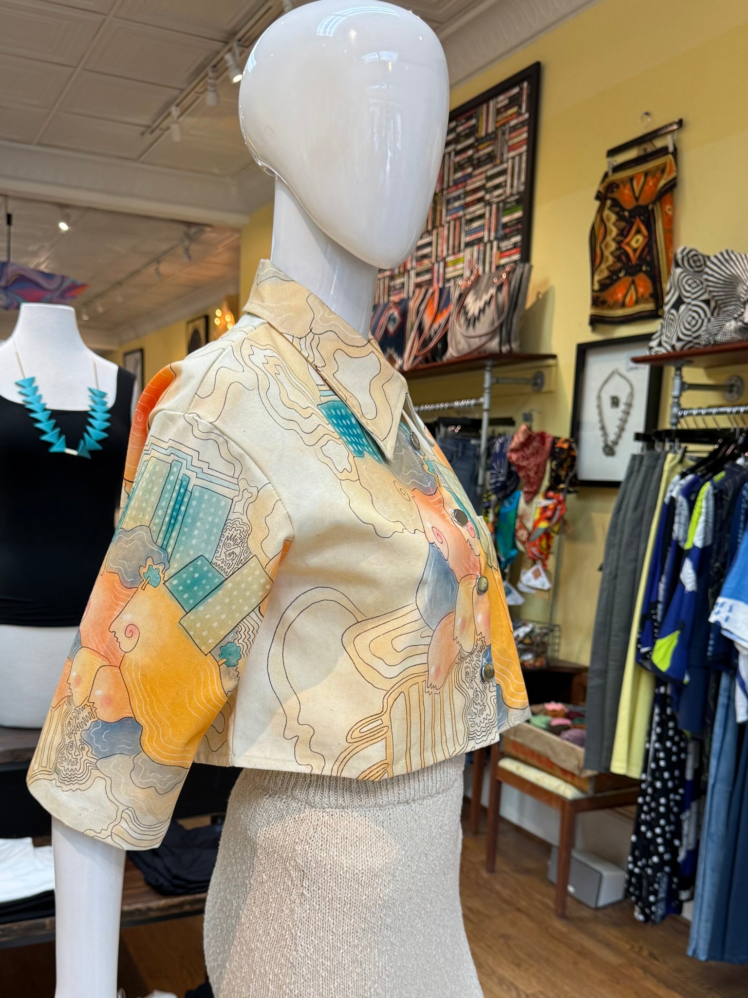 Very cool little cropped jacket featuring original artwork from Kira Bursky. You can easily style this open or closed and works wonders with your favorite high rise denim. Love the color tones in this piece!