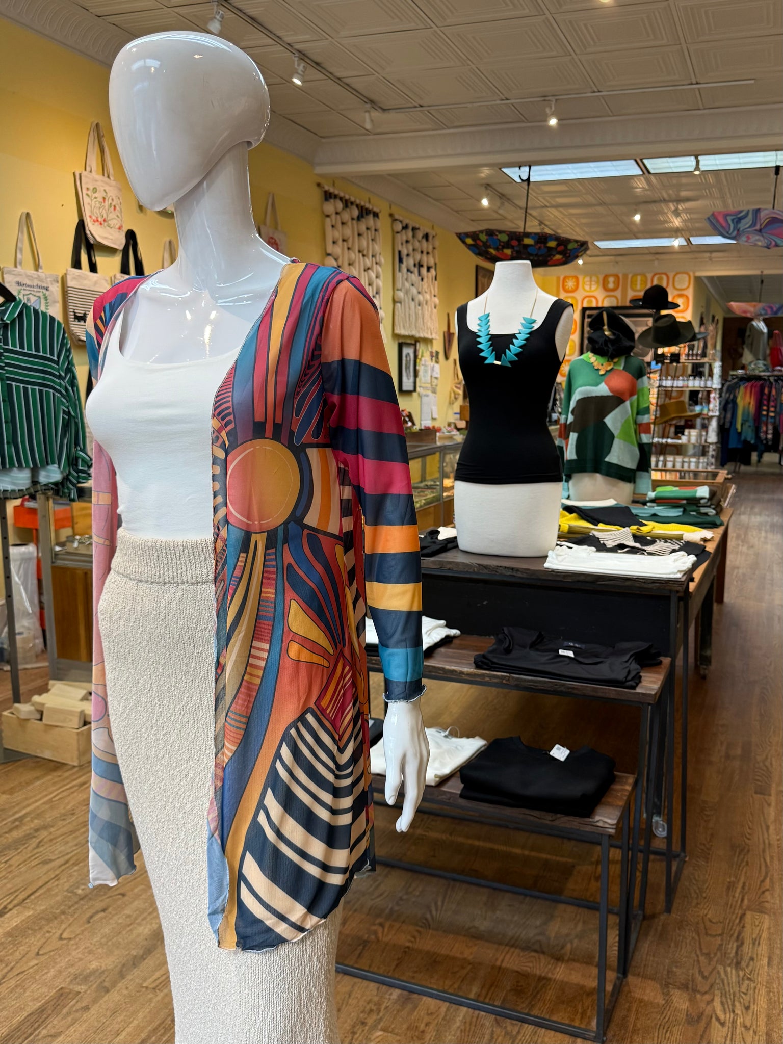 Beautiful, fun long sleeve cardigans that give majestic color and an air of mysticism to any outfit. Perfect for a layer over any tank top or swimwear. These cardigans feature all original artwork from Greenville artist Kira Bursky.