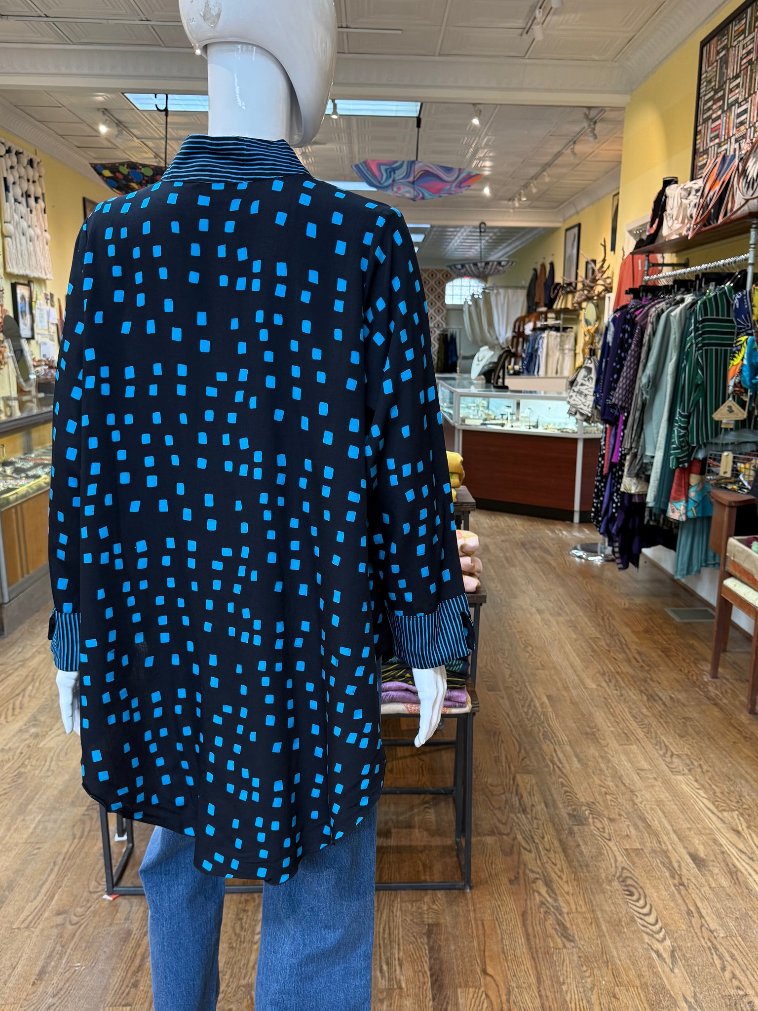Loose and flowing button up with a beautiful blend of colors and pattern. Try it with fitted or relaxed fit bottoms; we like it with either. So much cool detailing in the pattern of this piece plus it has a little storage space with some side slip pockets.