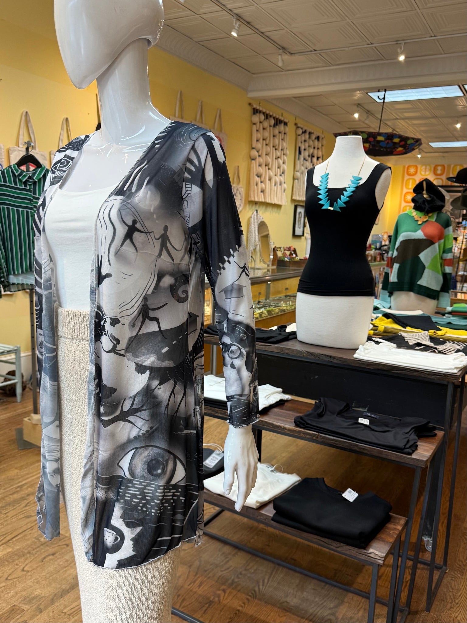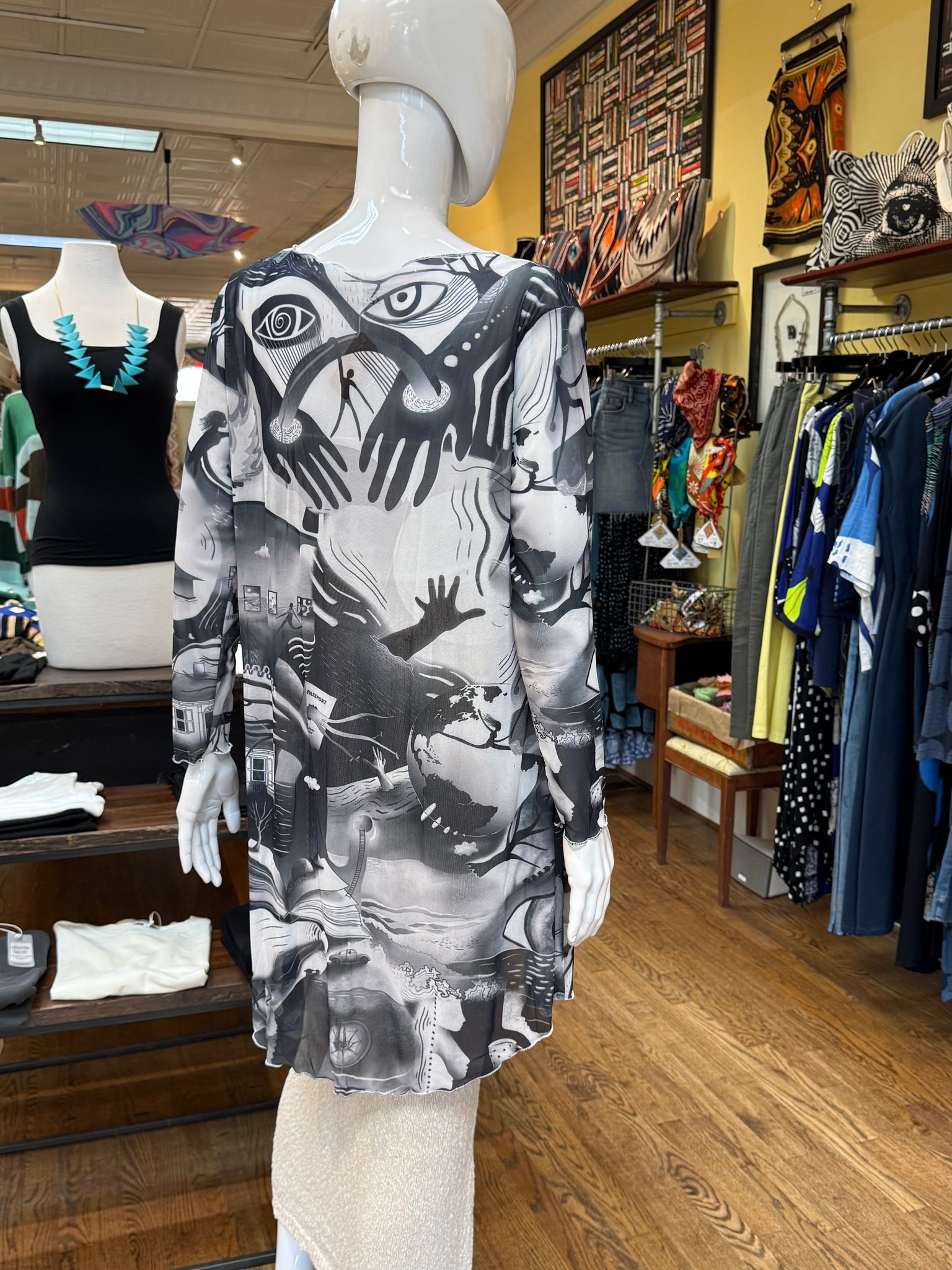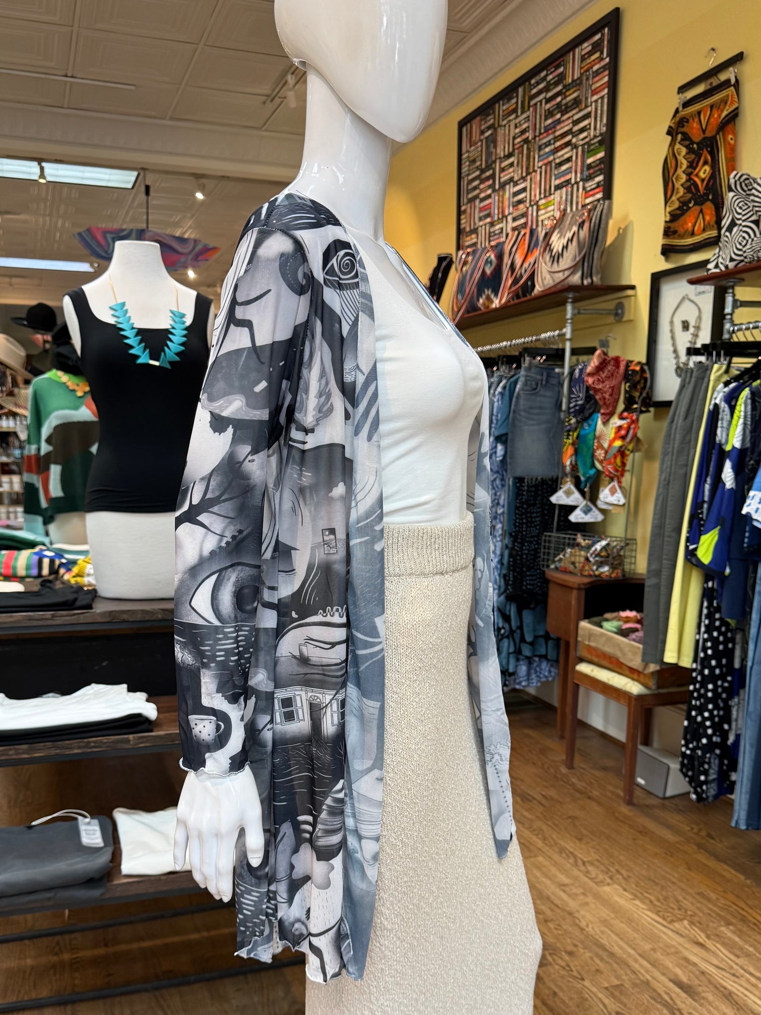 Beautiful, fun long sleeve cardigans that give majestic color and an air of mysticism to any outfit. Perfect for a layer over any tank top or swimwear. These cardigans feature all original artwork from Greenville artist Kira Bursky.