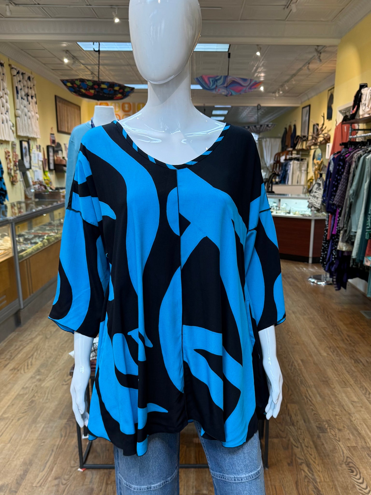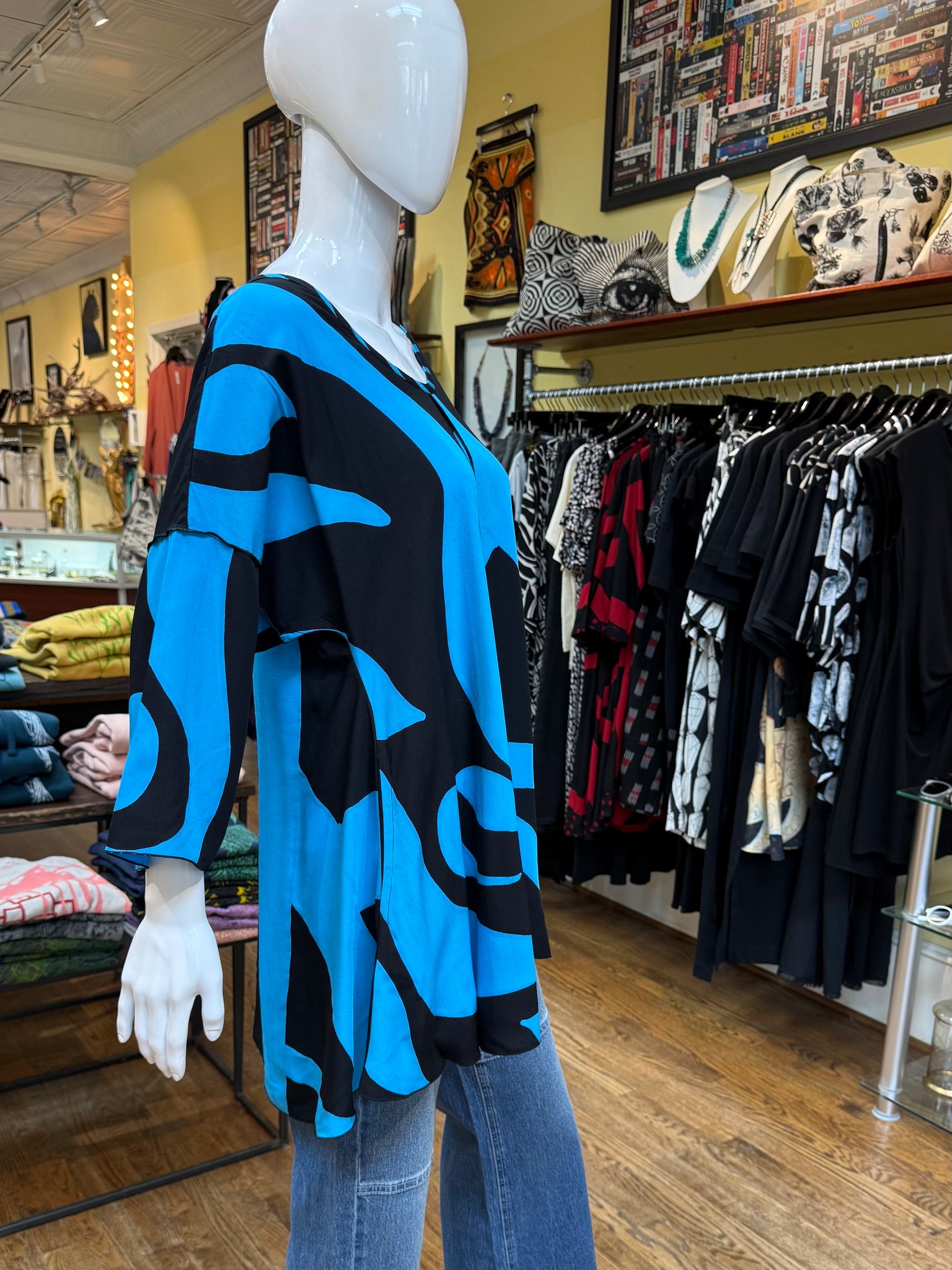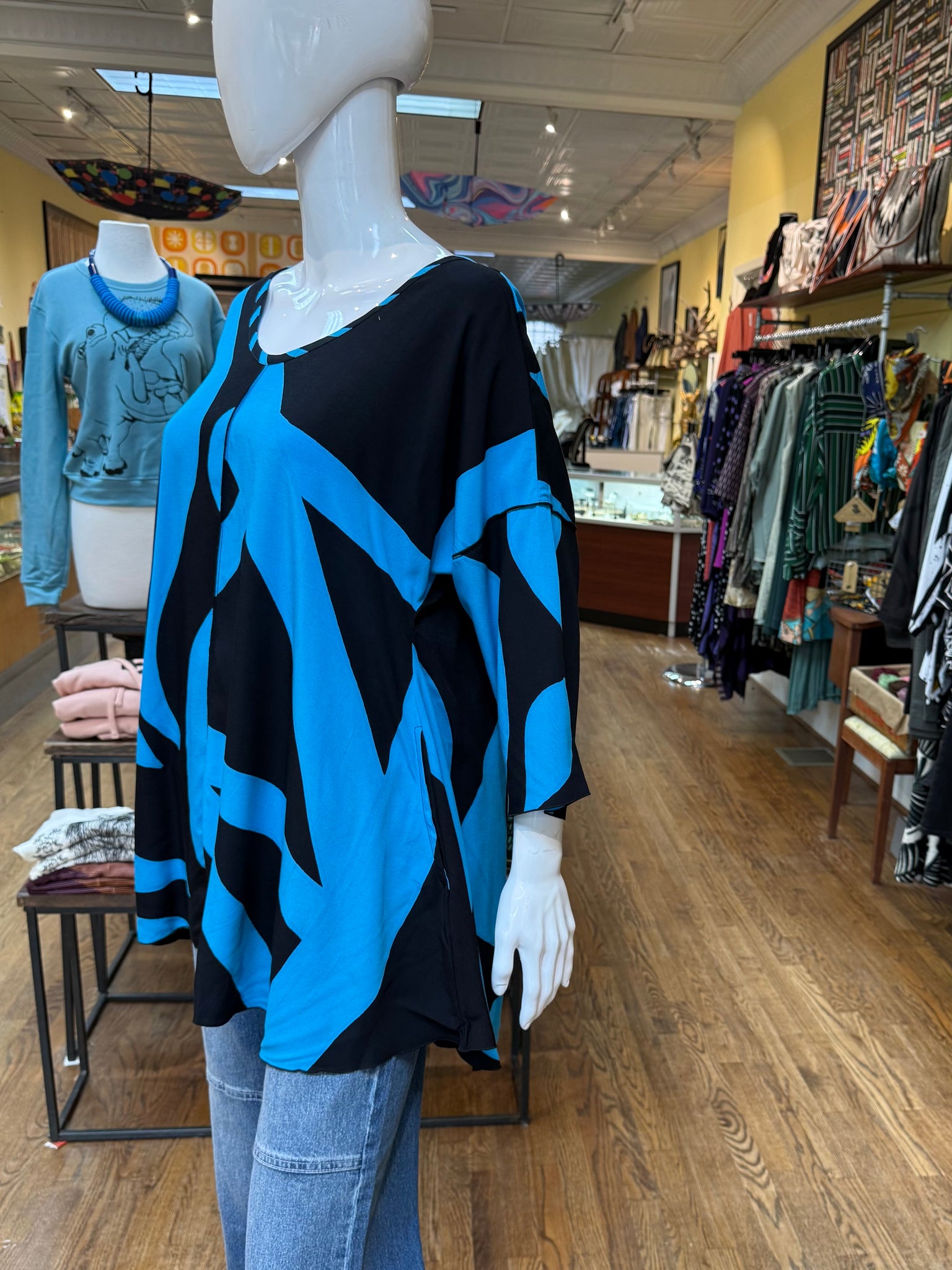 Loose and flowing pullover top with a beautiful blend of colors and pattern. Try it with fitted or relaxed fit bottoms; we like it with either. So much cool detailing in the pattern of this piece plus it has a little storage space with some side slip pockets.