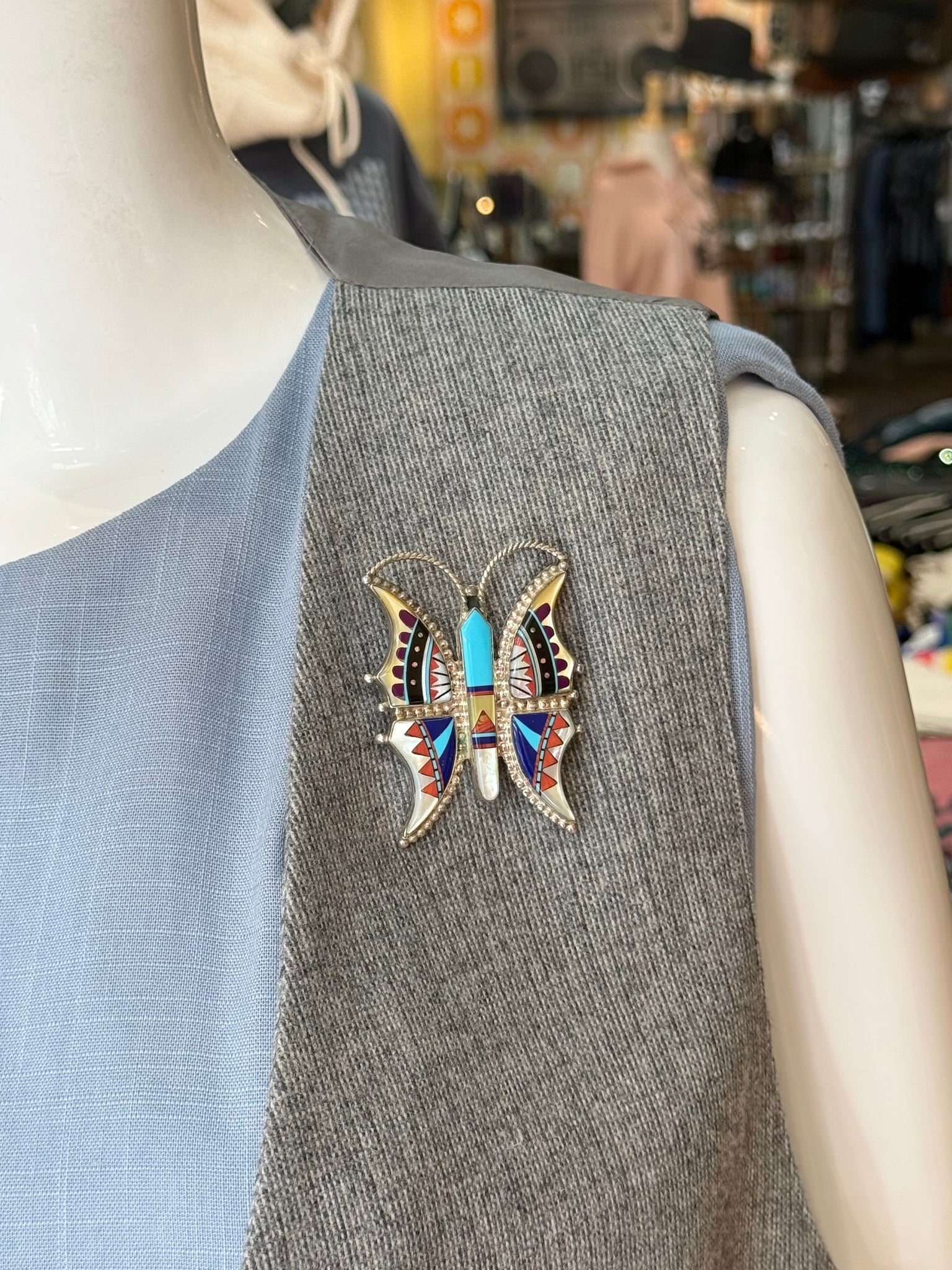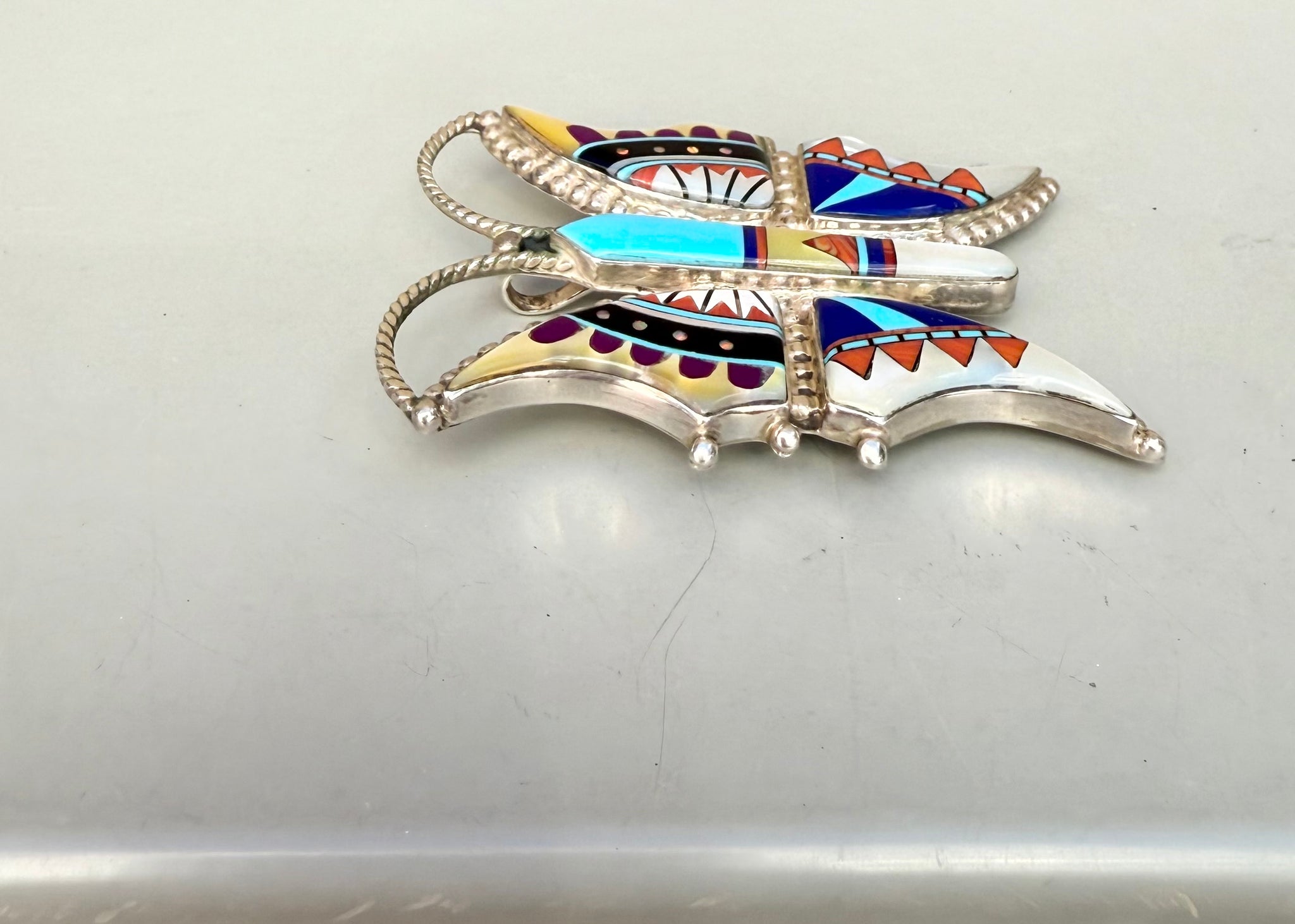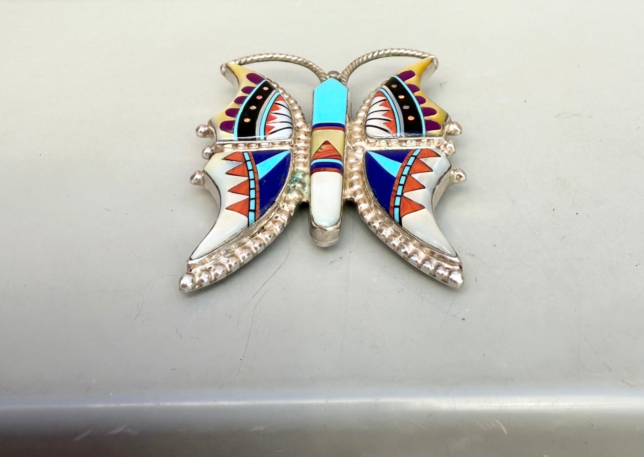 Wow, this is one gorgeous butterfly! This brooch features wonderful sterling silver metalwork and a vast array of beautiful gemstones. This vintage piece has all the makings of an heirloom that can be passed down through generations. This is a great wear on any lapel!