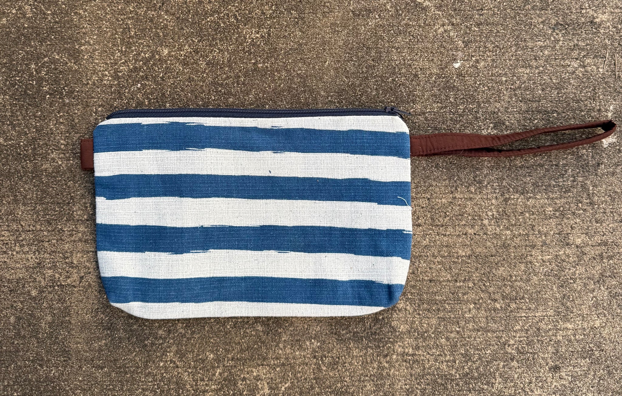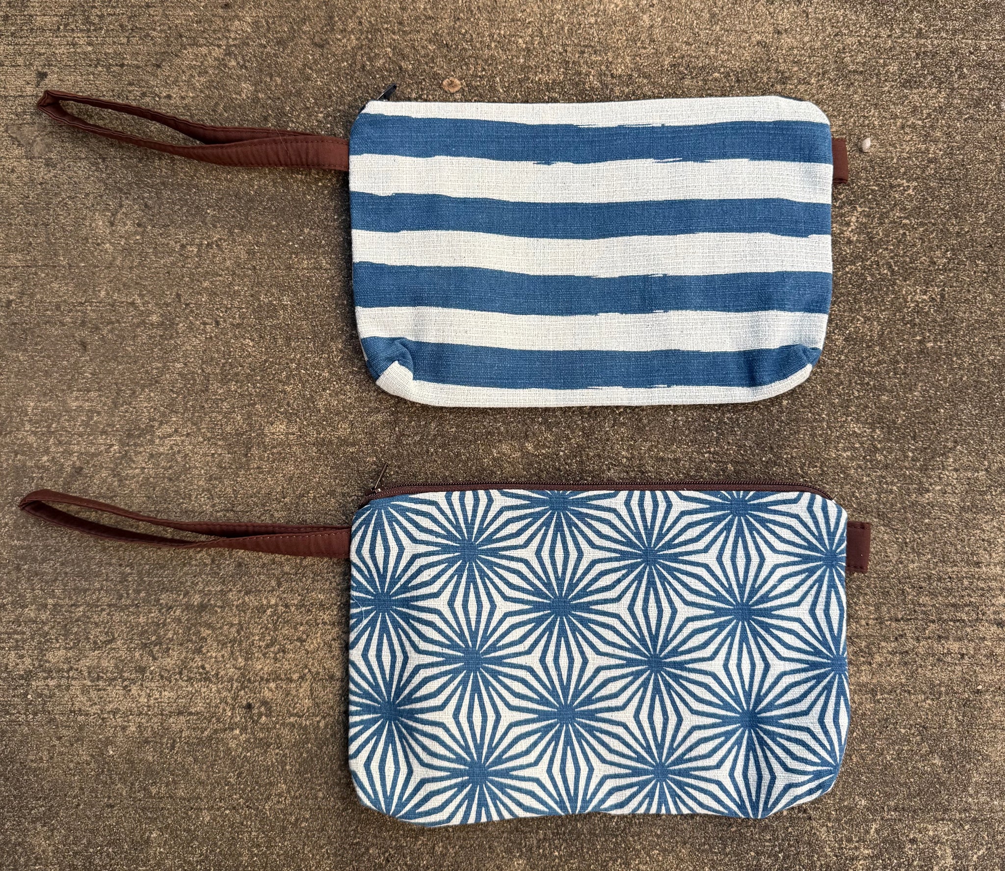 Really pretty indigo dyed cotton makeup bags with a carry strap and a fun lining.