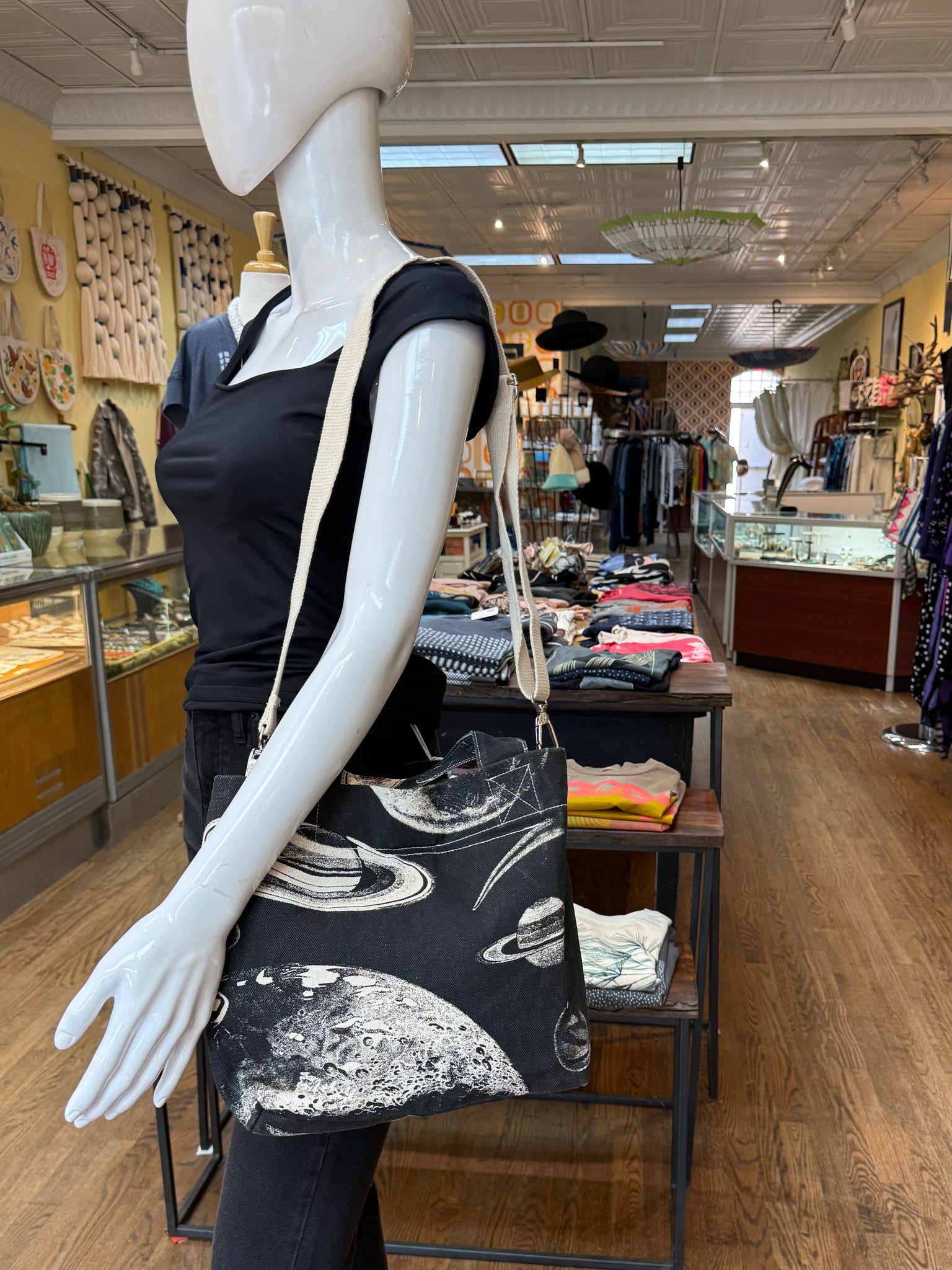 Beautifully printed canvas cotton with an easy to adjust crossbody strap and a handle carry option. You can remove the longer strap too if you want to carry as a handbag. Designed with one interior zippered pocket that’s ample size for phones, notepads, etc. Also, there is a one button closure option.