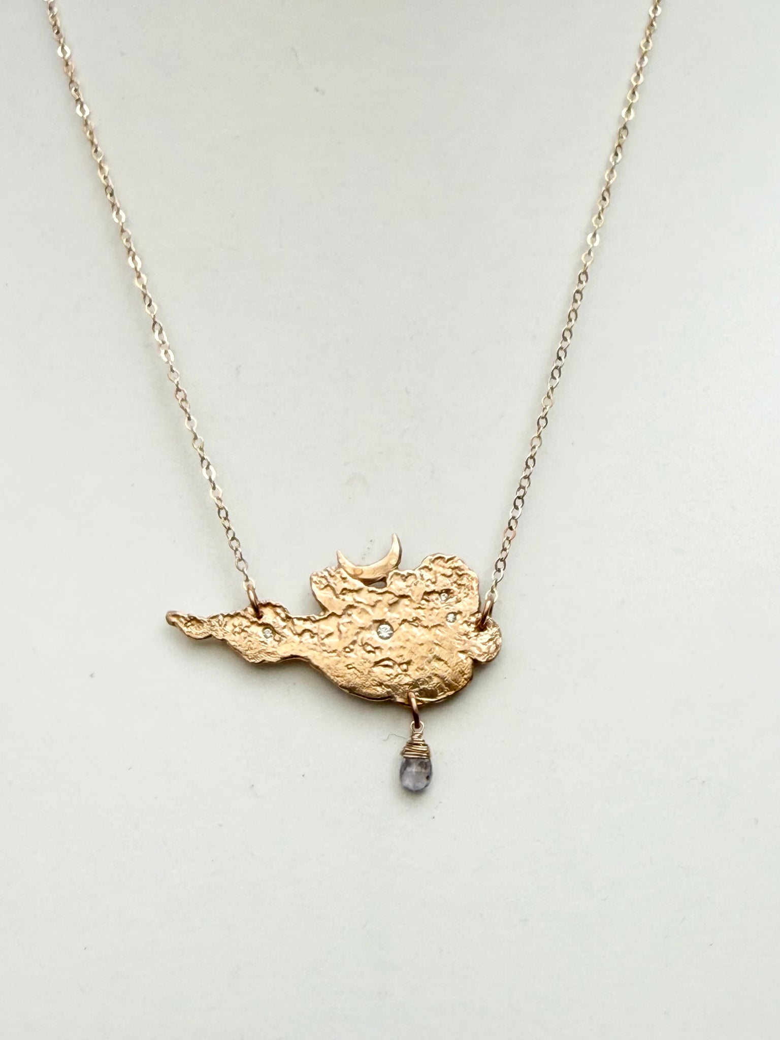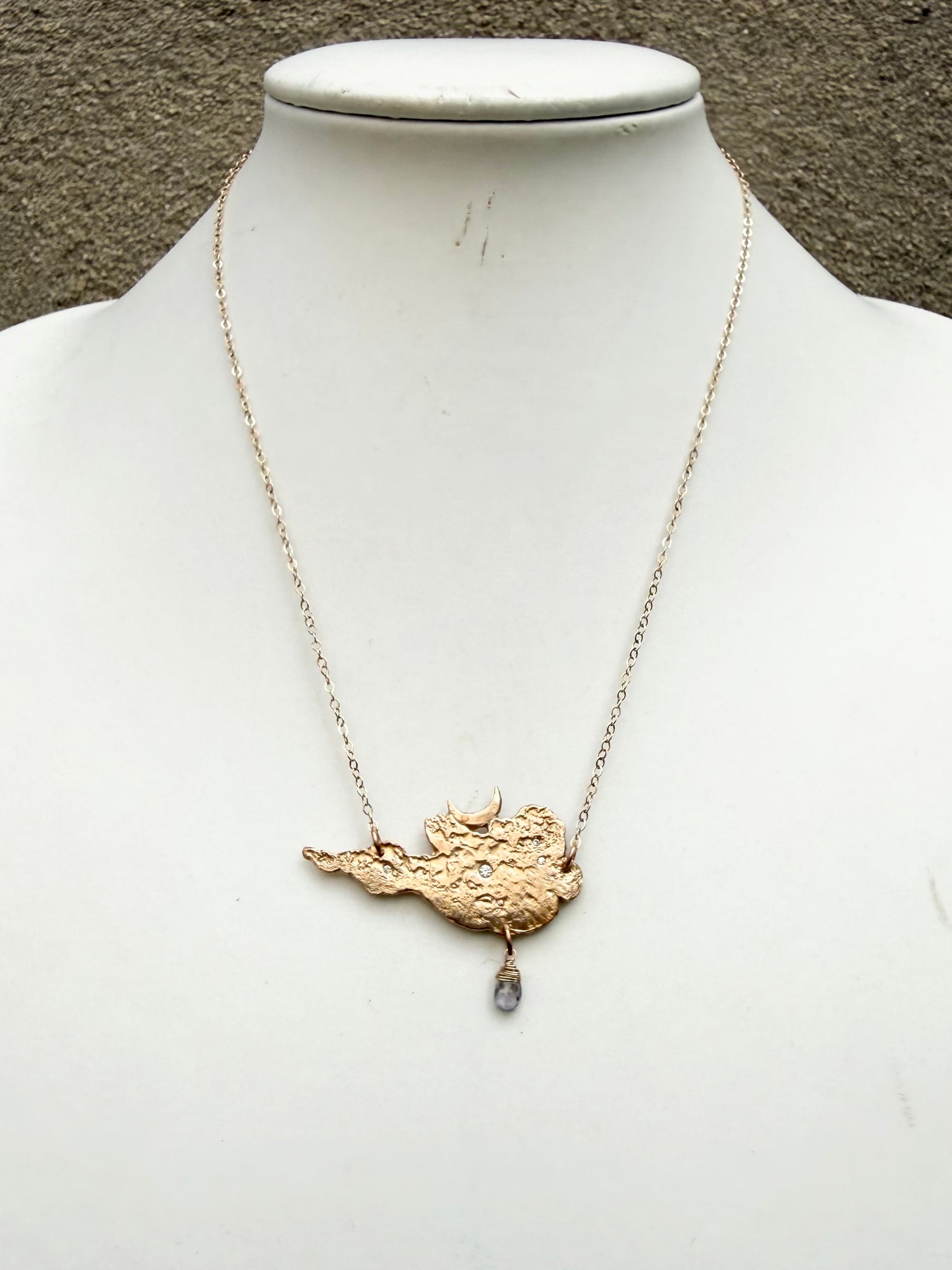 Handmade bronze cloudscape with a petite sapphire accent. Cool shape and comes on an easy adjustable chain for any layering ideas.