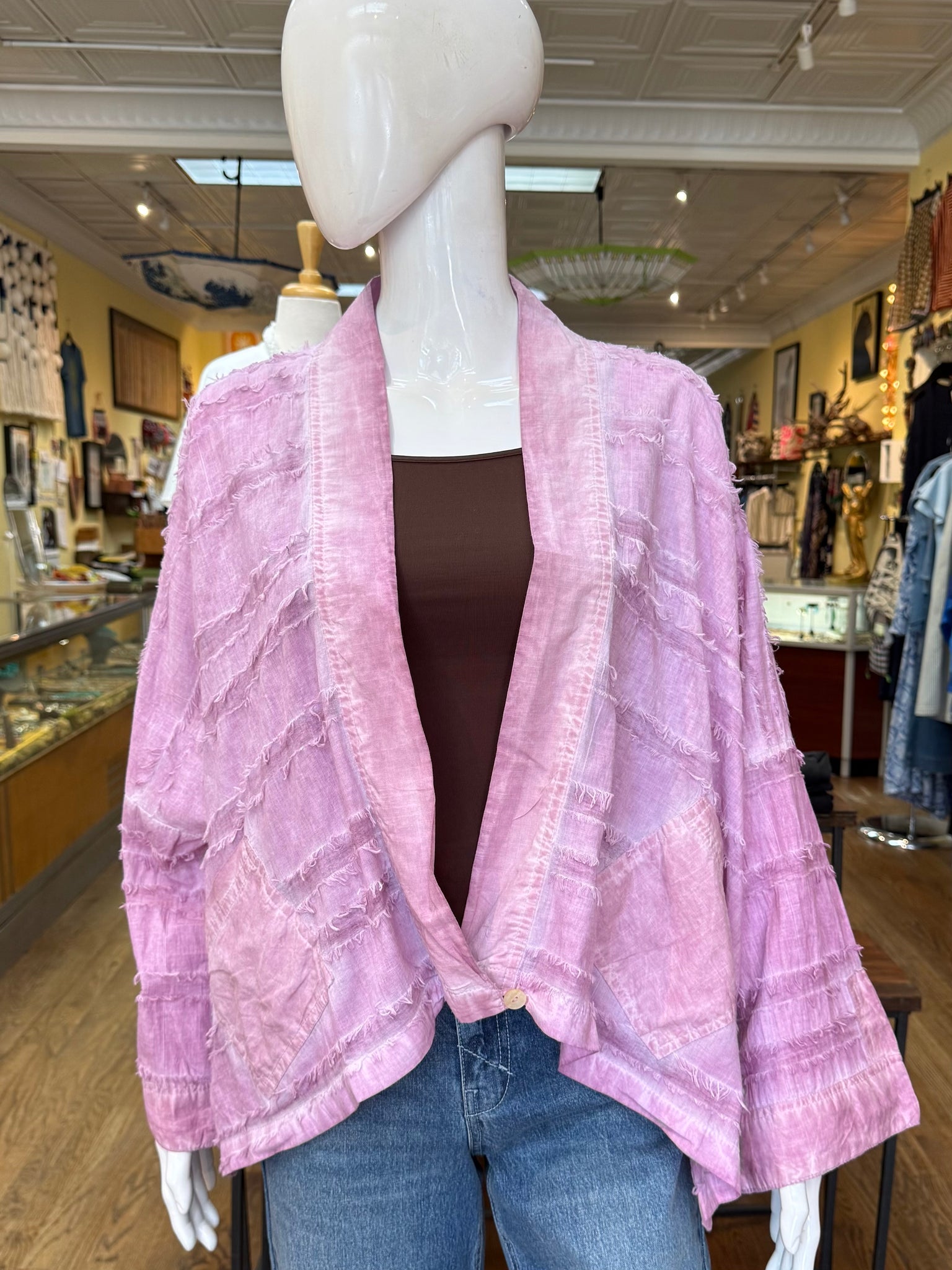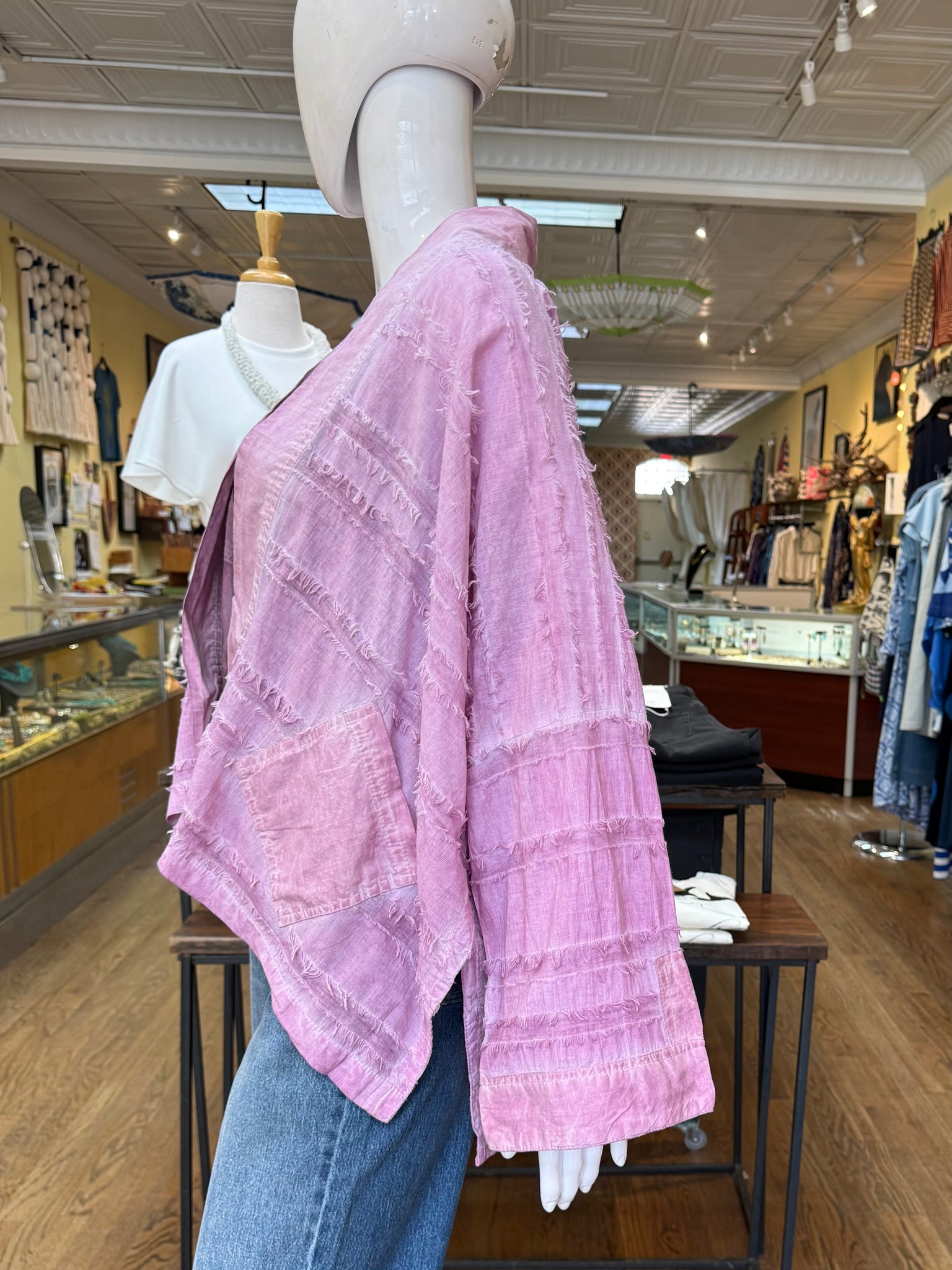 This oversized open blouse makes for a beautiful pink cover that is very lightweight. There is an optional button at the waist and two front pockets. The fit is full and very relaxed and there is frilled fabric detailing throughout.