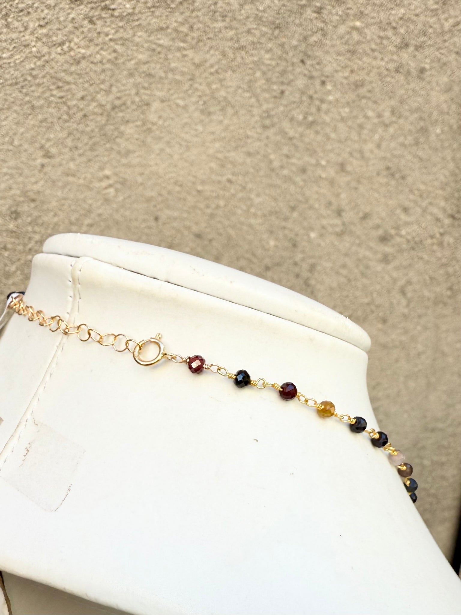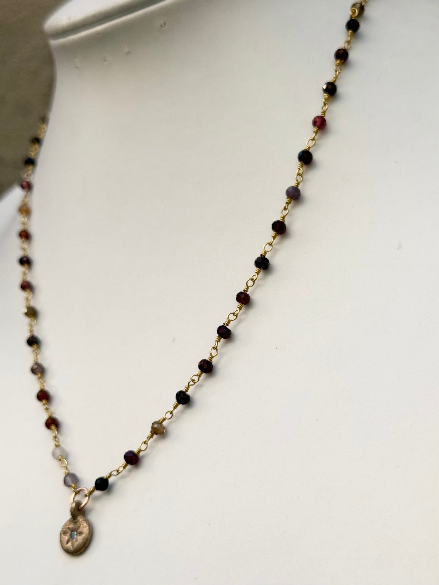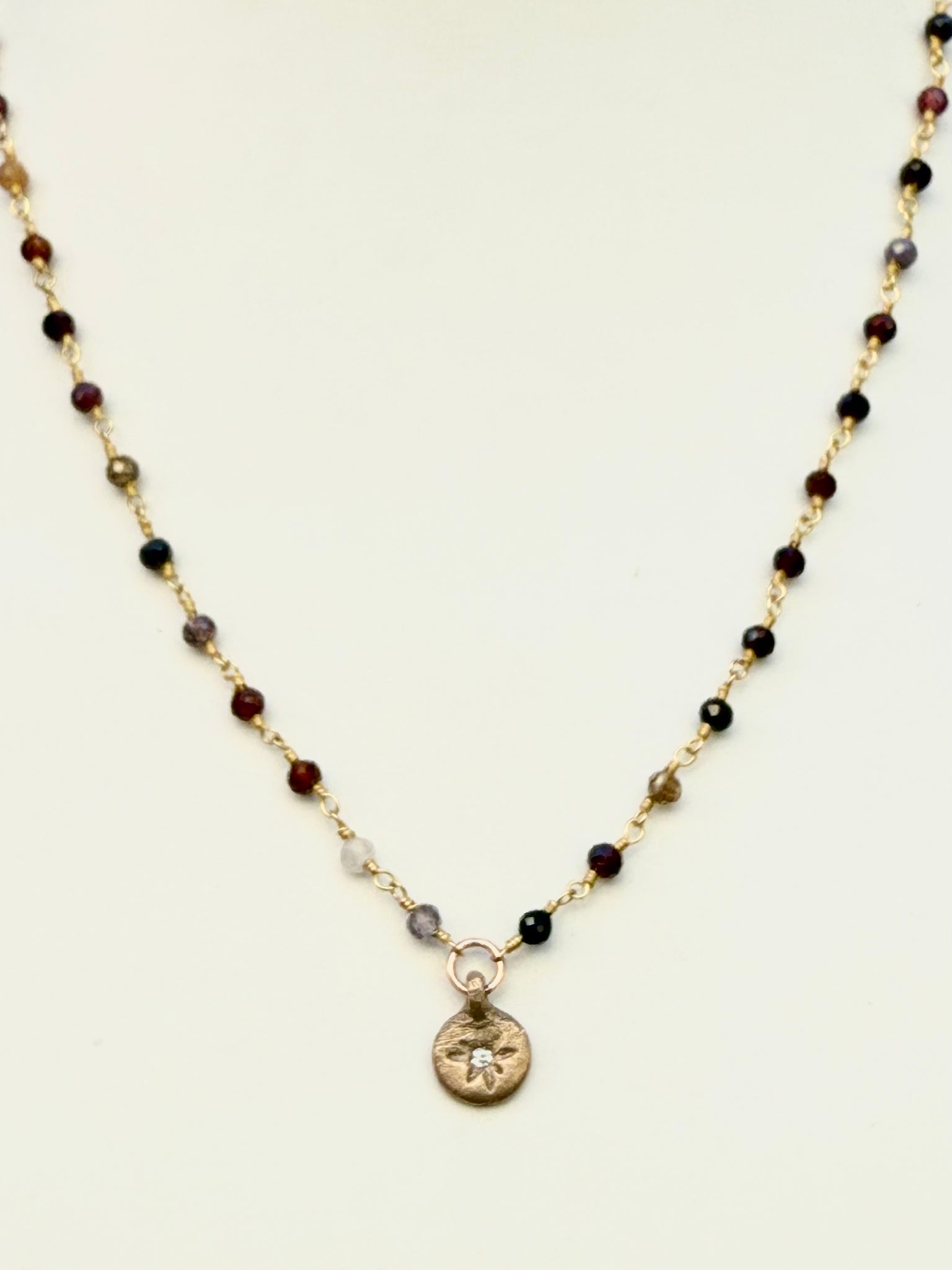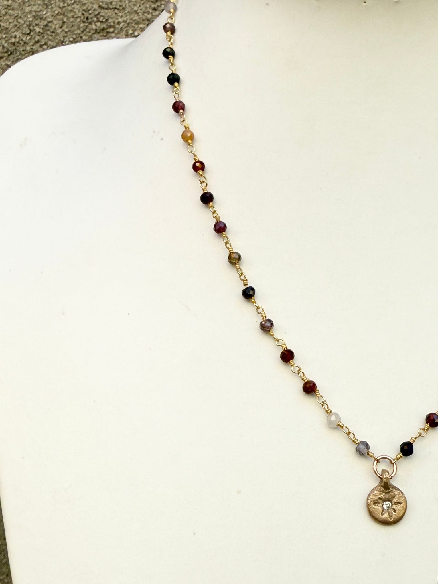 Super cute! Petite stone beads with handmade bronze pendants. The pendant focal point has a cubic zirconia sparkler.