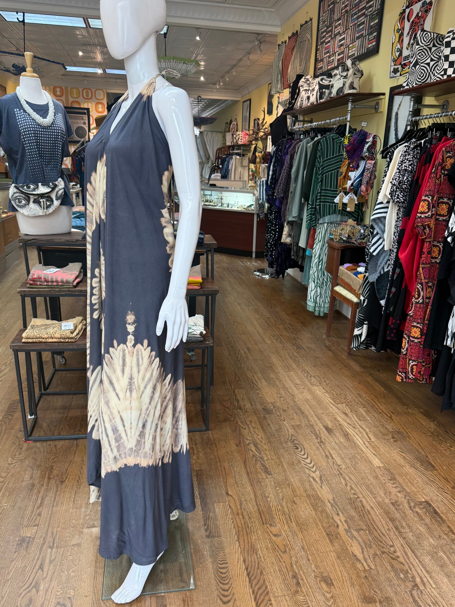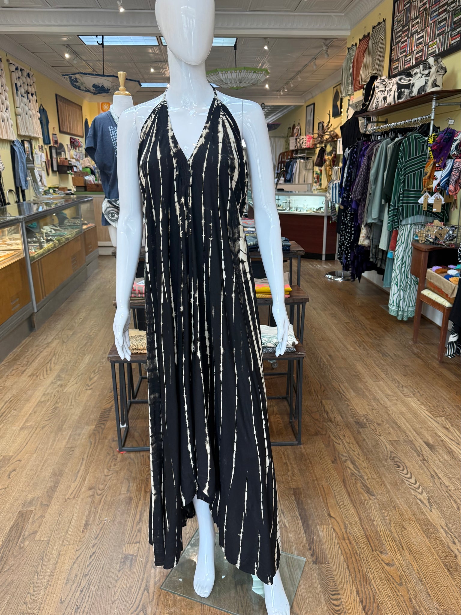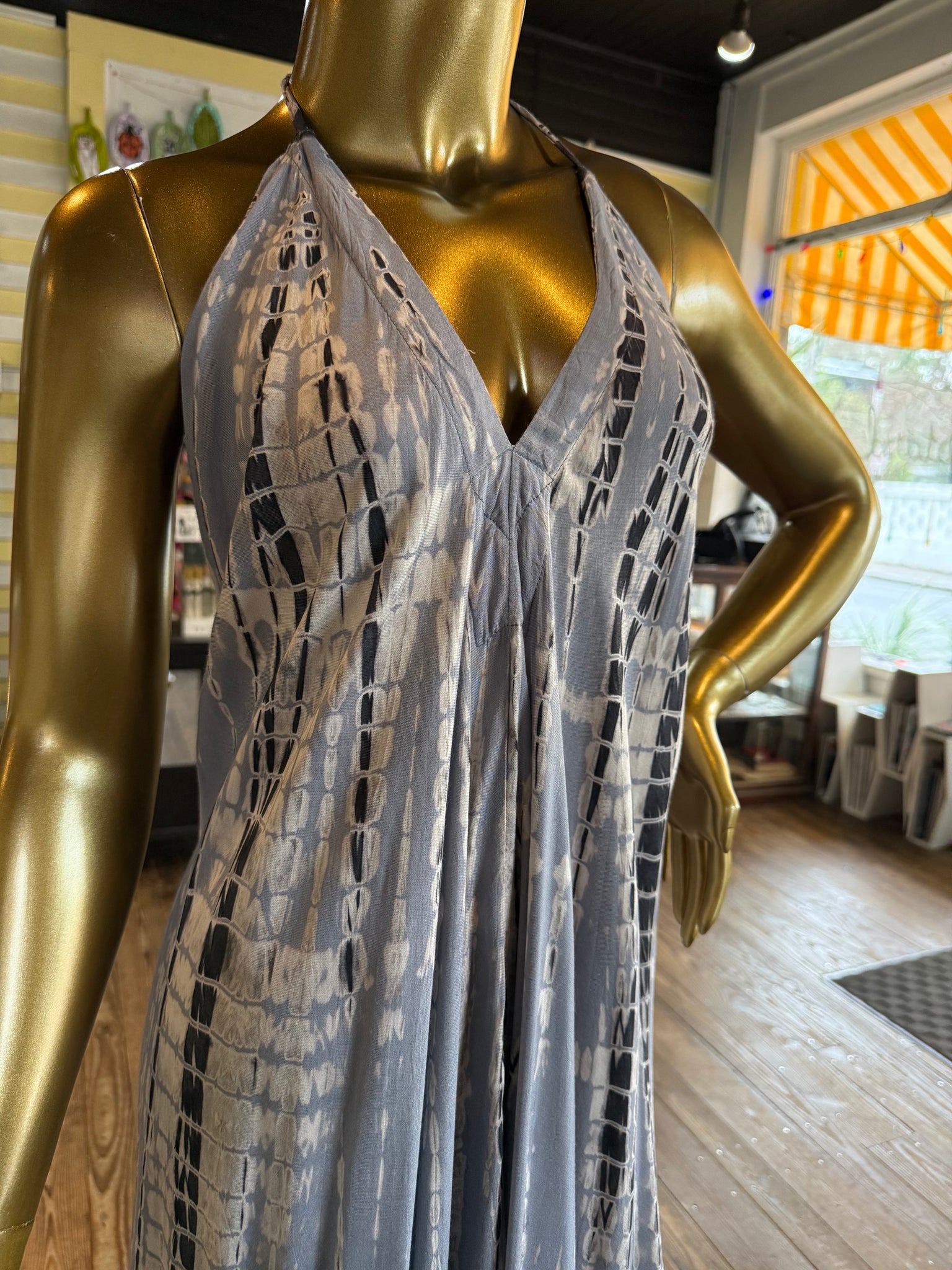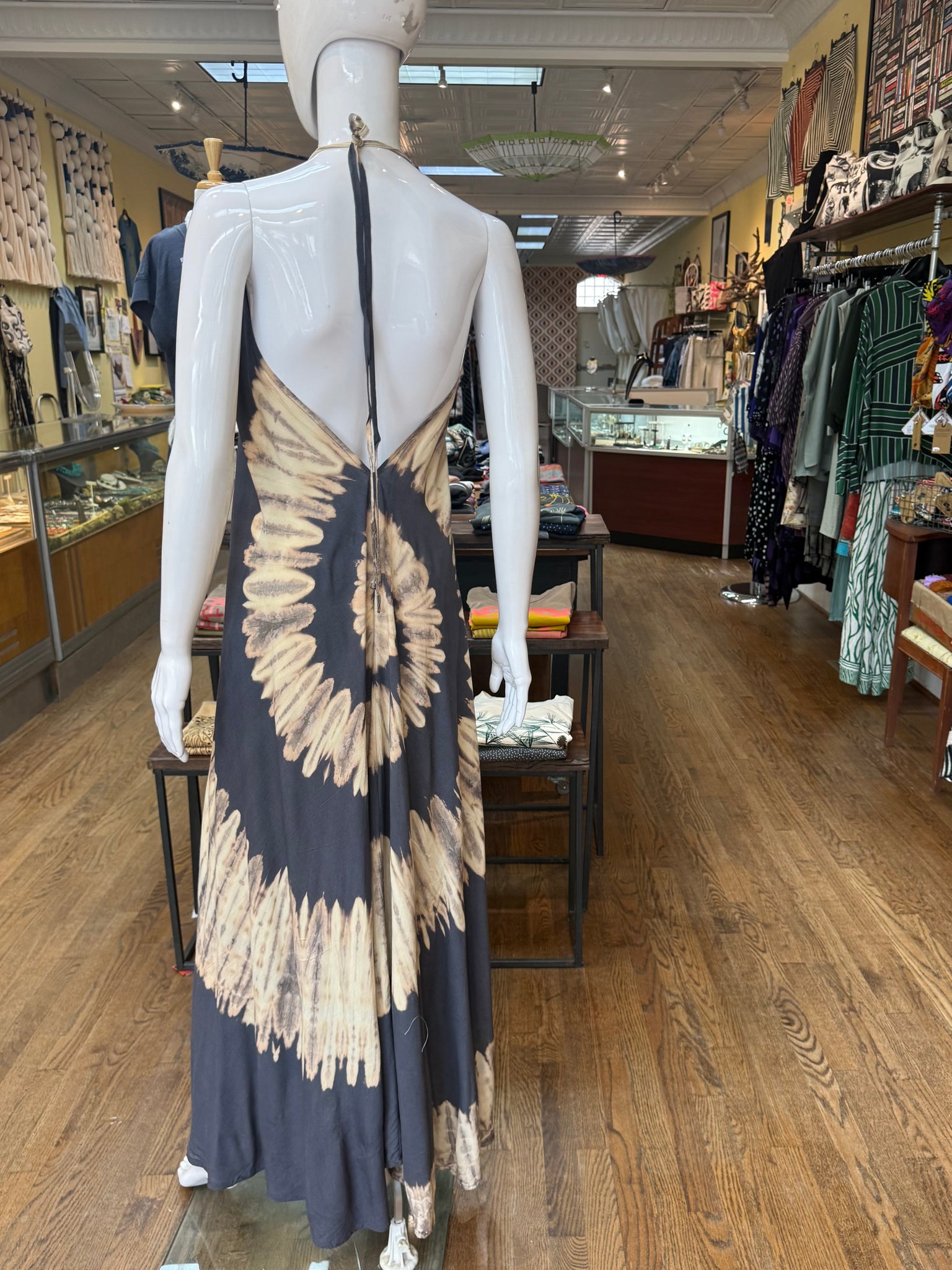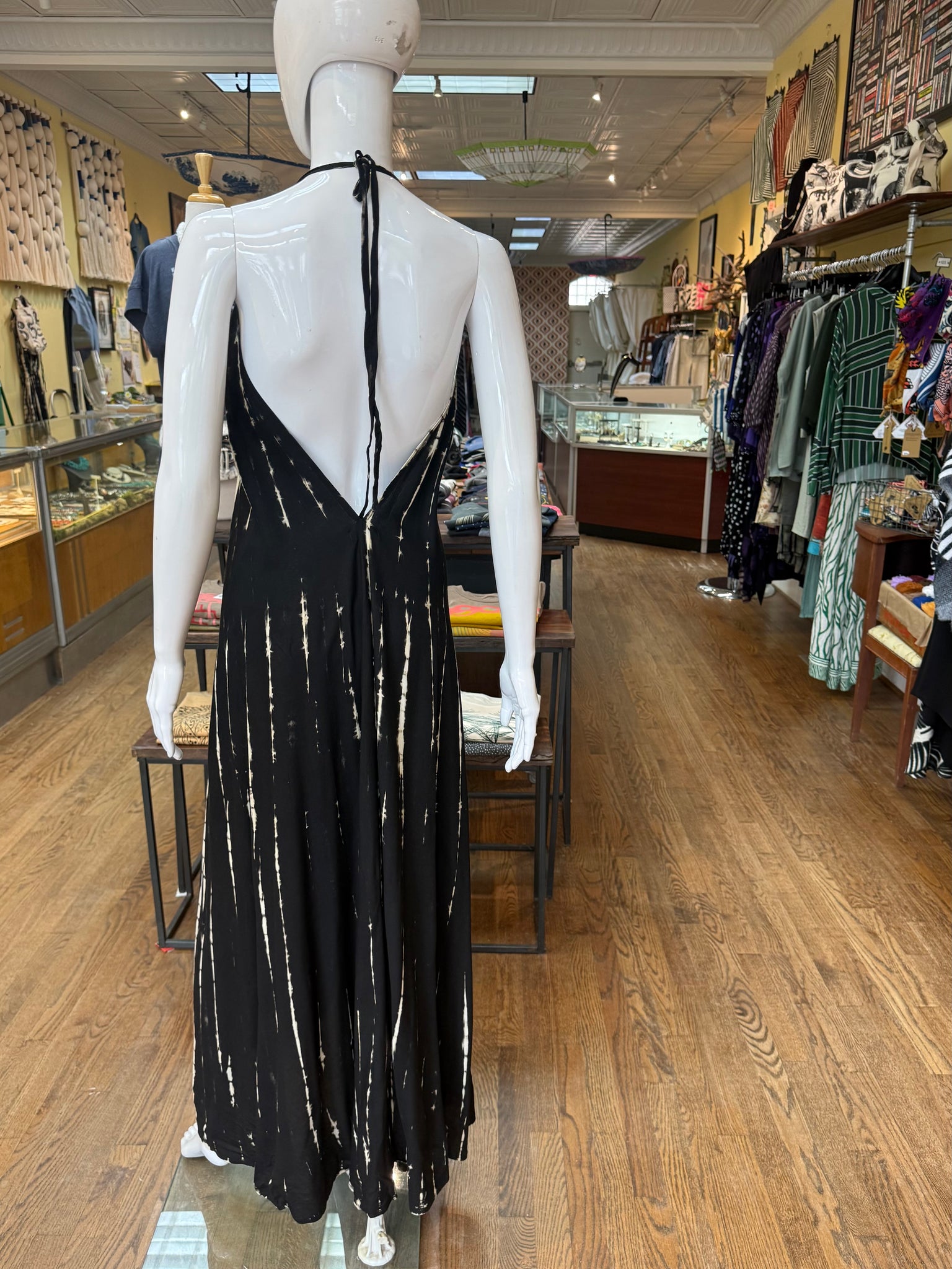 Beautiful shibori dyed maxi dress with a halter neckline that you can adjust with a self tie in the back. Nice event or evening piece.