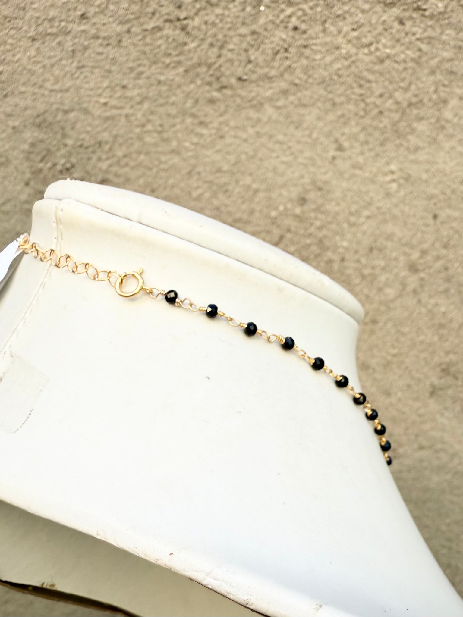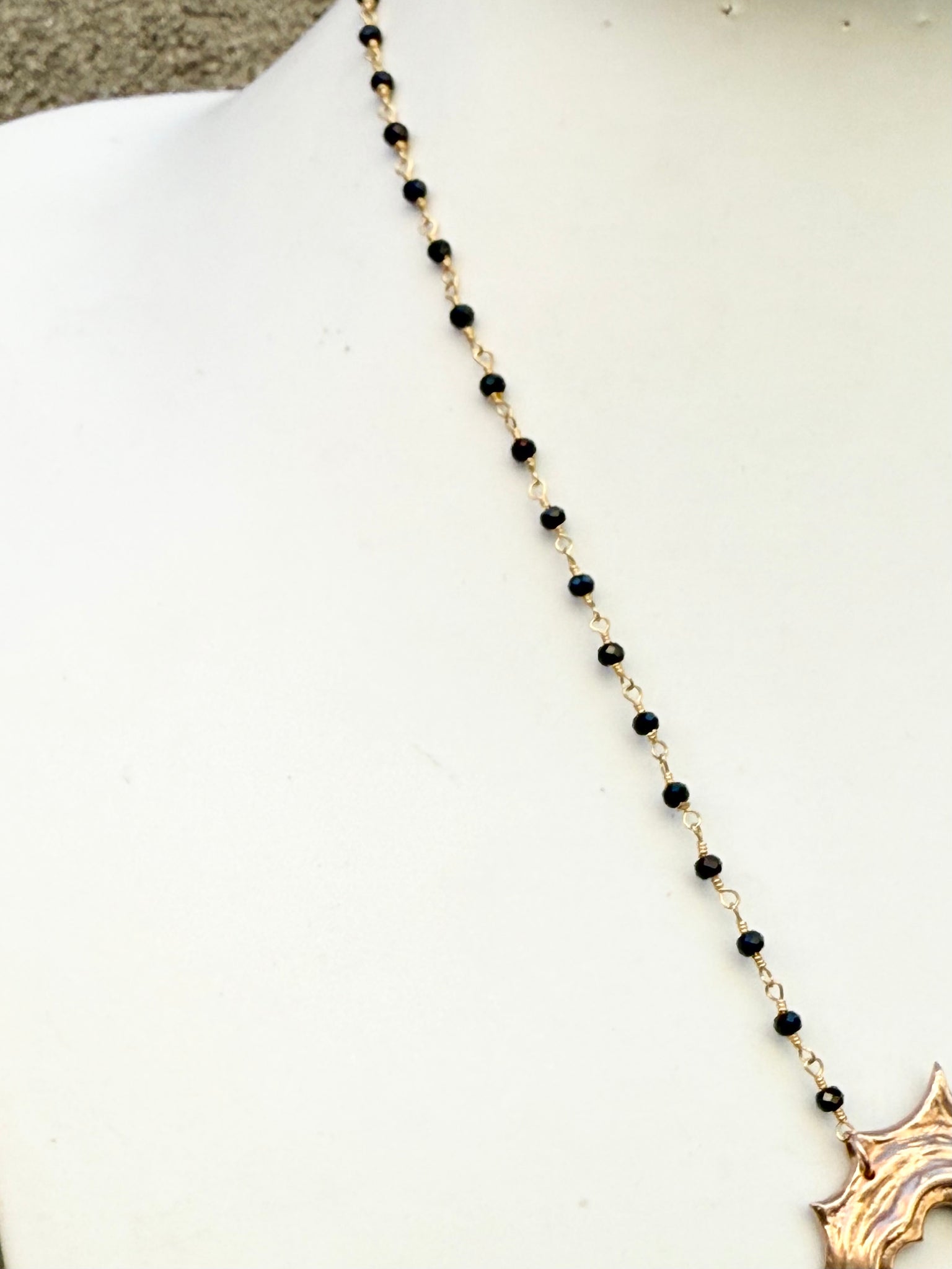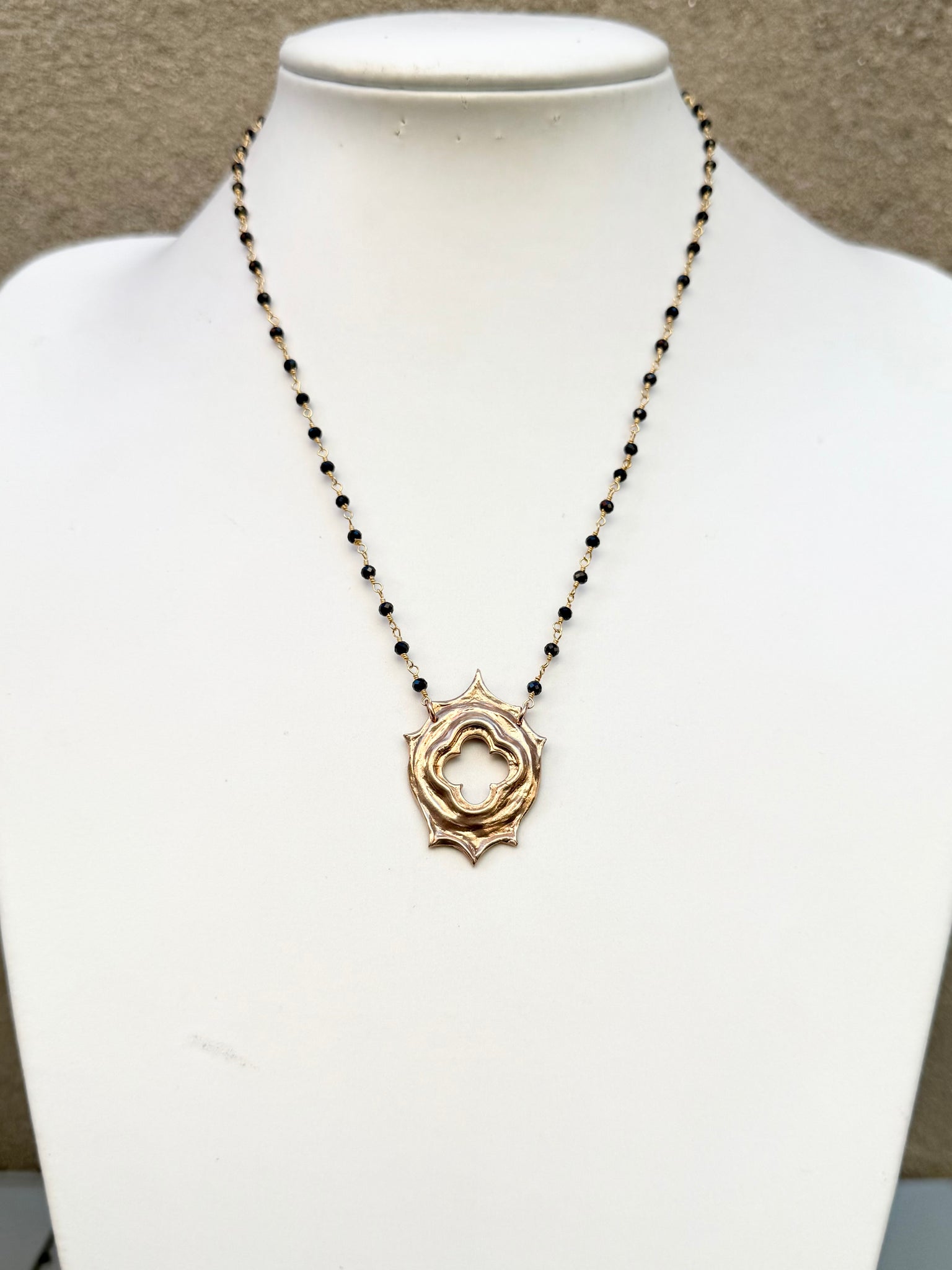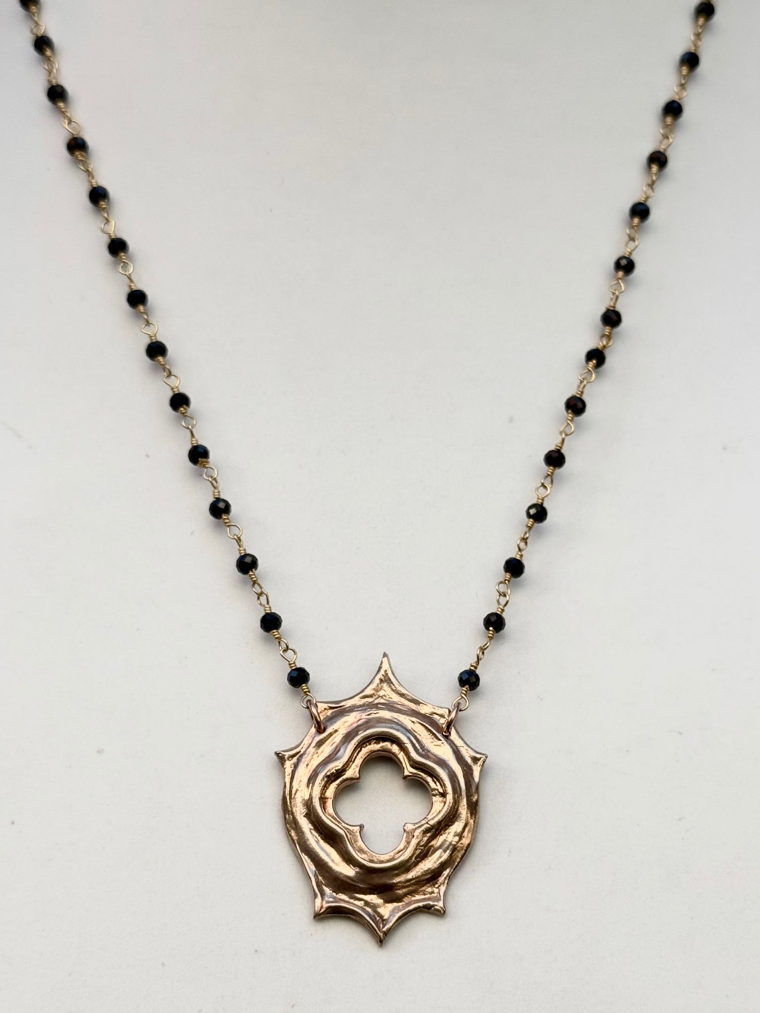 Design inspired by gothic architectural tracery in Venice. Pendant is hand carved bronze and paired here with an adjustable spinel beaded chain.