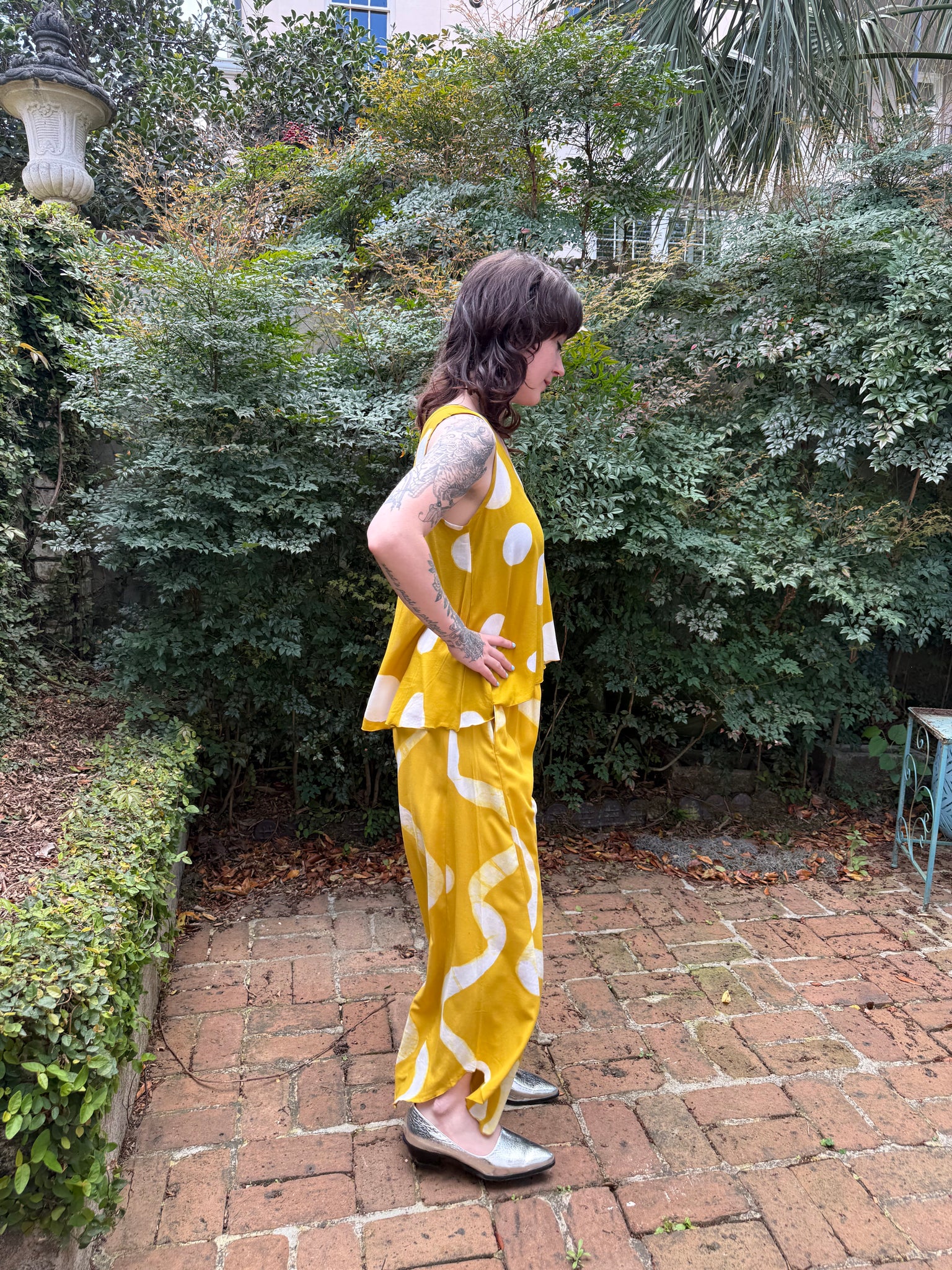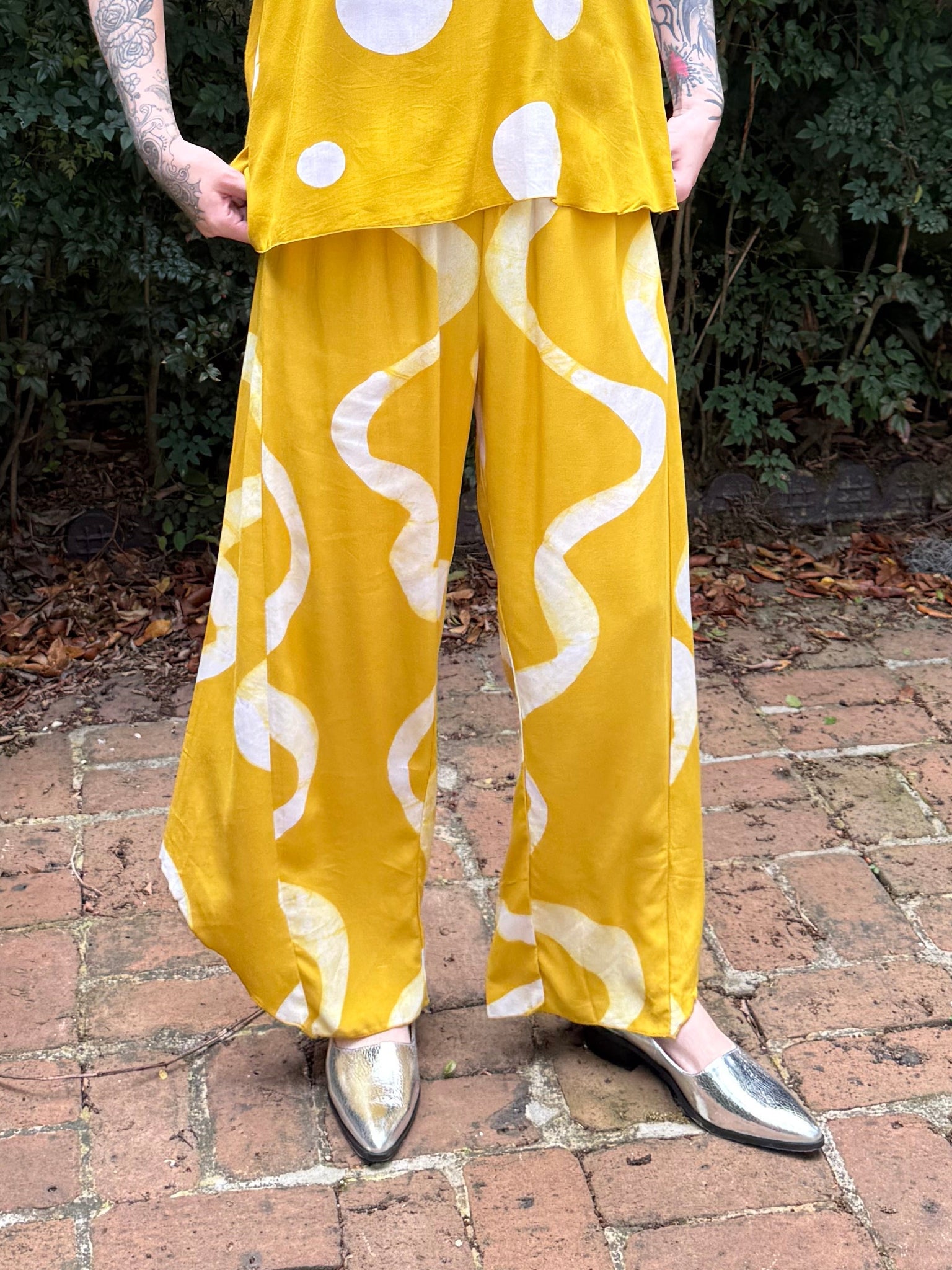 This hand painted mustard circle blouse is a staff favorite already! Pair it with the mustard bottoms or the blue- doesn’t matter- this blouse looks great with anything - in any season.