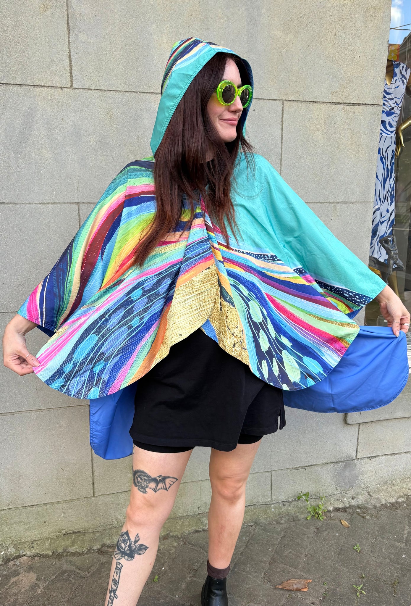 These ponchos are reversible (so, one side is fun, fine art and the other is solid. So if you're not feeling the print that morning, you can still keep it incognito in basic black, navy or grey), packable, rainproof, windproof, AND lightweight!