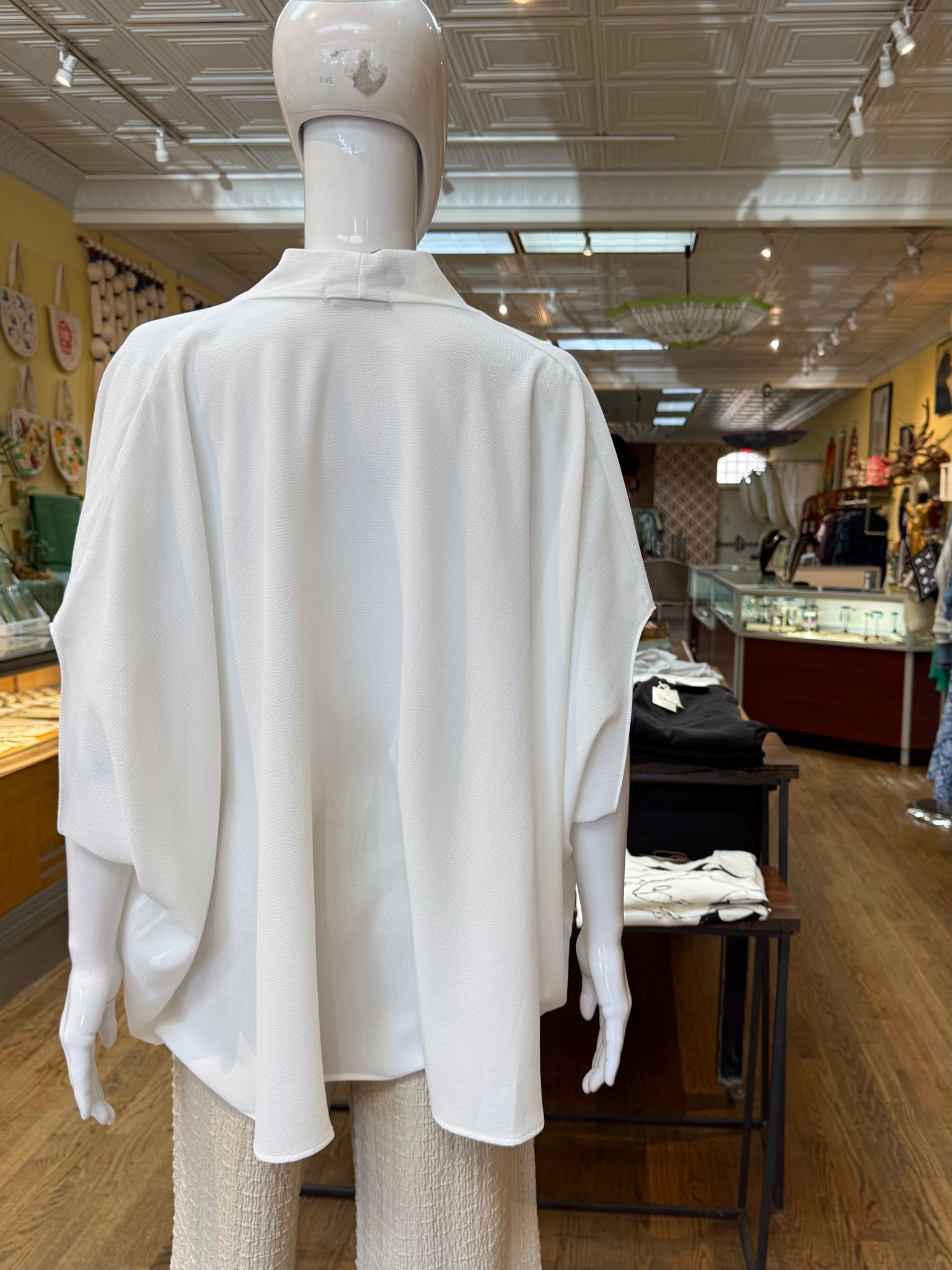 This one has a loose, kimono style fit and is available in a crisp white color.  The tucked front gives this one a great hi-lo look too.  Pair this with your favorite jeans for an anytime wear!