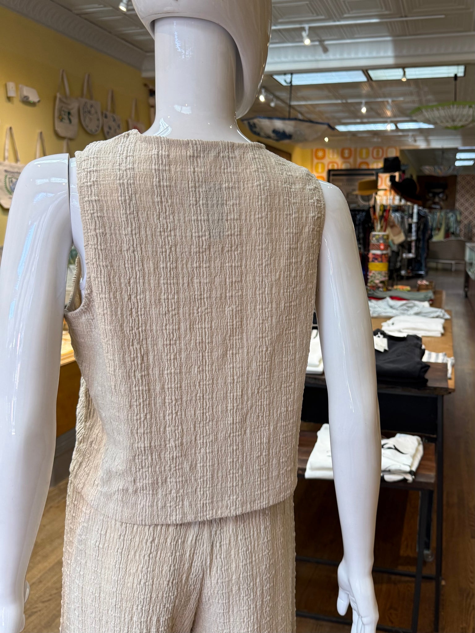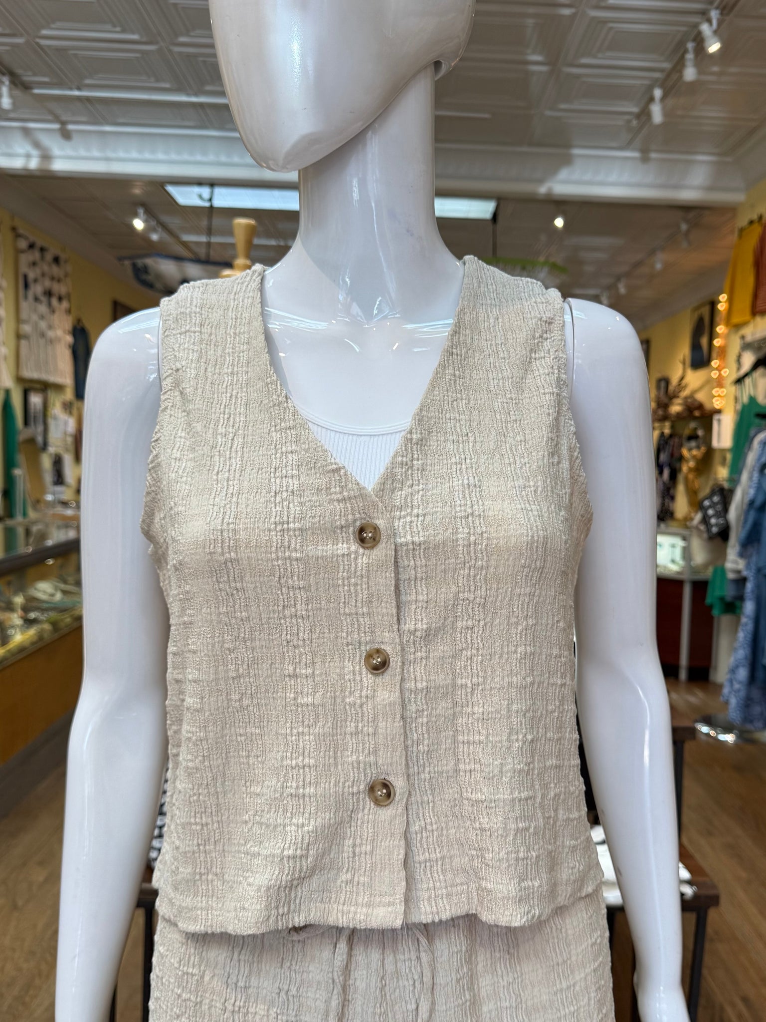 Cute textured fabric vest in a great natural tone that’s easy and fun to outfit.