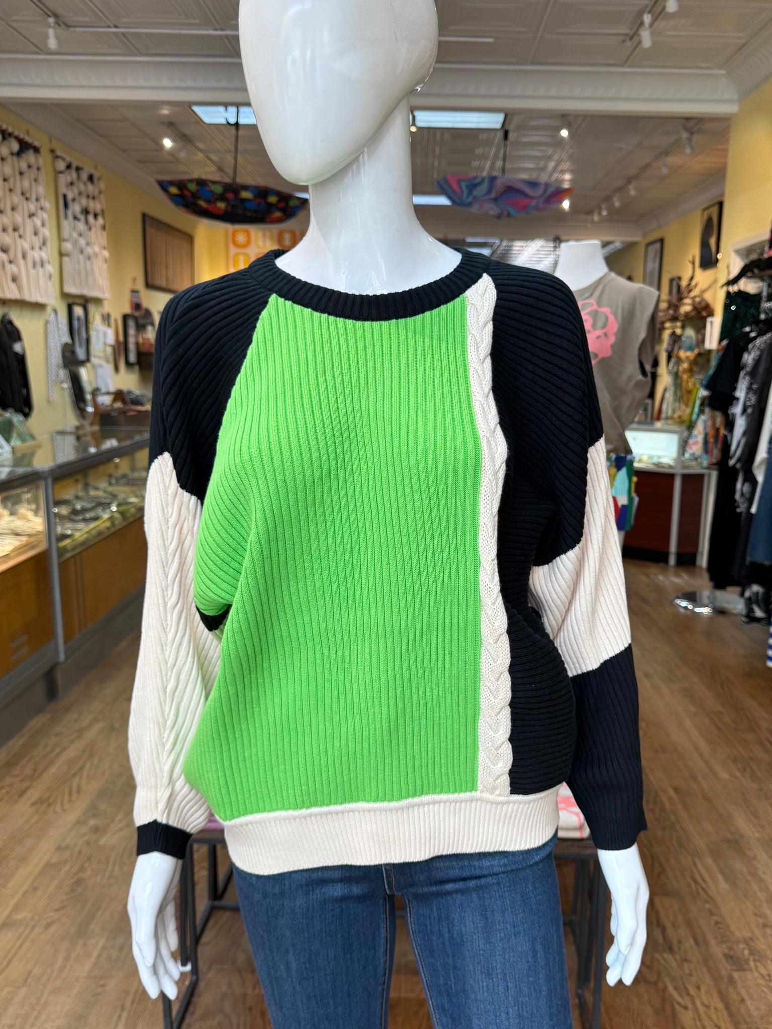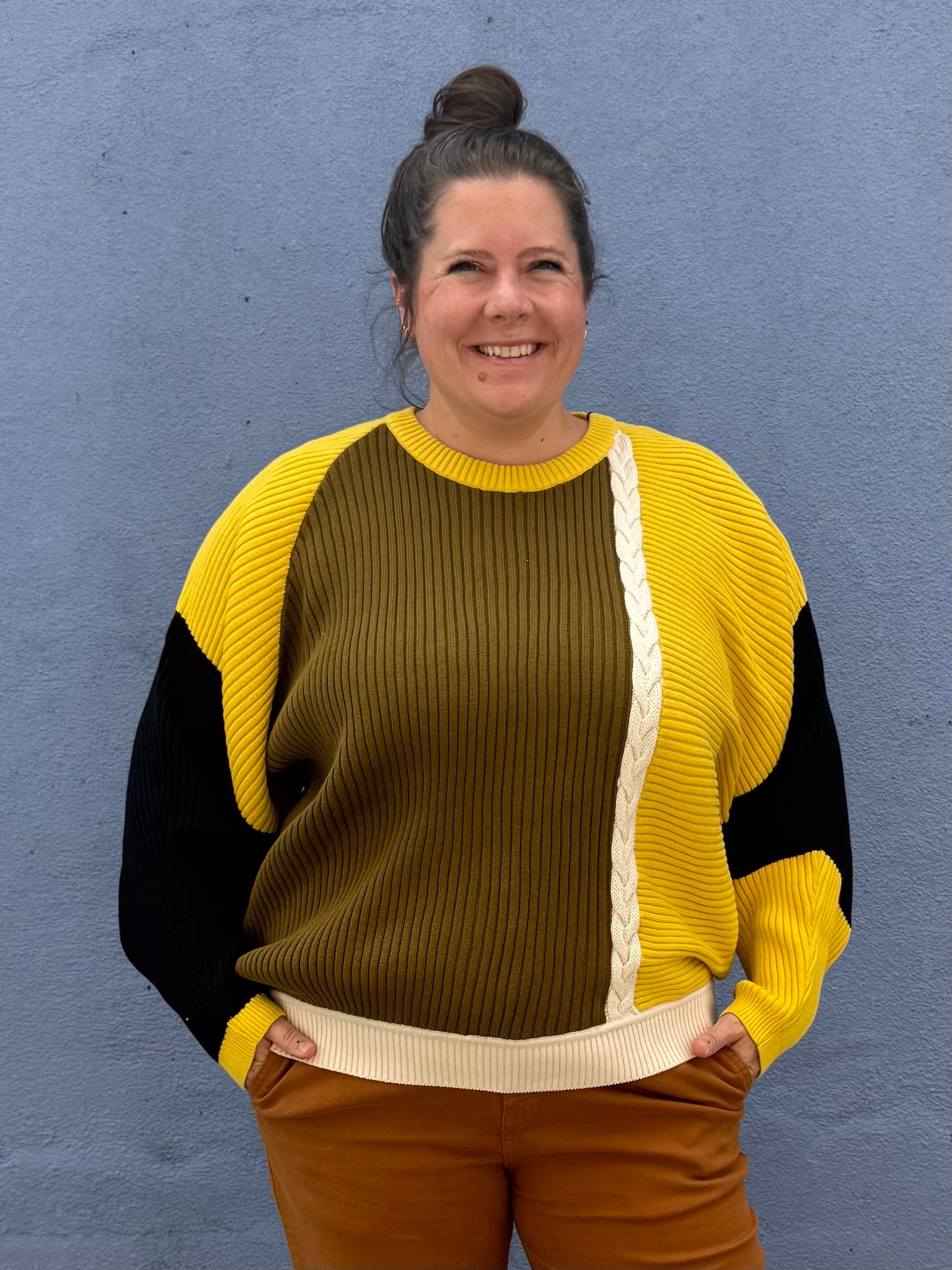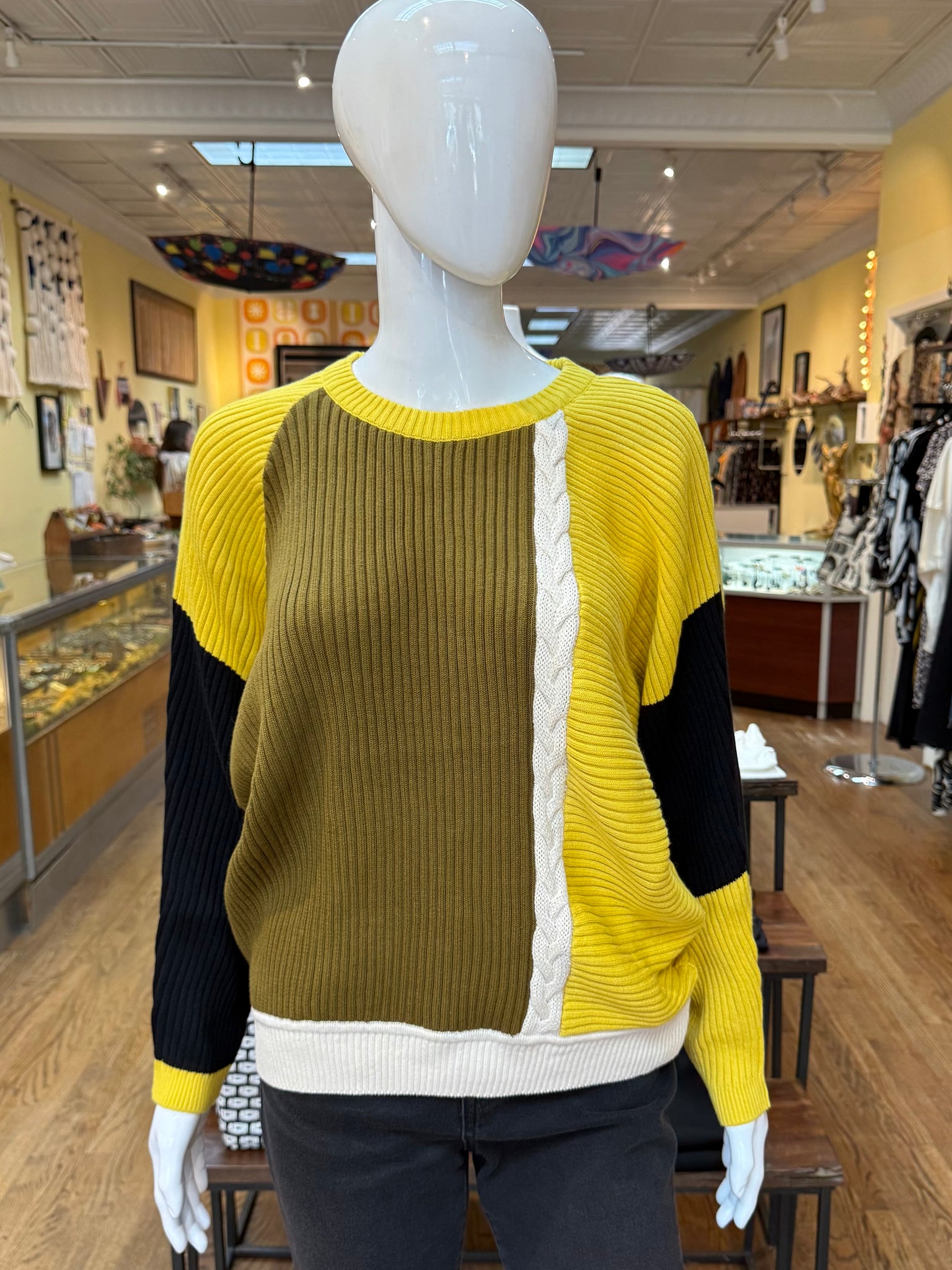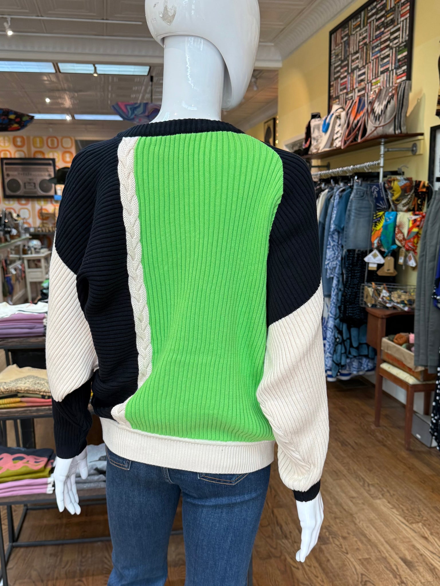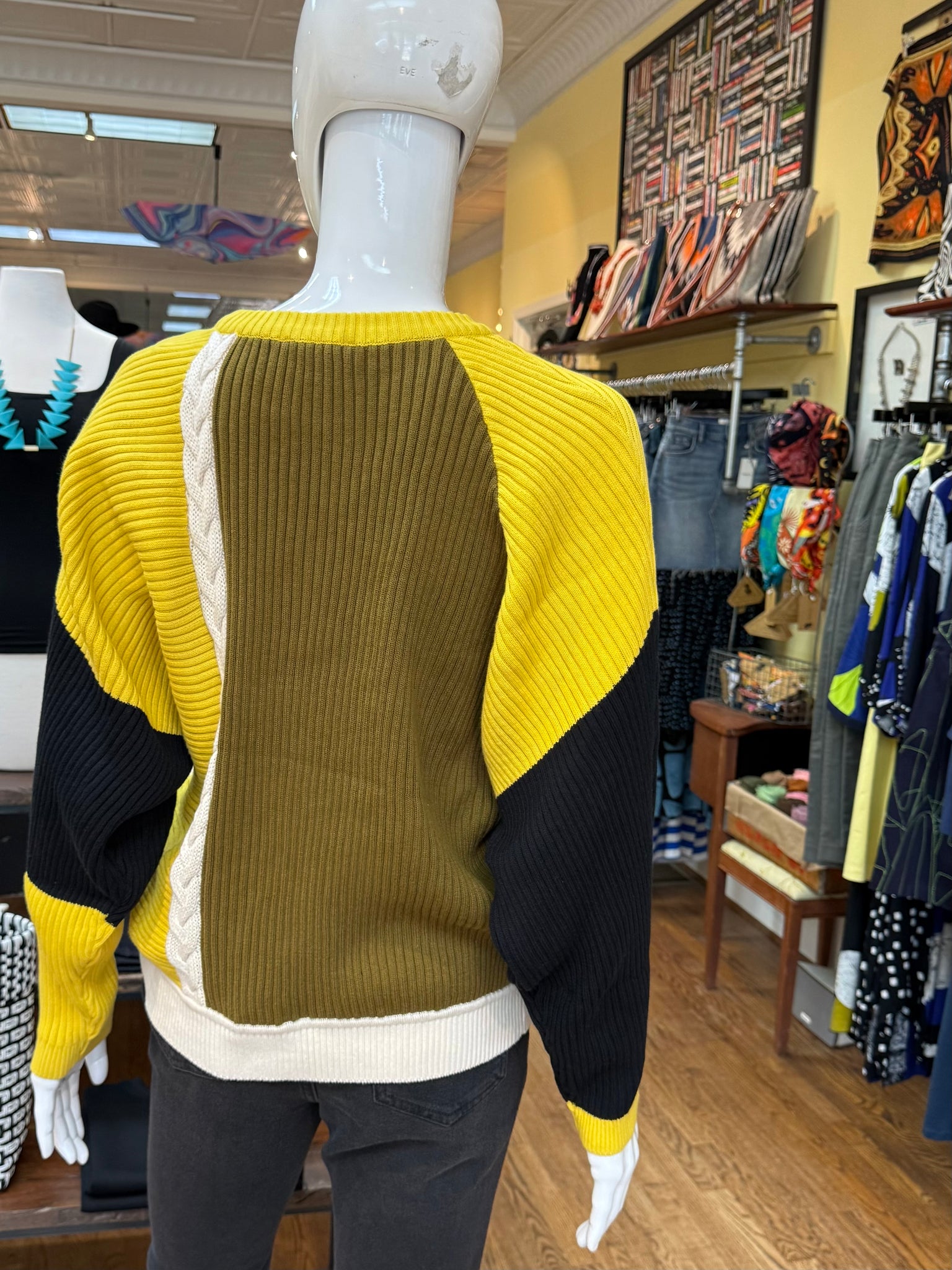 This is the sweater with the eye catching color blocking that pulls you right in. It’s a relaxed fit with ribbed knitting and’s a little braided detail on the front and back. Cozy and very cool!