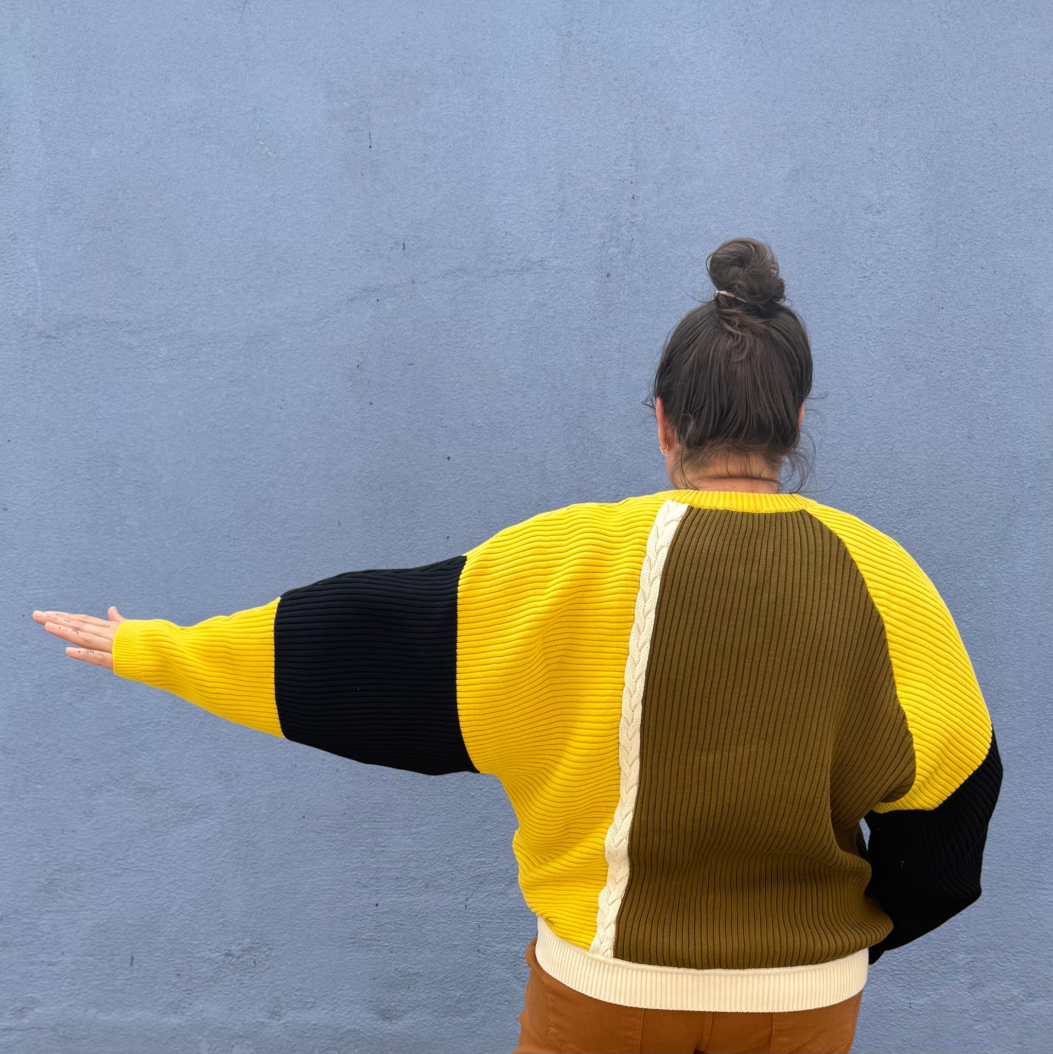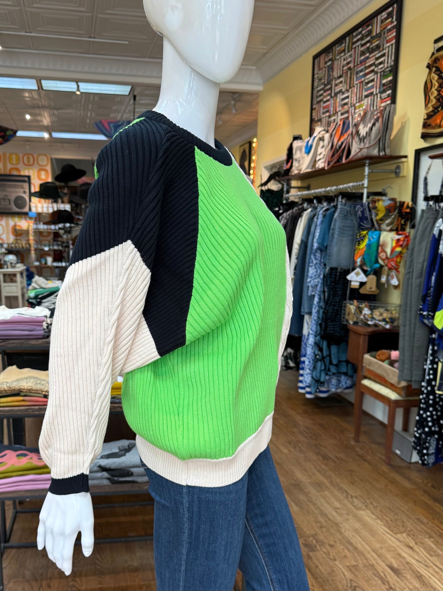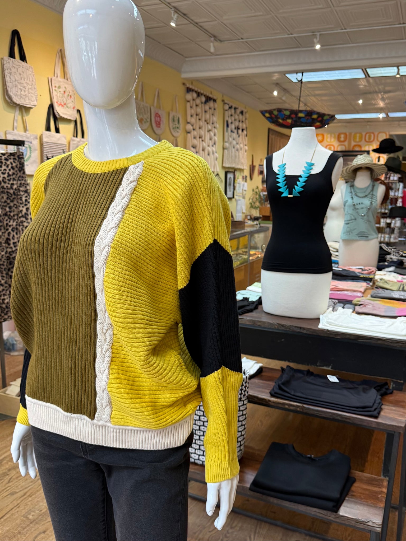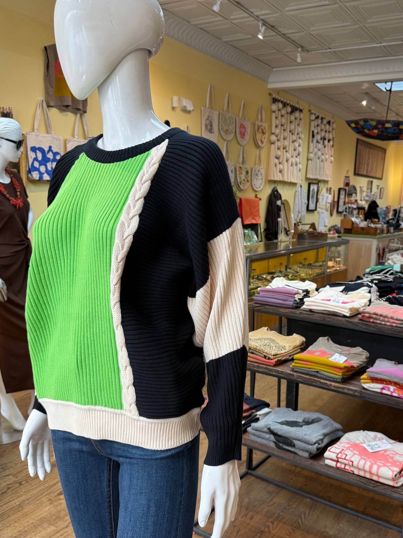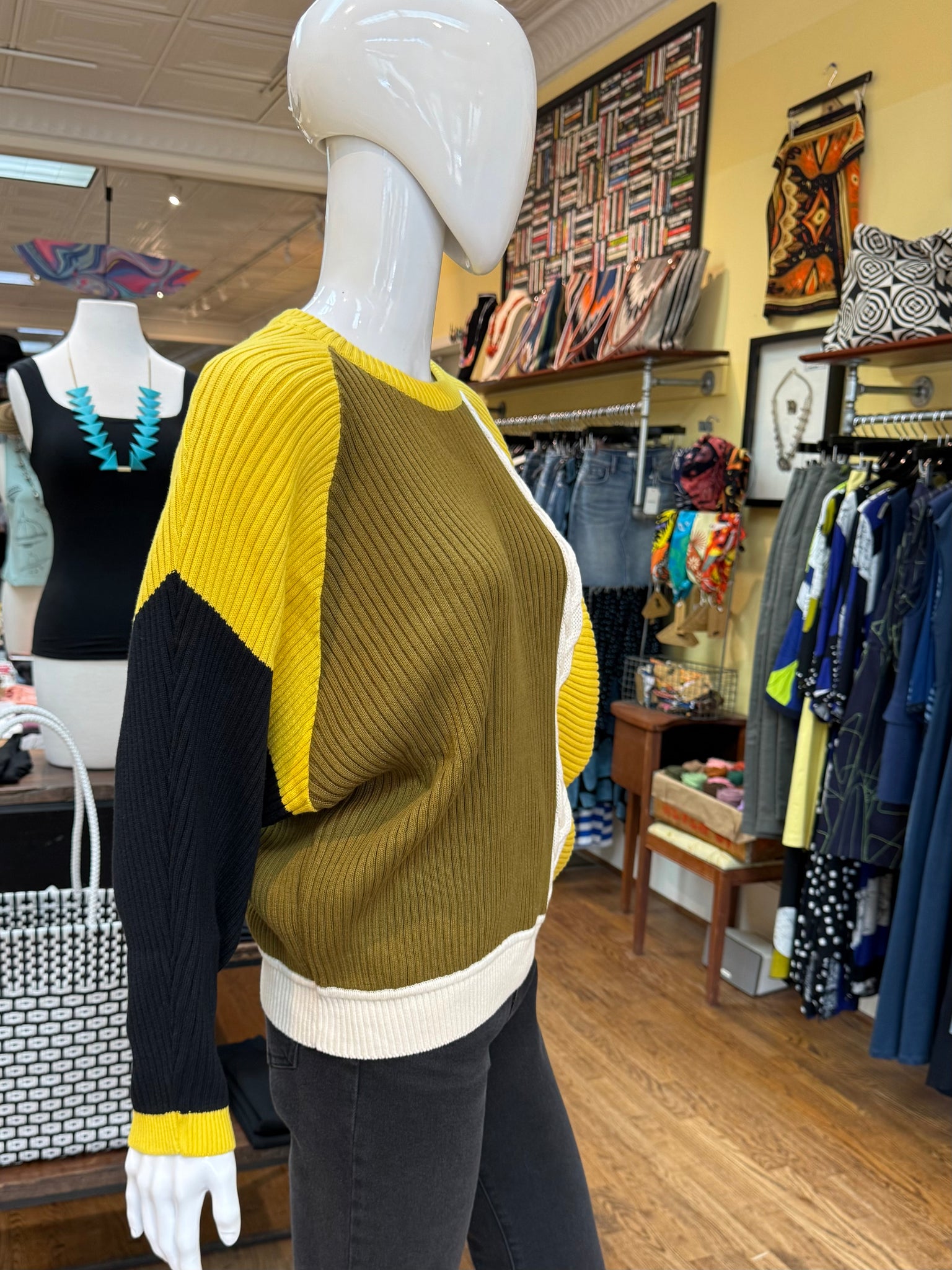 This is the sweater with the eye catching color blocking that pulls you right in. It’s a relaxed fit with ribbed knitting and’s a little braided detail on the front and back. Cozy and very cool!