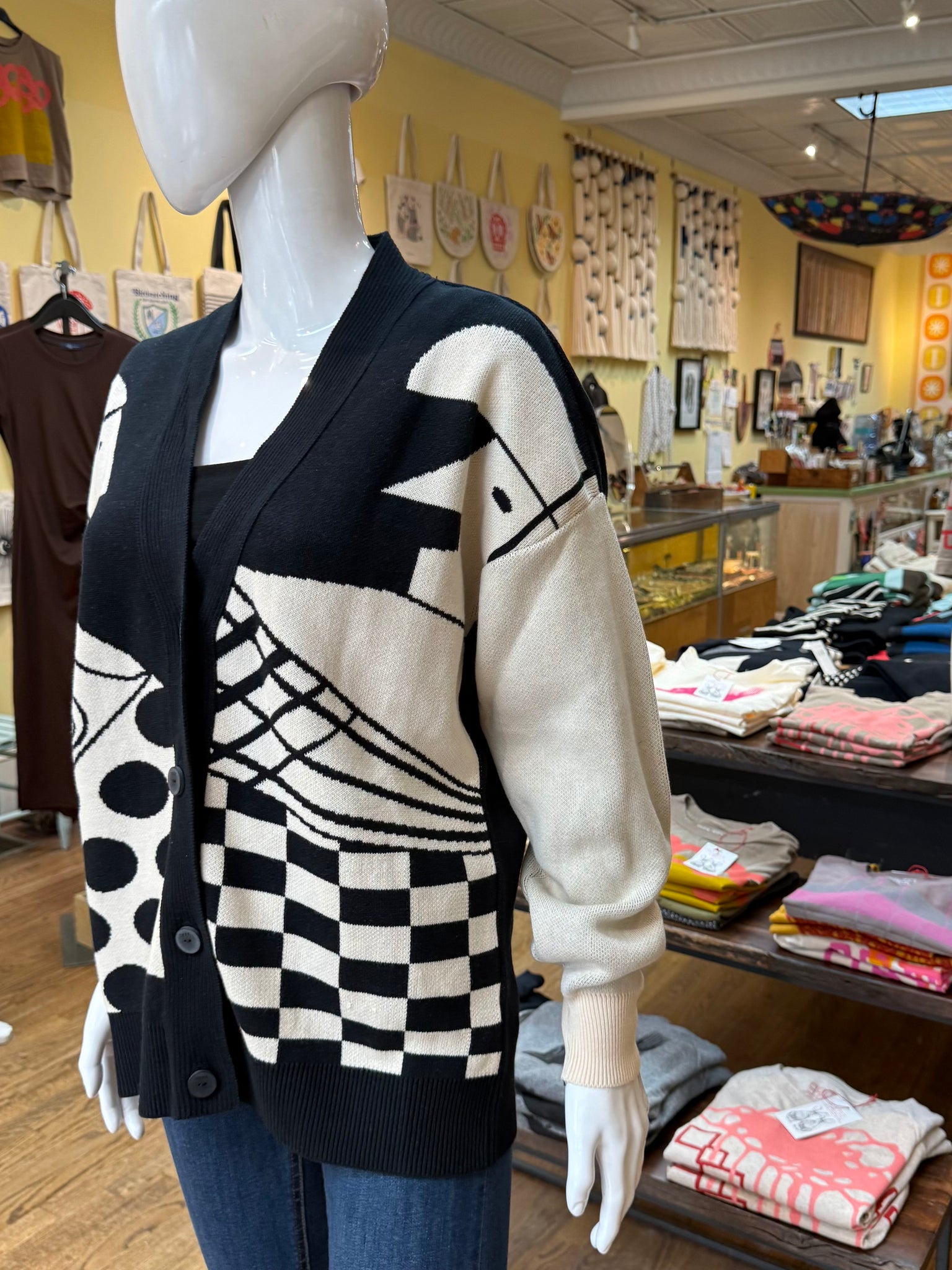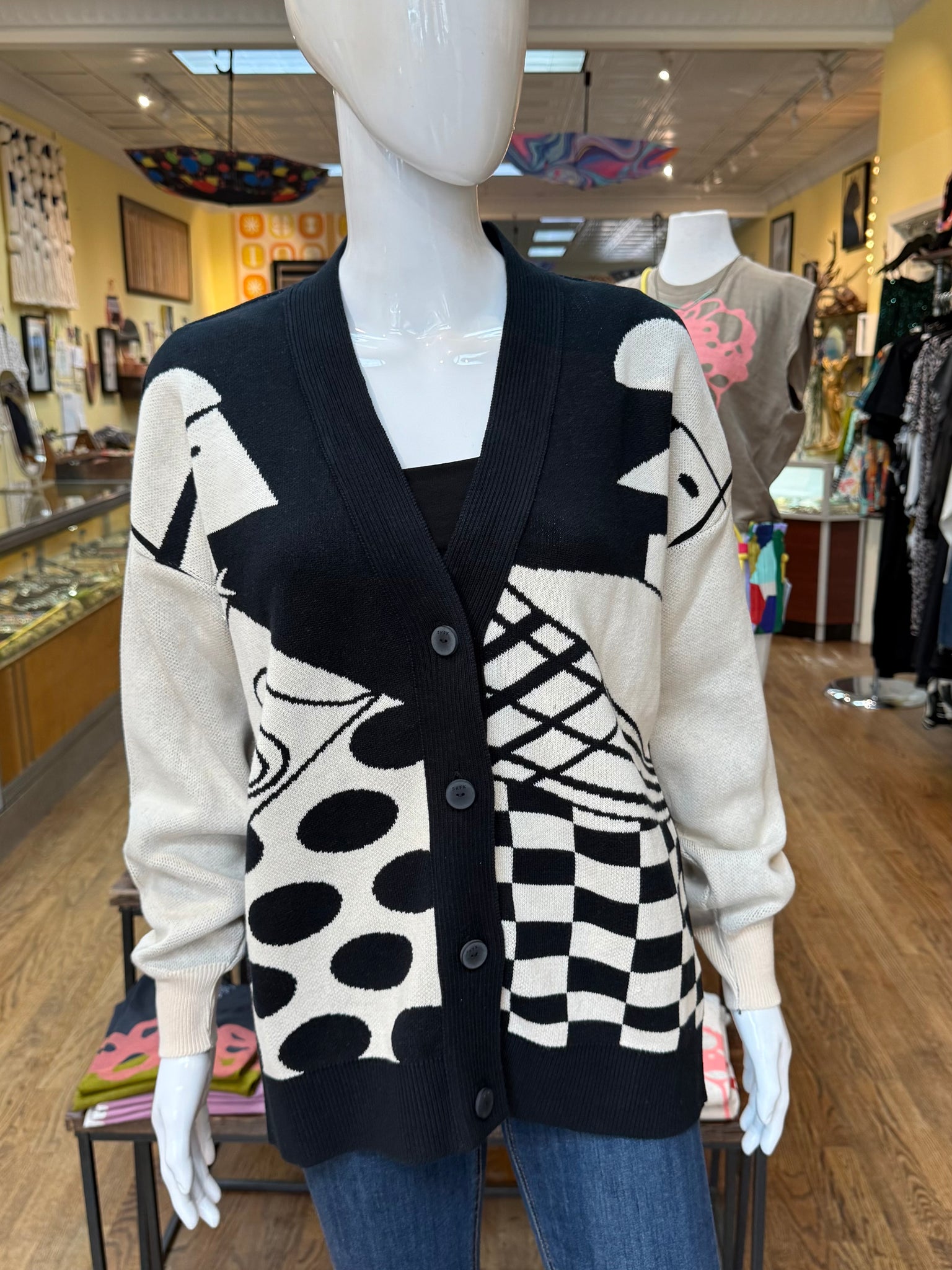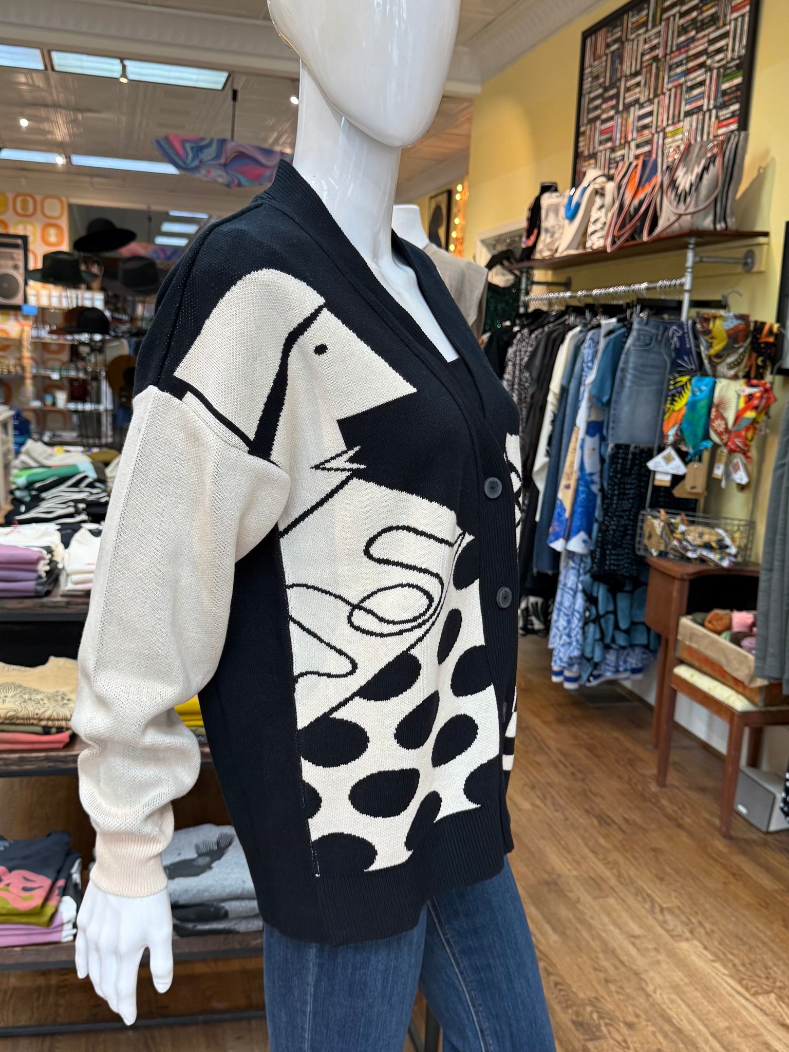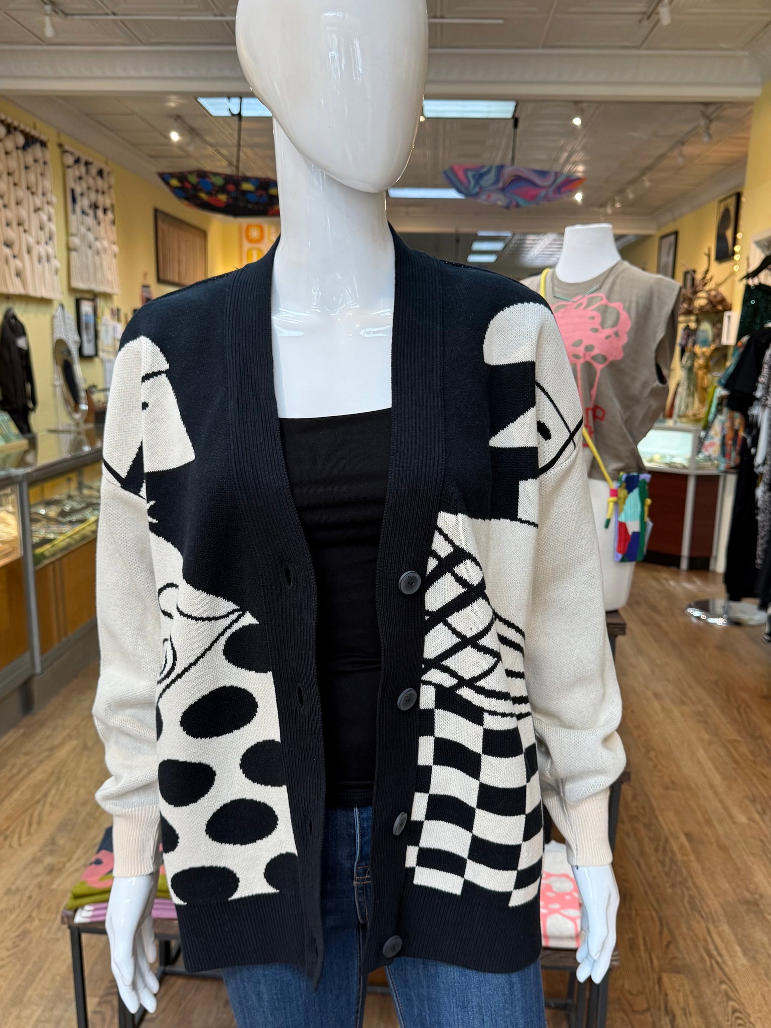 Black and white cardigan with a really cool pattern featuring two figures staring at each other from each shoulder. This one is soft and cozy in a classic 4 button cardigan style.