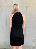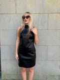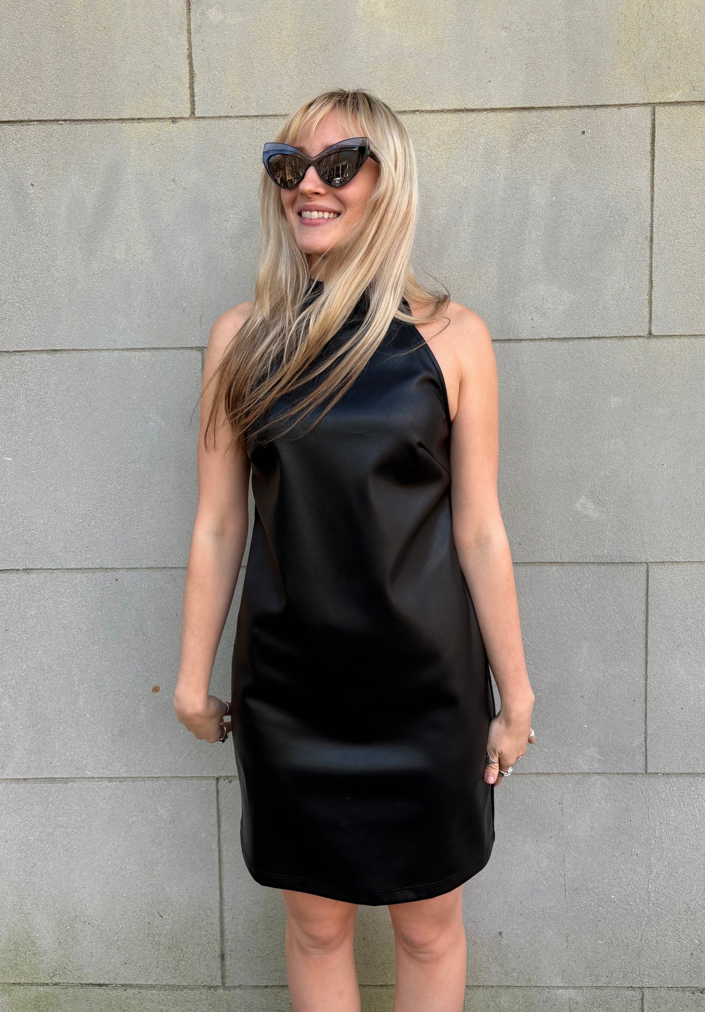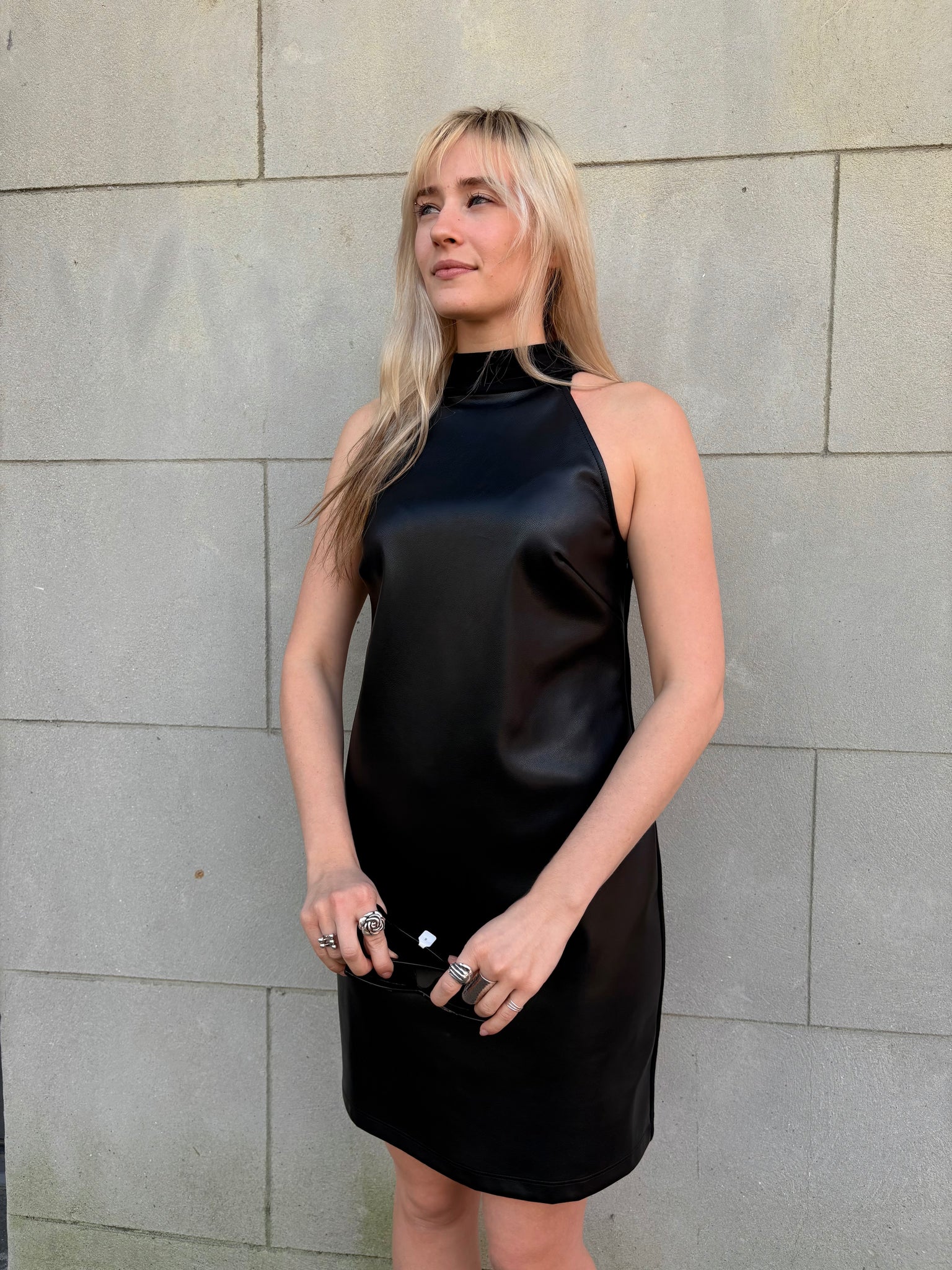 Your new little black party dress is here and it’s hot hot hot! Fitted mini dress with halter neck design with a faux leather front and a contrasting fabric back. The dress has a nice stretch to give you that fitted look without discomfort. Fun dress and an easy grab for a weekend night on the town.