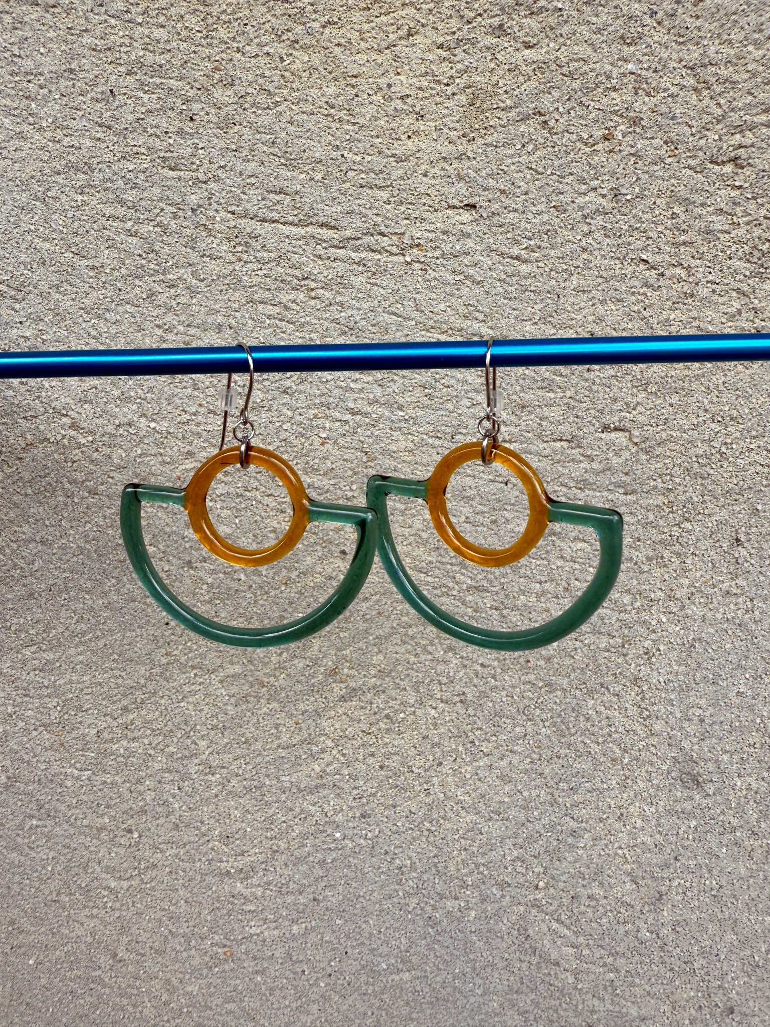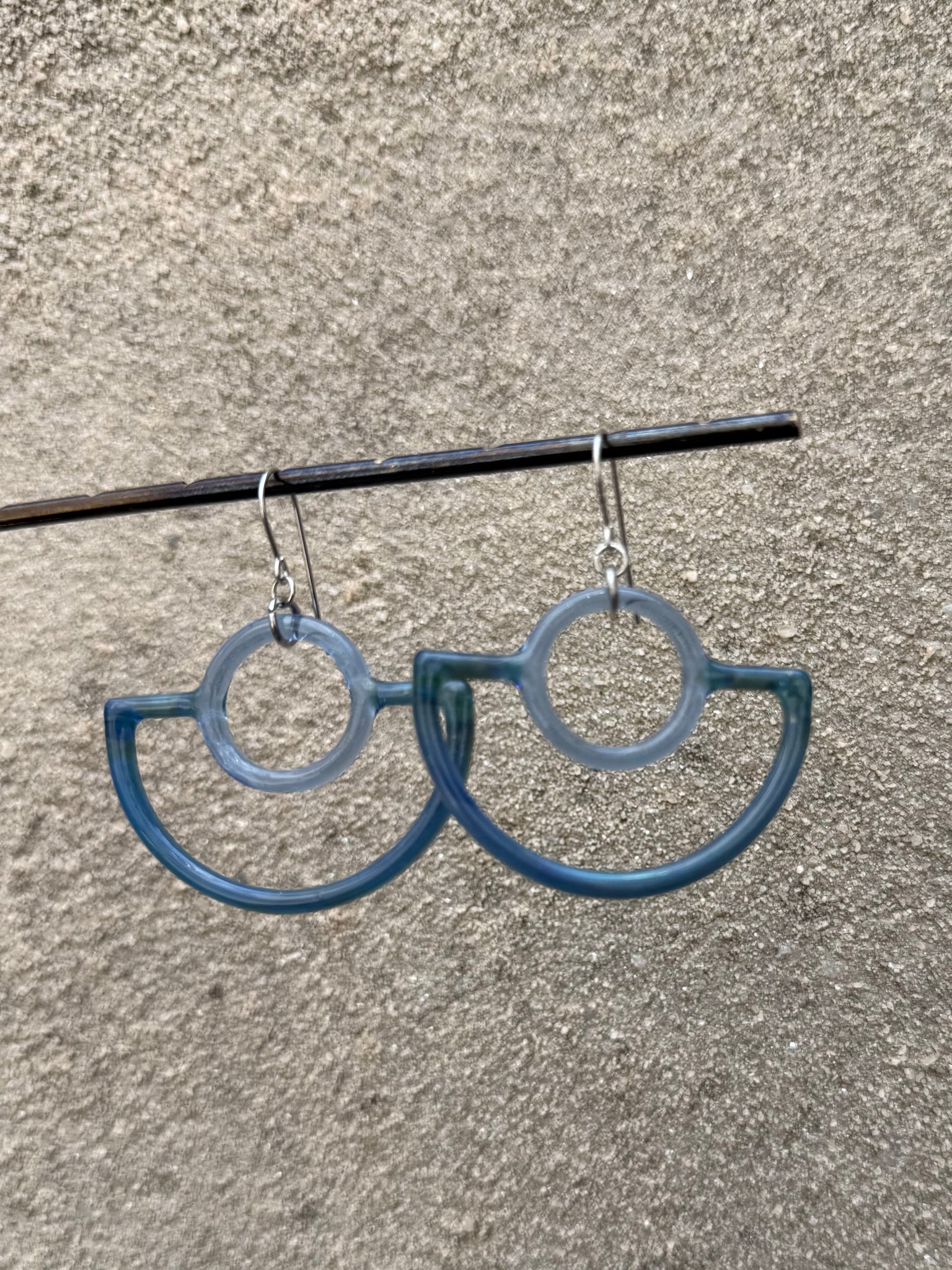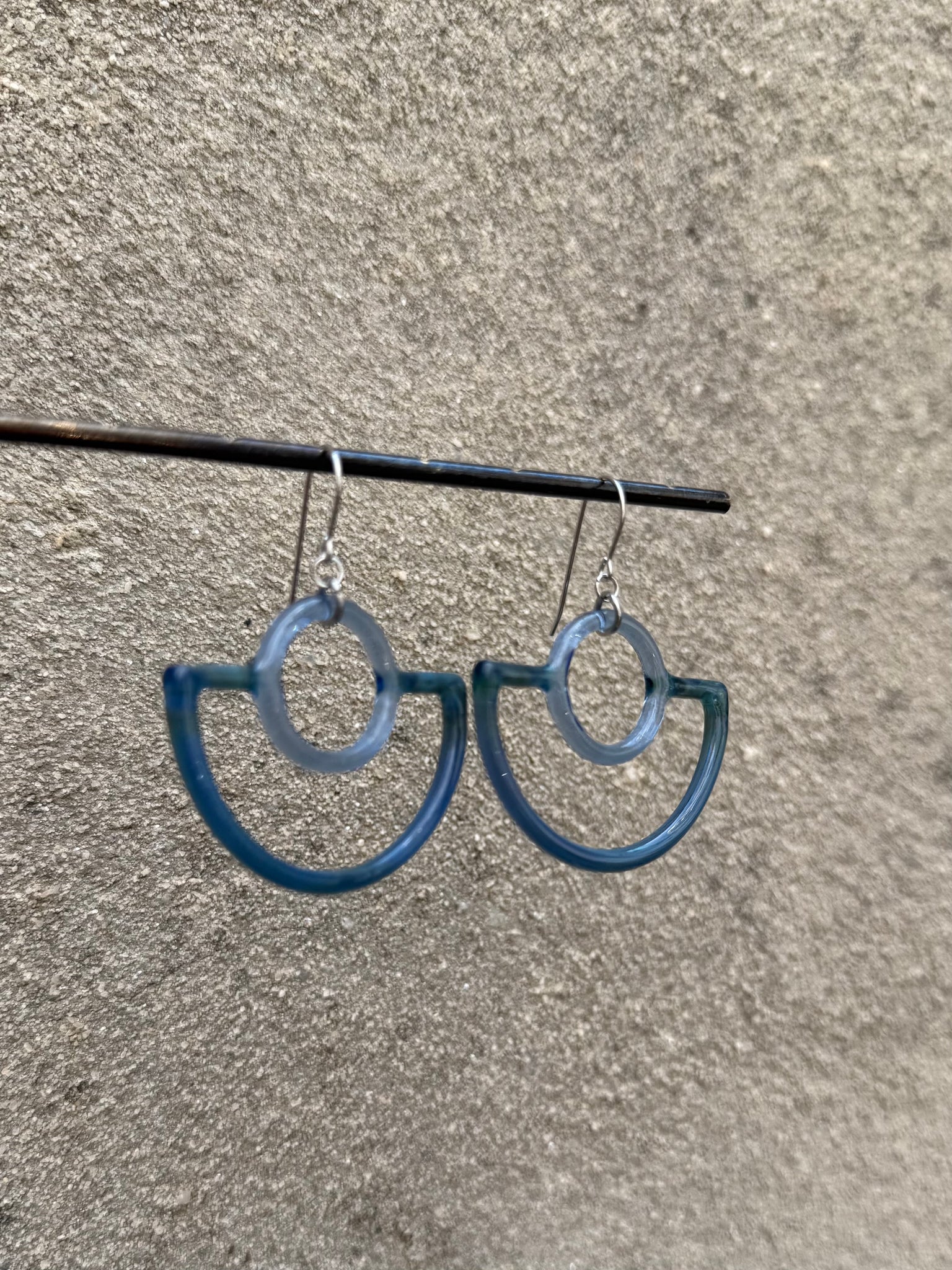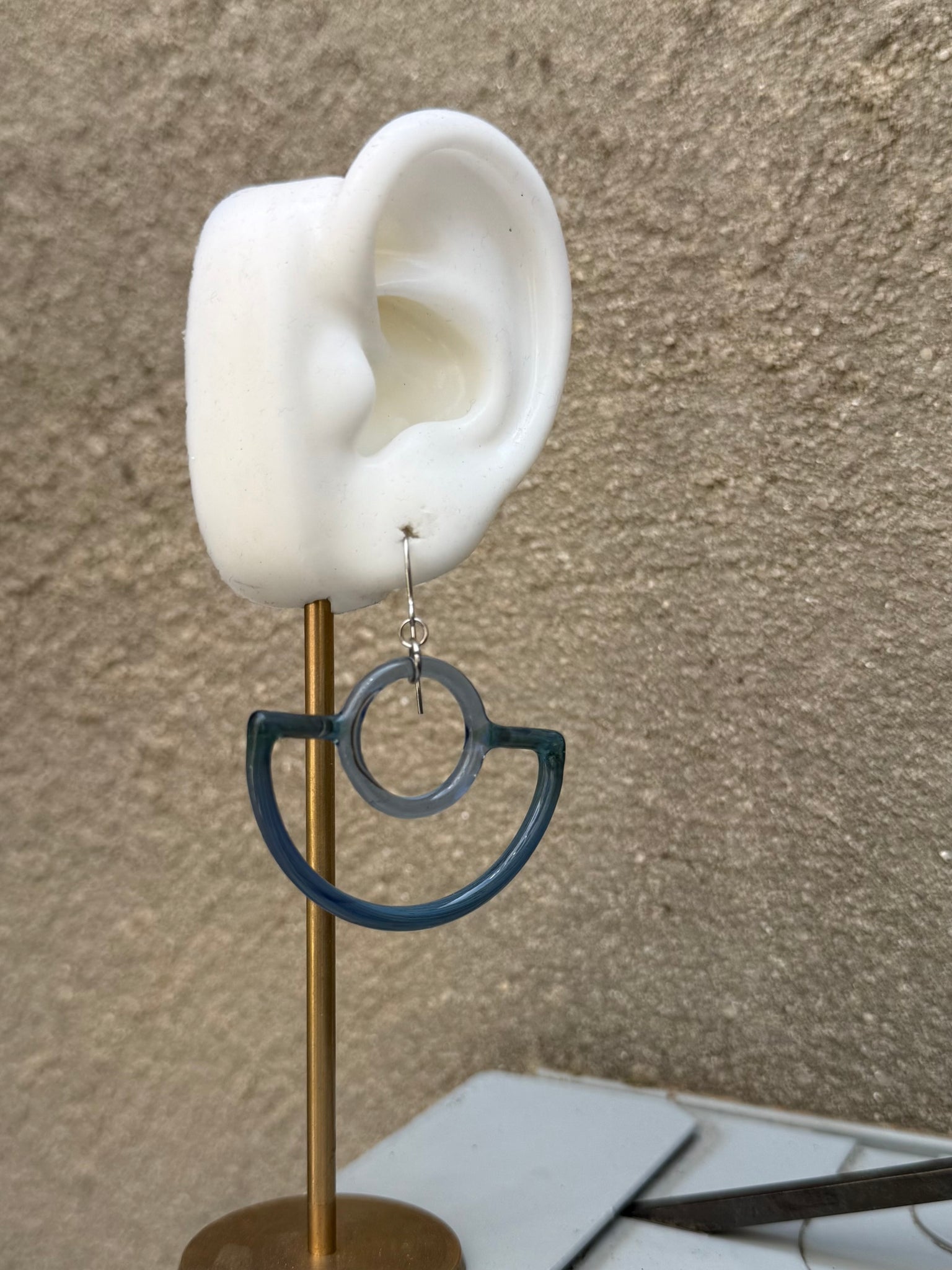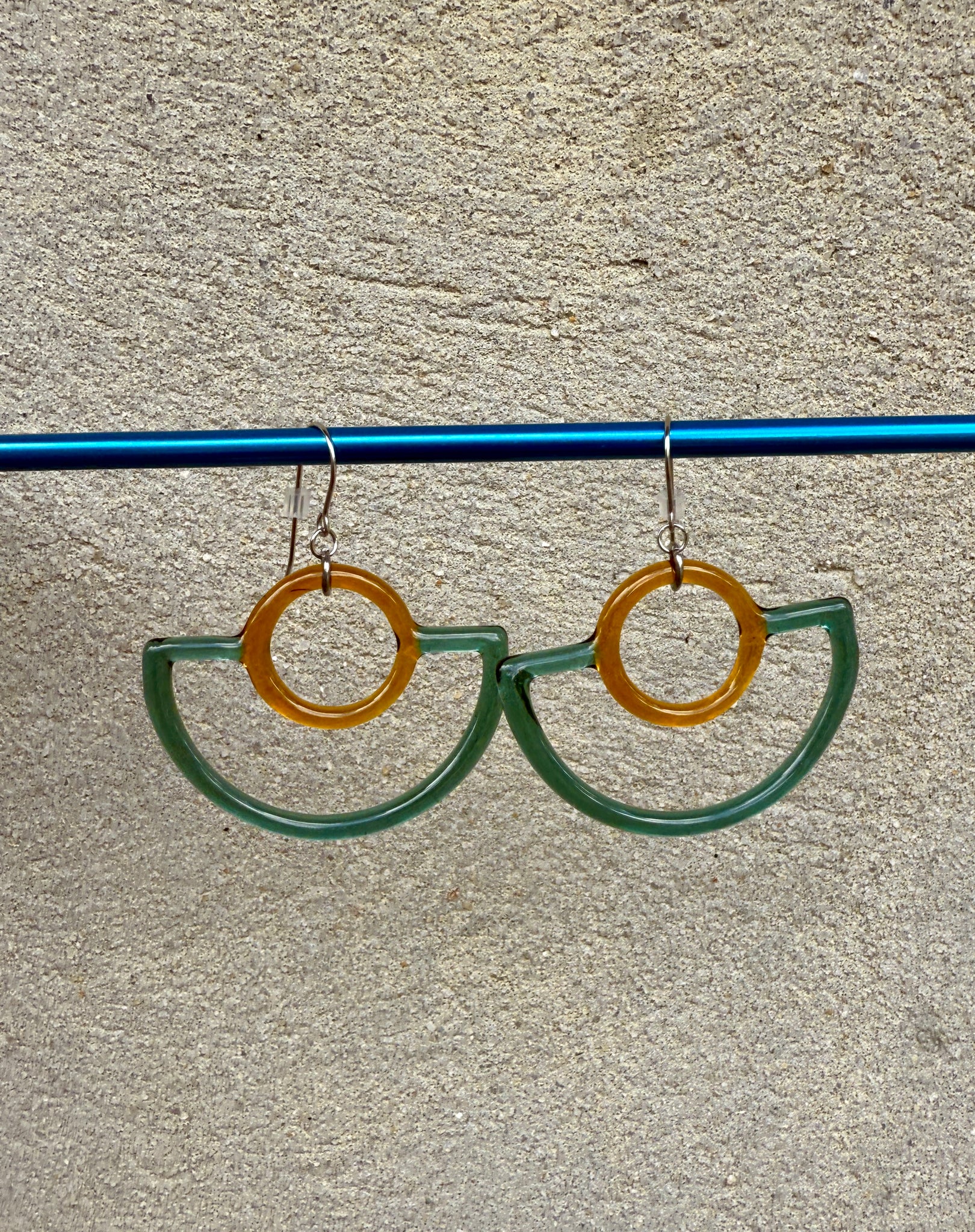 Jenna uses a type of glass called Borosilicate, which is often referred to as “hard glass.” It is a durable material that allows her to create varying sizes of work that remain lightweight and wearable.
