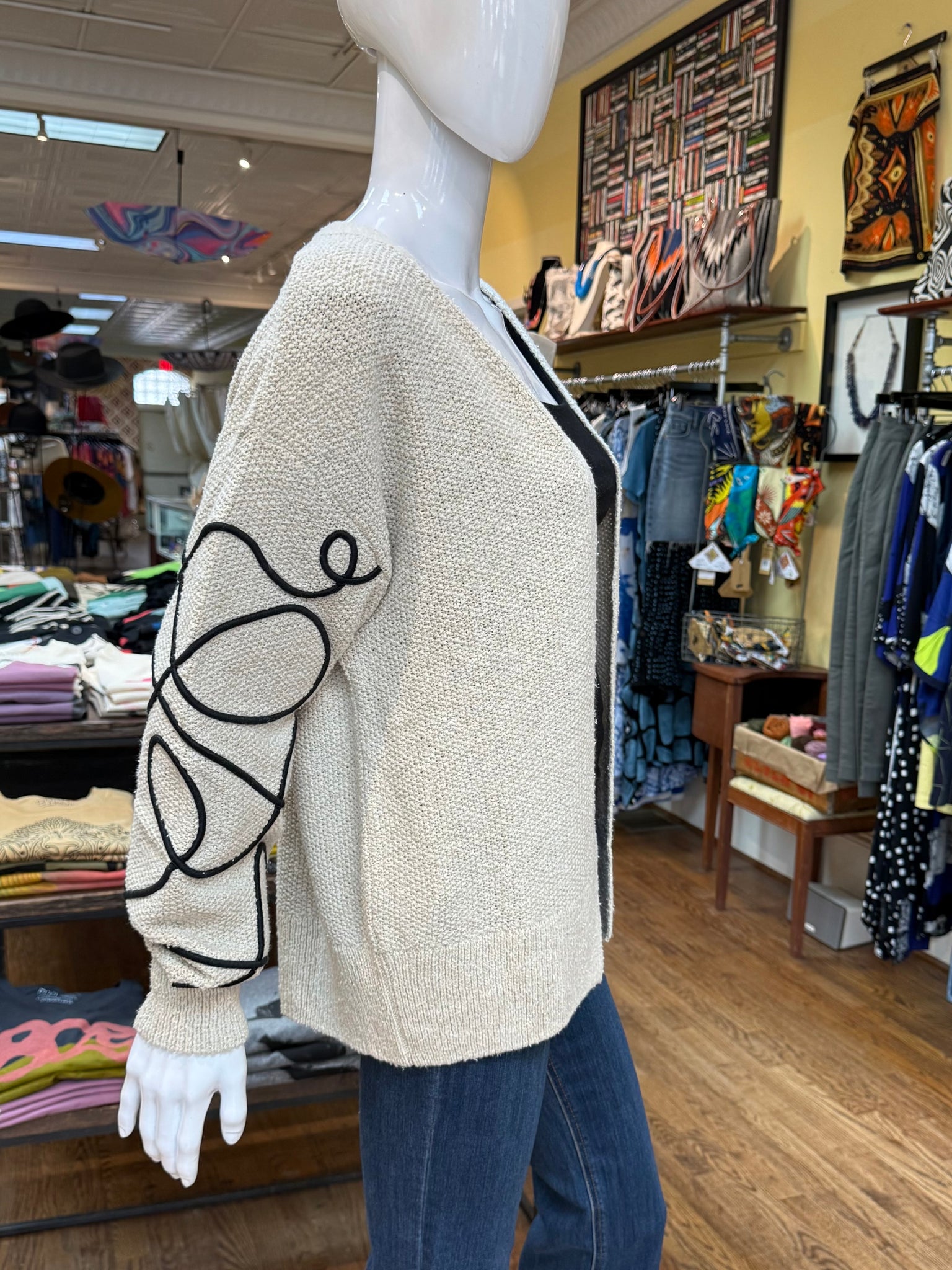 A very cool cardigan in a loose knit oatmeal color and awesome elevated black stitch detailing on the puffed sleeves.