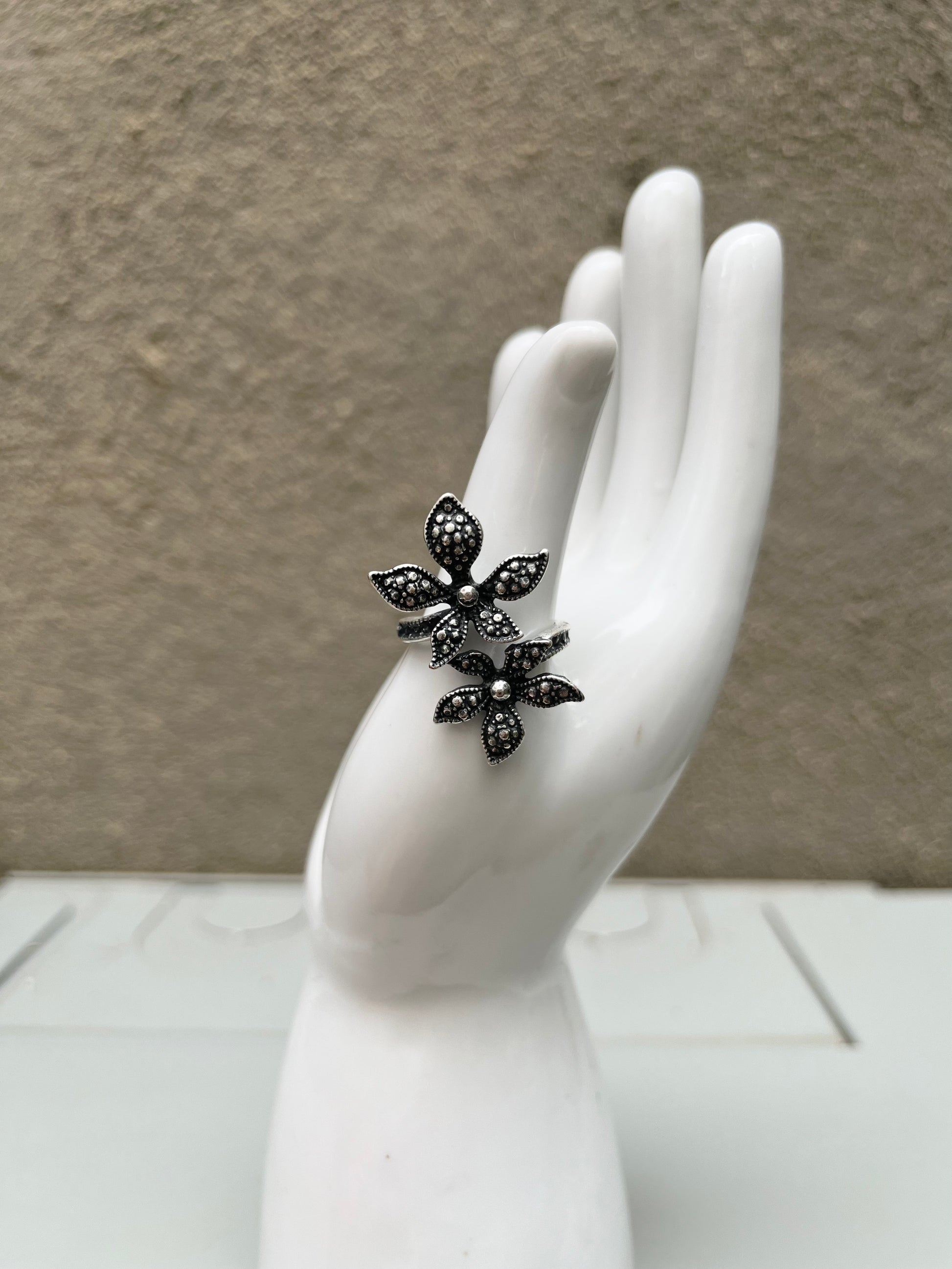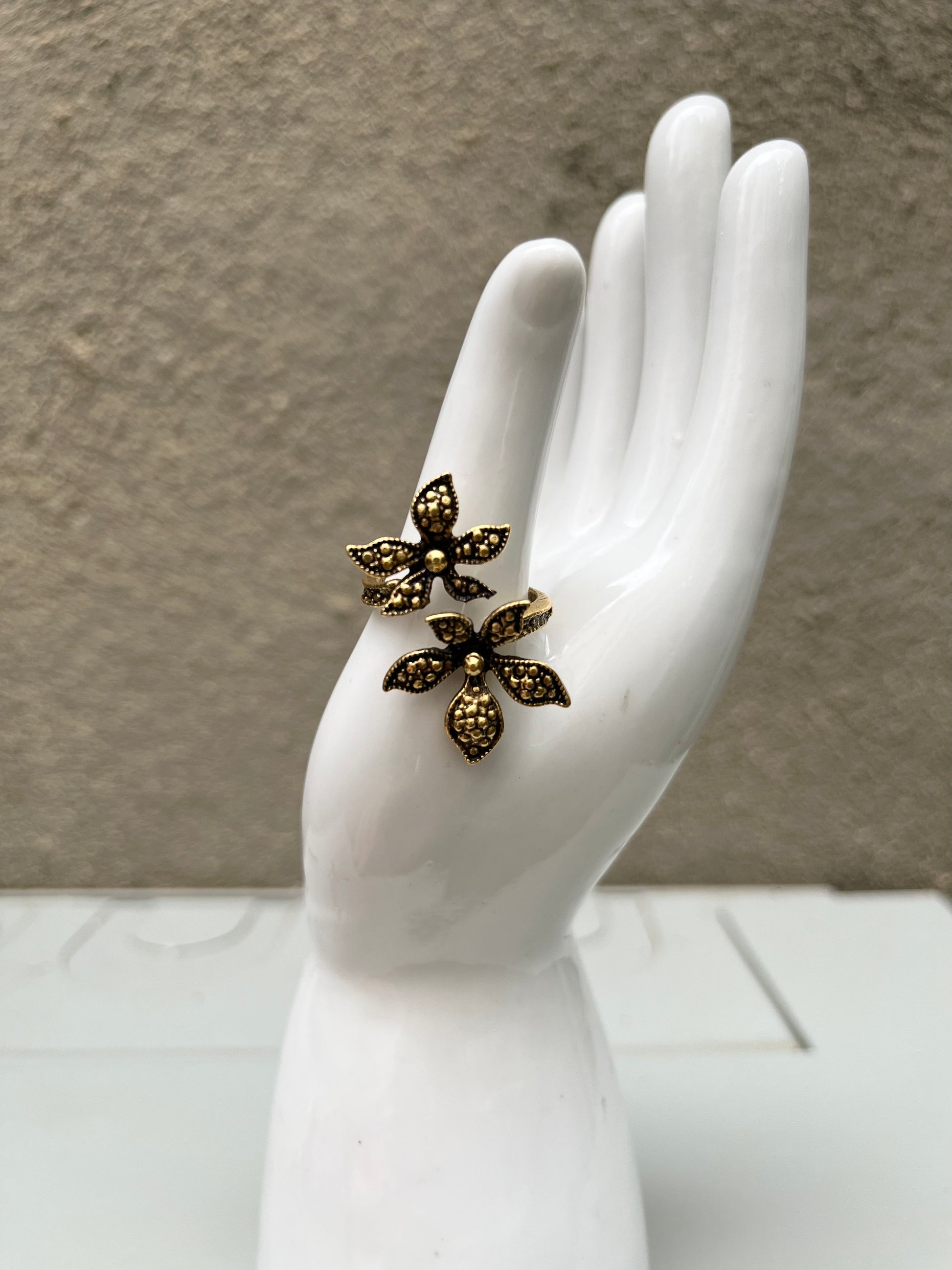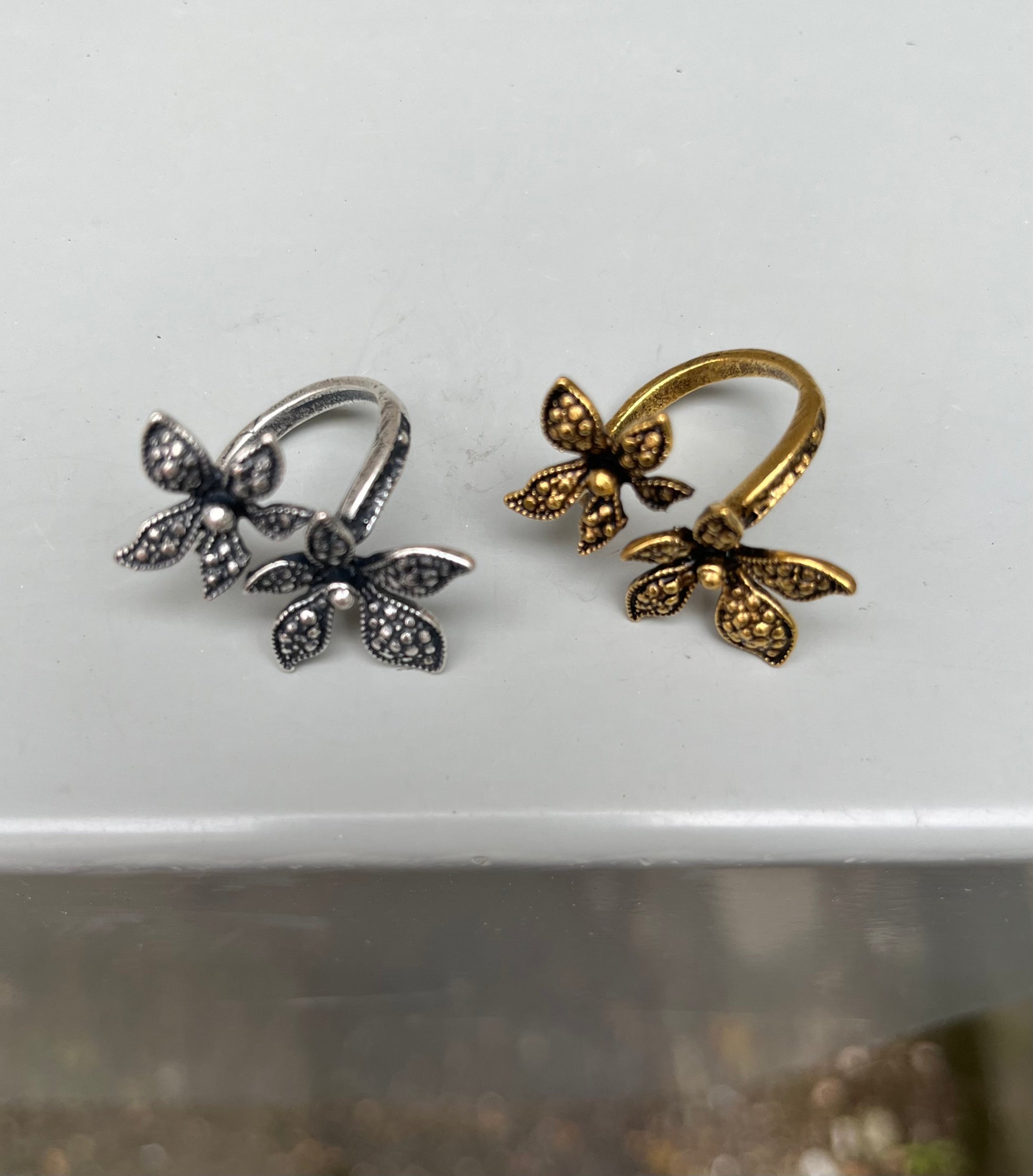Really pretty lilyesque flowers portrayed on an adjustable bypass band. Easy to wear, just watch your knits.