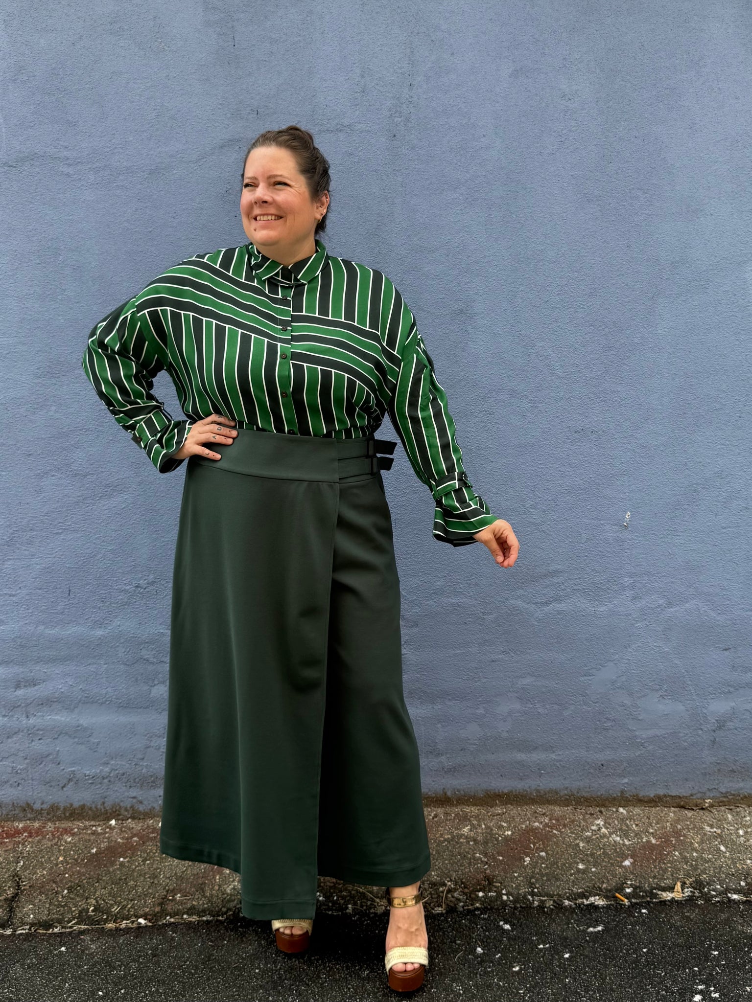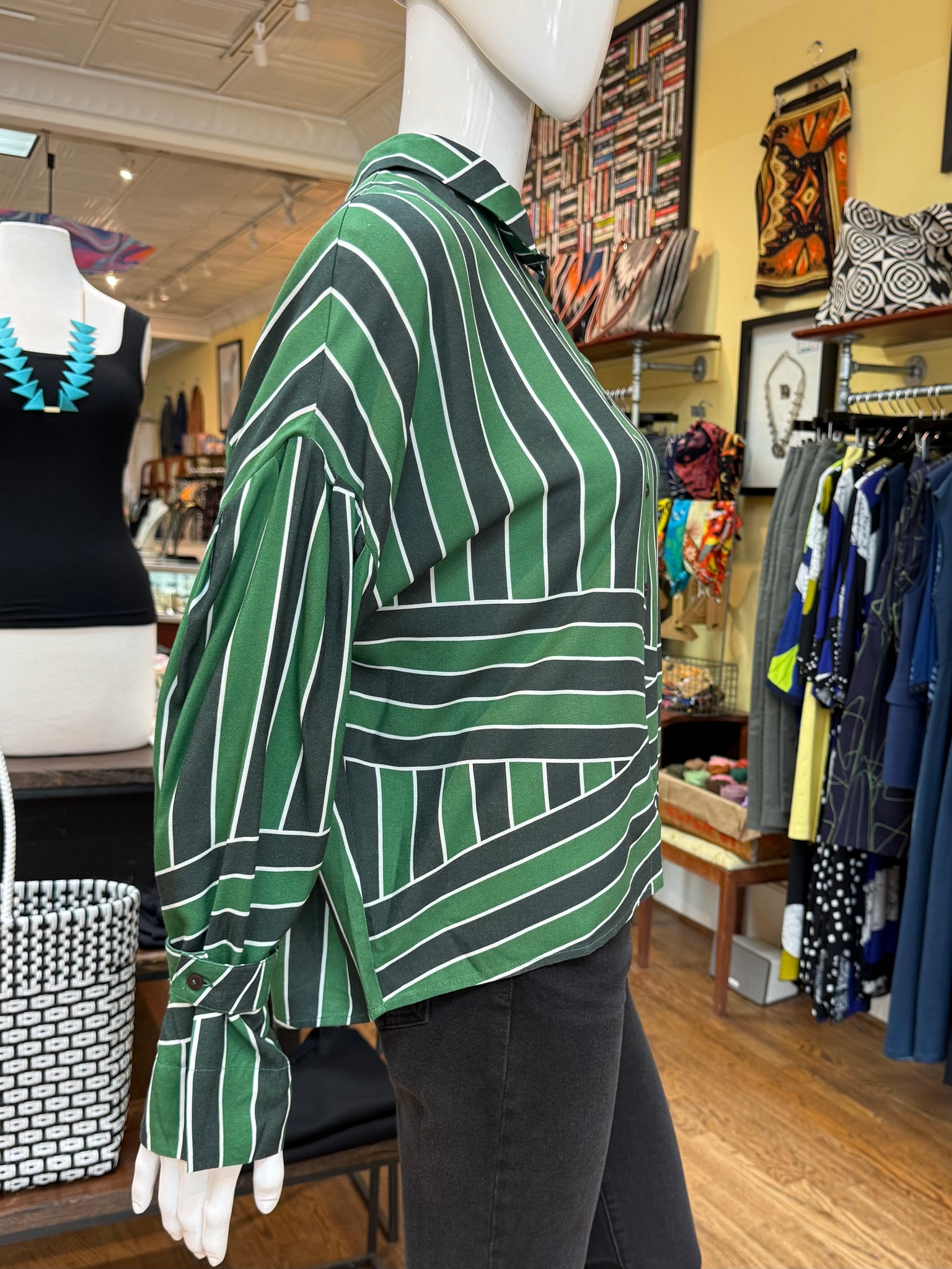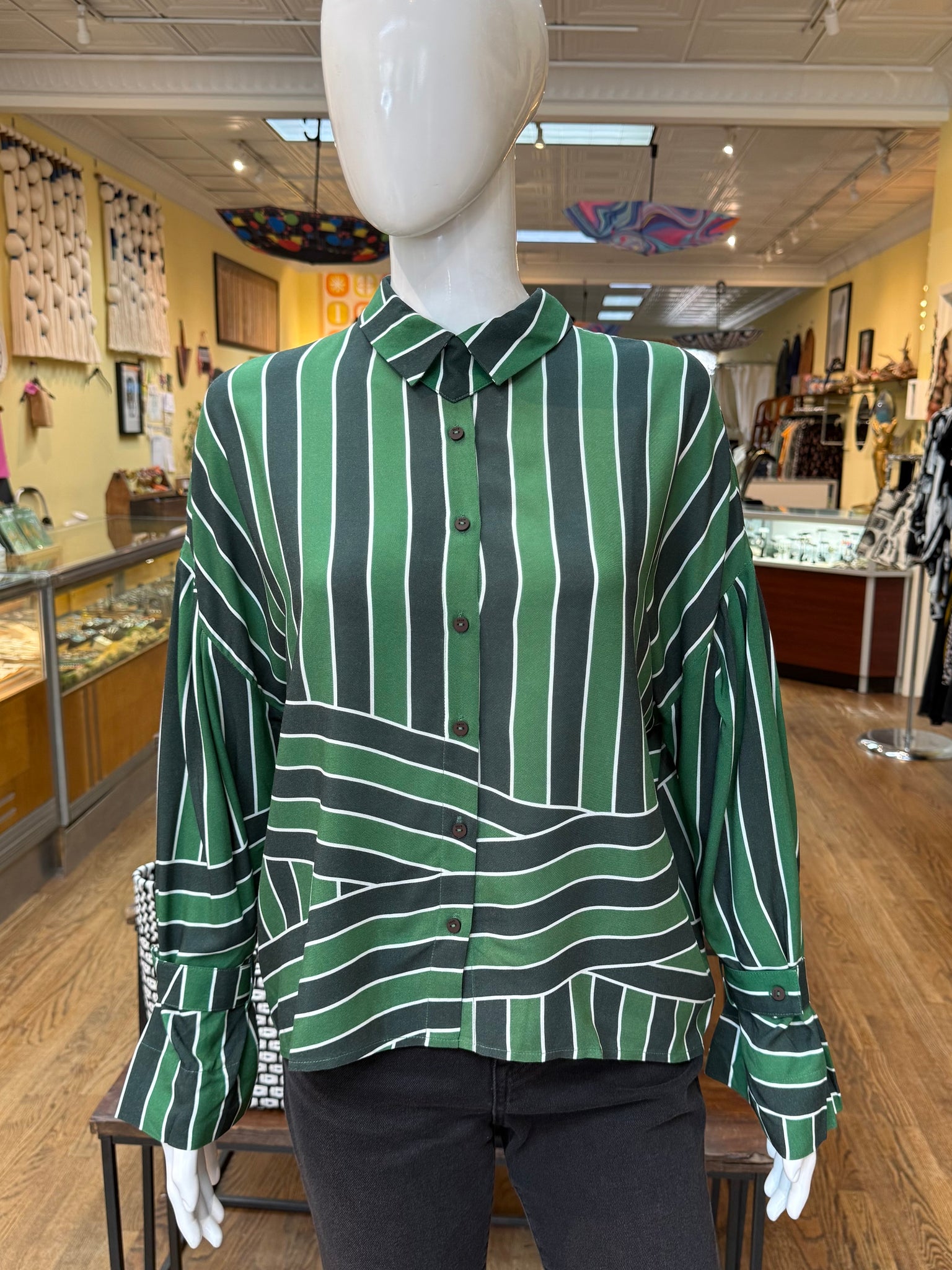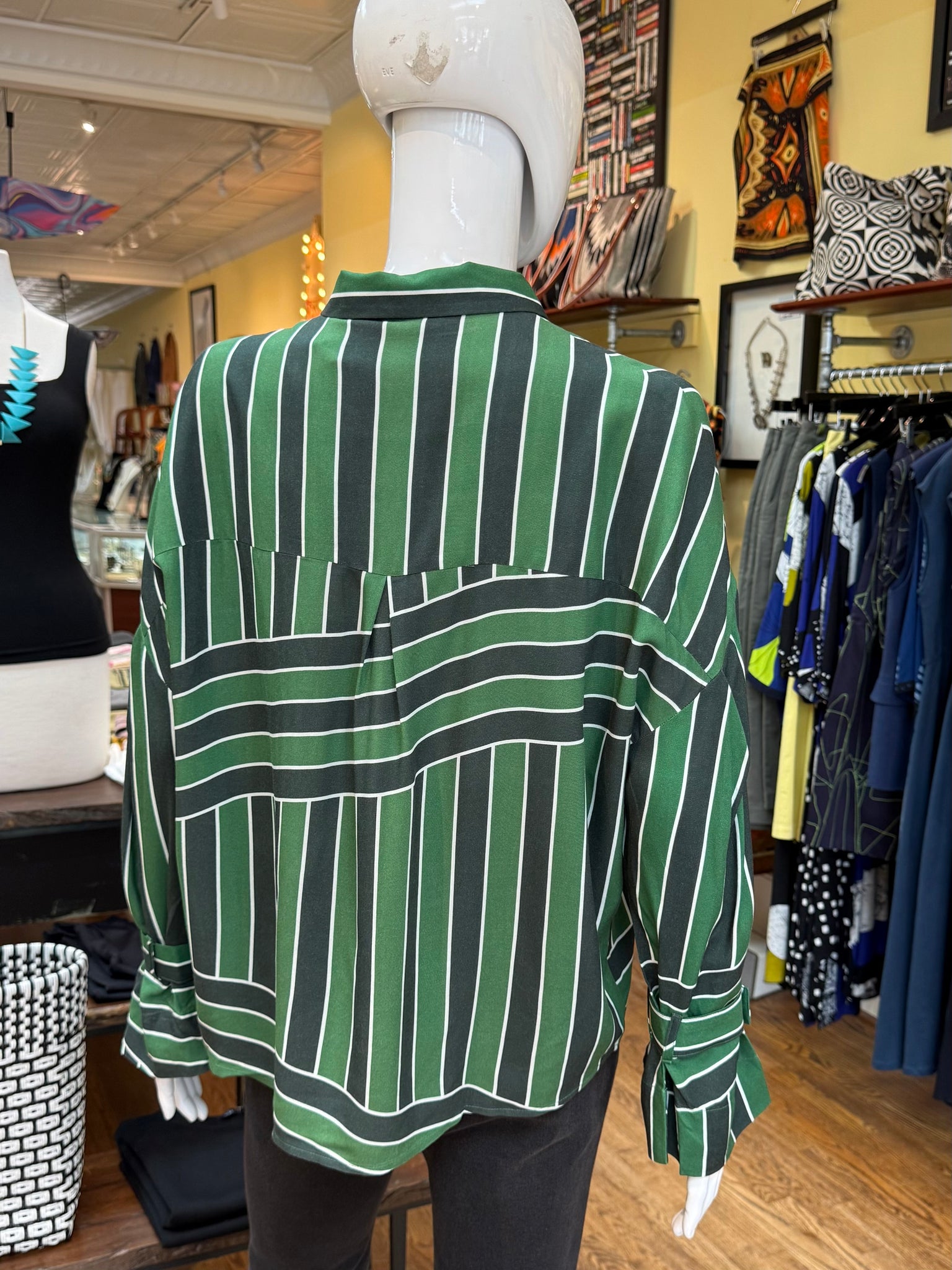 A wonderful blouse for in and out of work with plenty of great details and a very easy relaxed fit. This shirt is designed with a removable fabric detail under the collar that is a great touch. Also the cuffs have an optional fabric button detail that gives the arms just a little different look. Fun piece!