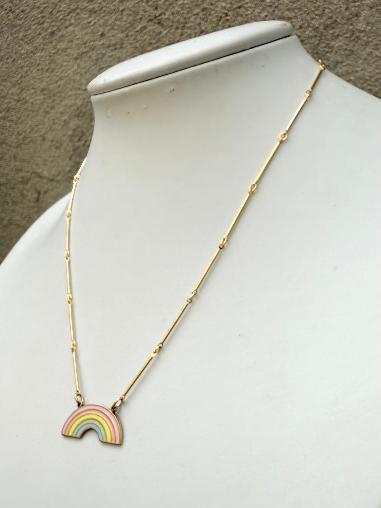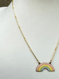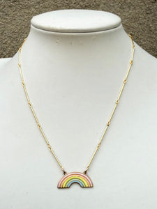 Hand painted pastel rainbow on a bright gold bar chain.